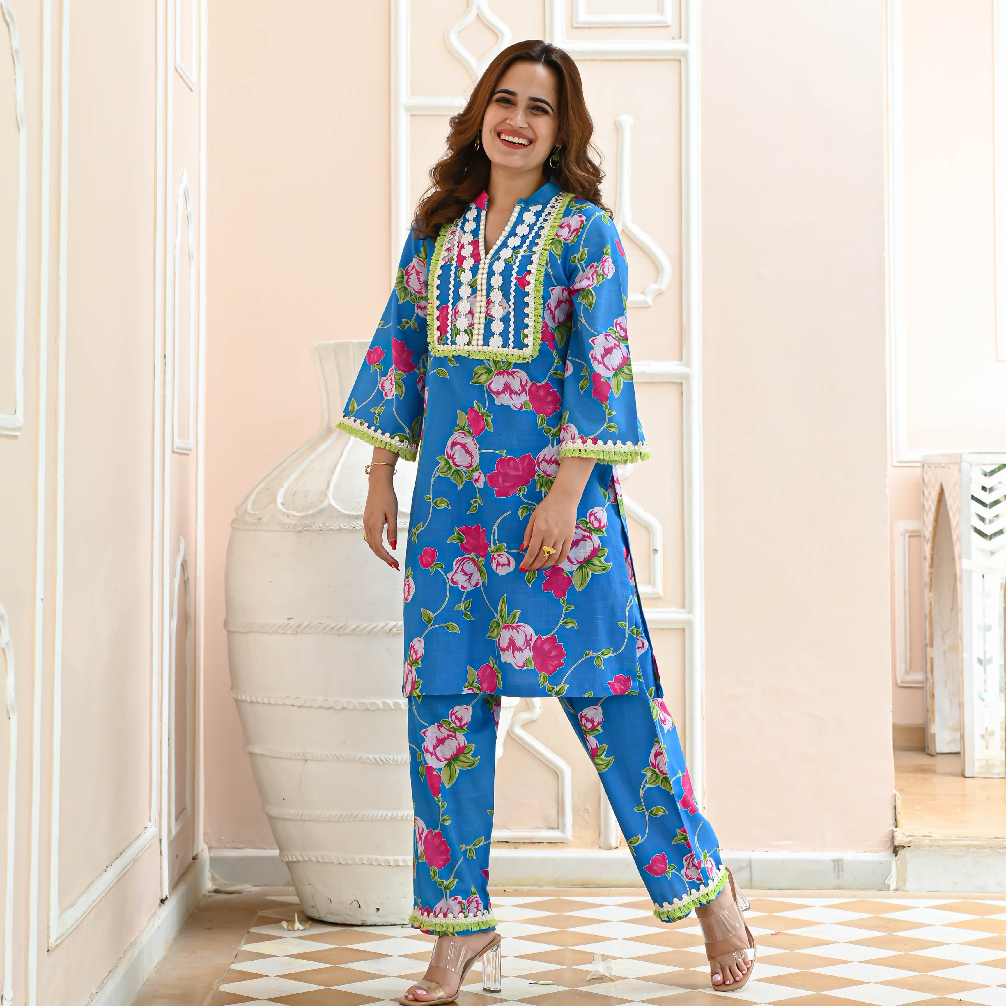 Discover the epitome of comfort and style with the Aarini Cotton Co-ord Set. Made from luxurious blue cotton slub fabric, this ensemble offers a delightful tactile experience. The intricate rose floral print adds a touch of timeless beauty, making it a fashion statement that effortlessly captures both sophistication and comfort.