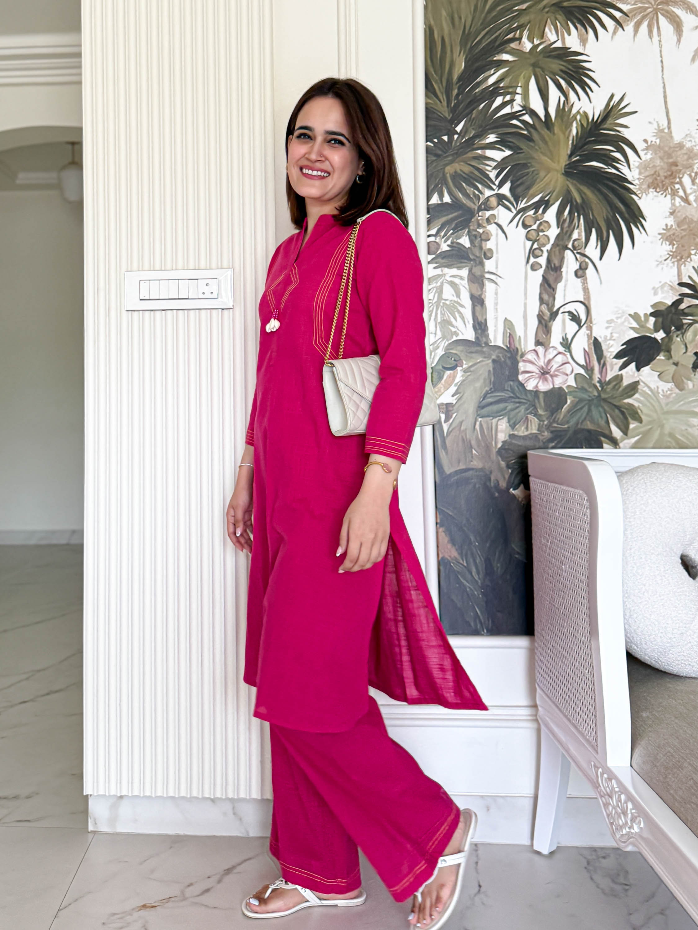 Make a vibrant statement with the Bunaai Blush Beat Co-ord Set in bright pink cotton. This straight-fit kurta features a mandarin collar, three-quarter sleeves, and a front placket adorned with delicate shell embellishments. Paired with matching pants, this playful yet polished set adds a pop of personality and effortless charm to your everyday or festive wardrobe.