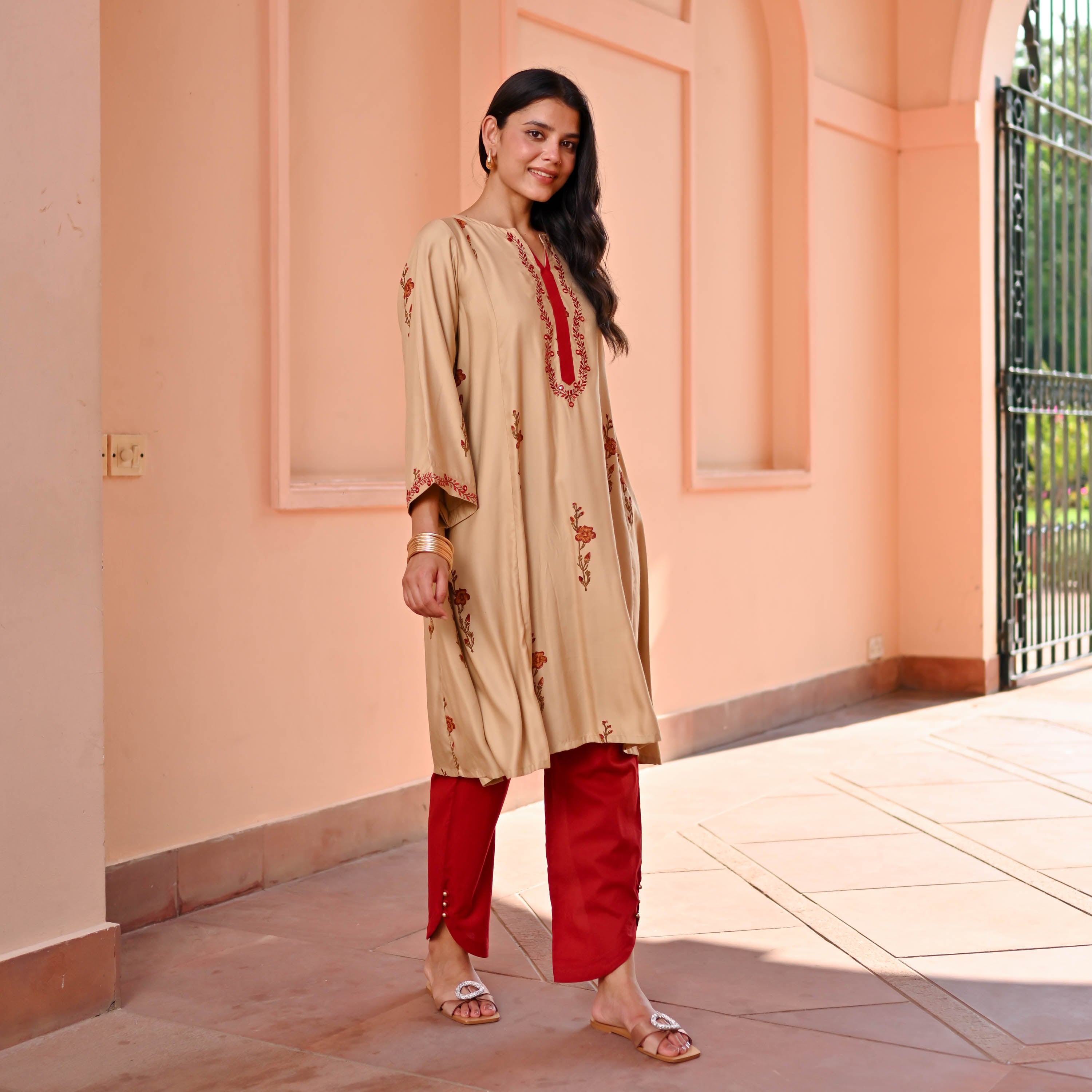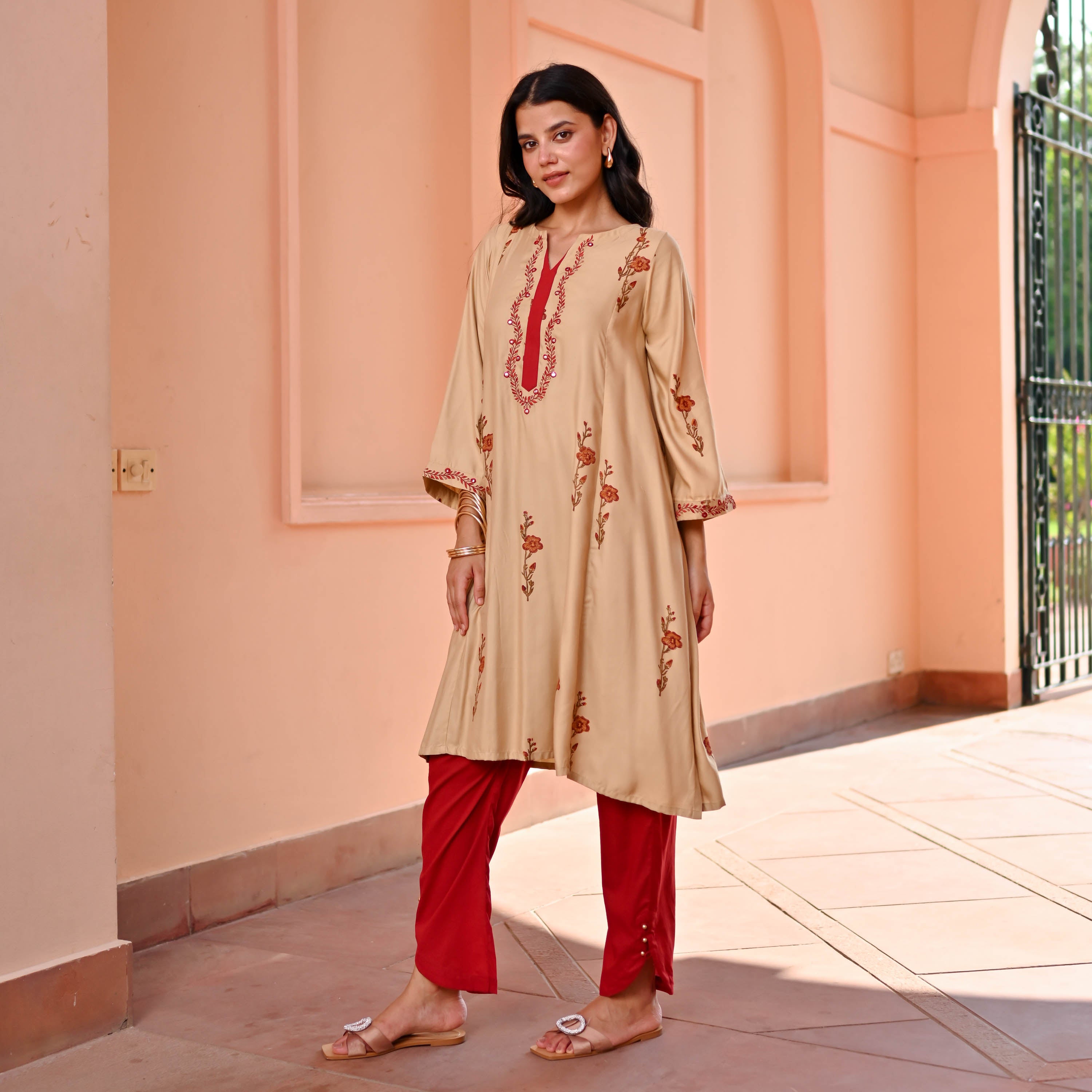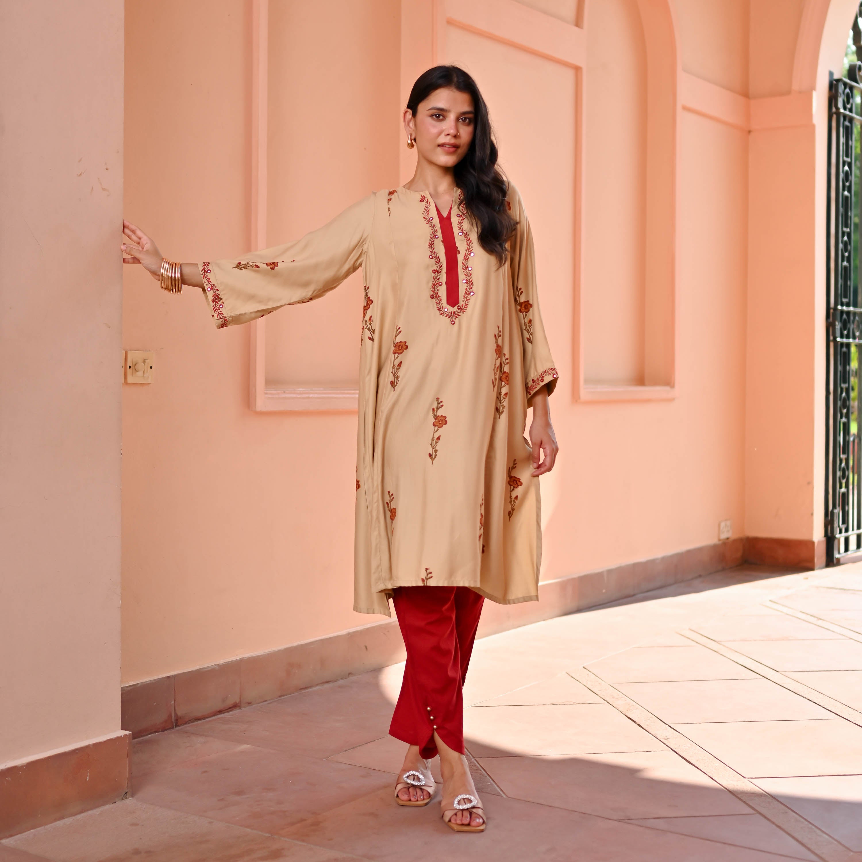 Introducing the Lily Kurta Set, where comfort meets flair in luxurious Modal Satin. This beige A-line kurta features elegant ethnic motif embroidery, a round neck with a notch, and a striking red panel placket for a pop of color. With three-quarter sleeves and paired with bold red tulip pants, this set promises effortless charm with a dash of playful sophistication.