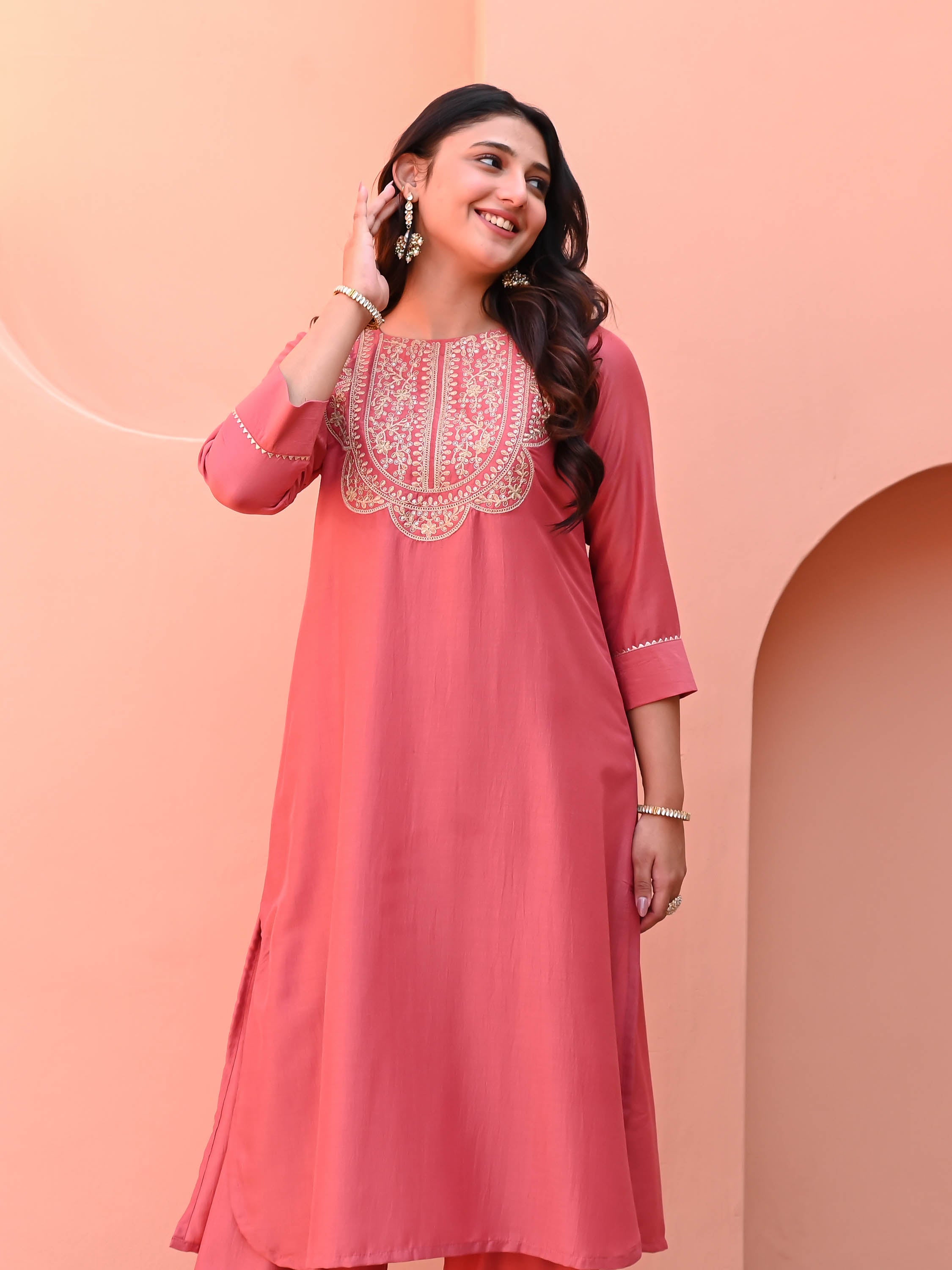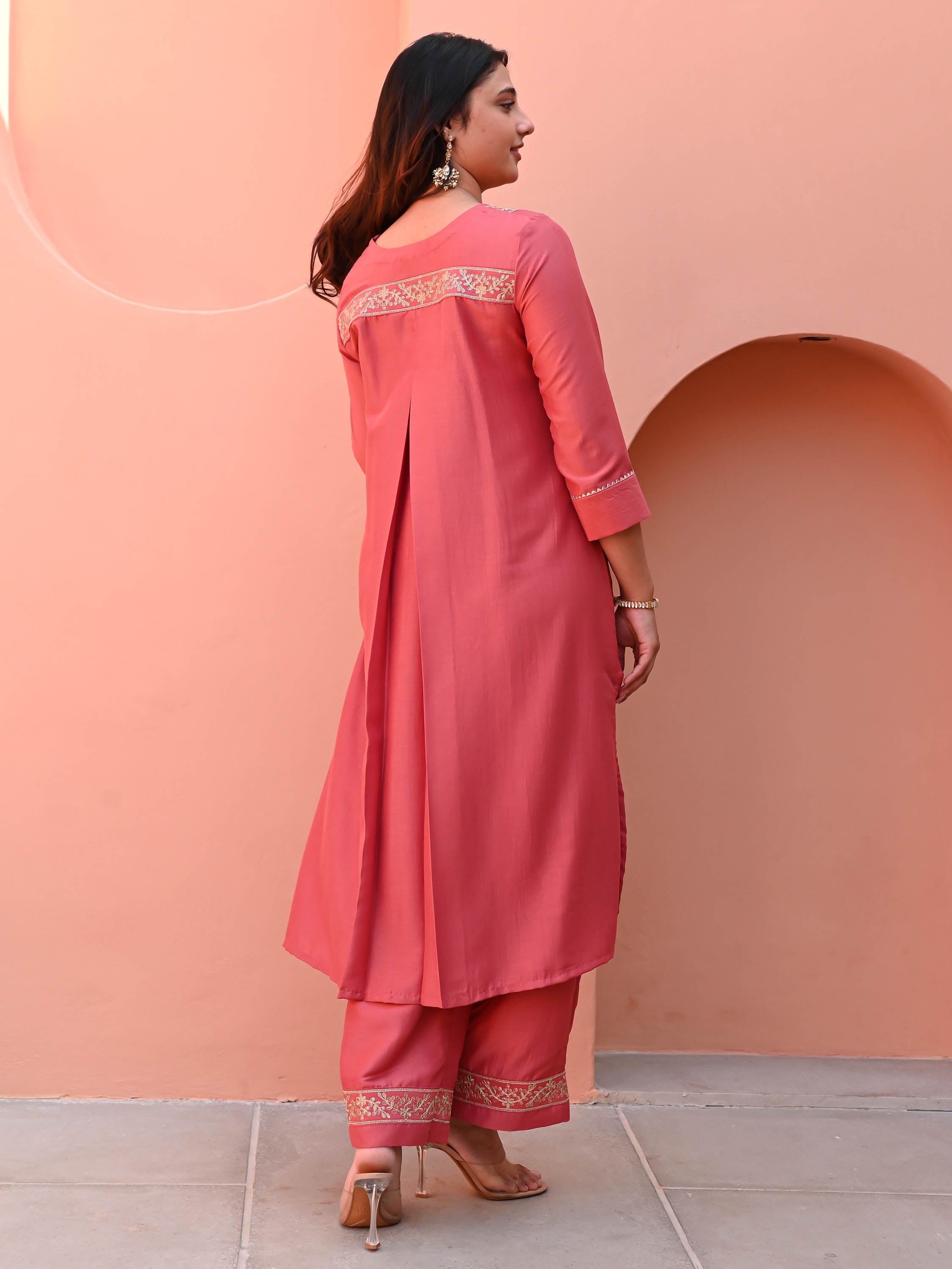 Add a pop of color with our Papaya Punch Silk Kurta Set. Crafted from coral chinon silk, this relaxed-fit kurta features a round neckline adorned with delicate embroidery on the yoke. Box pleats at the back add a touch of structure, while the three-quarter sleeves and matching pants create a harmonious, effortlessly chic look, perfect for any occasion.