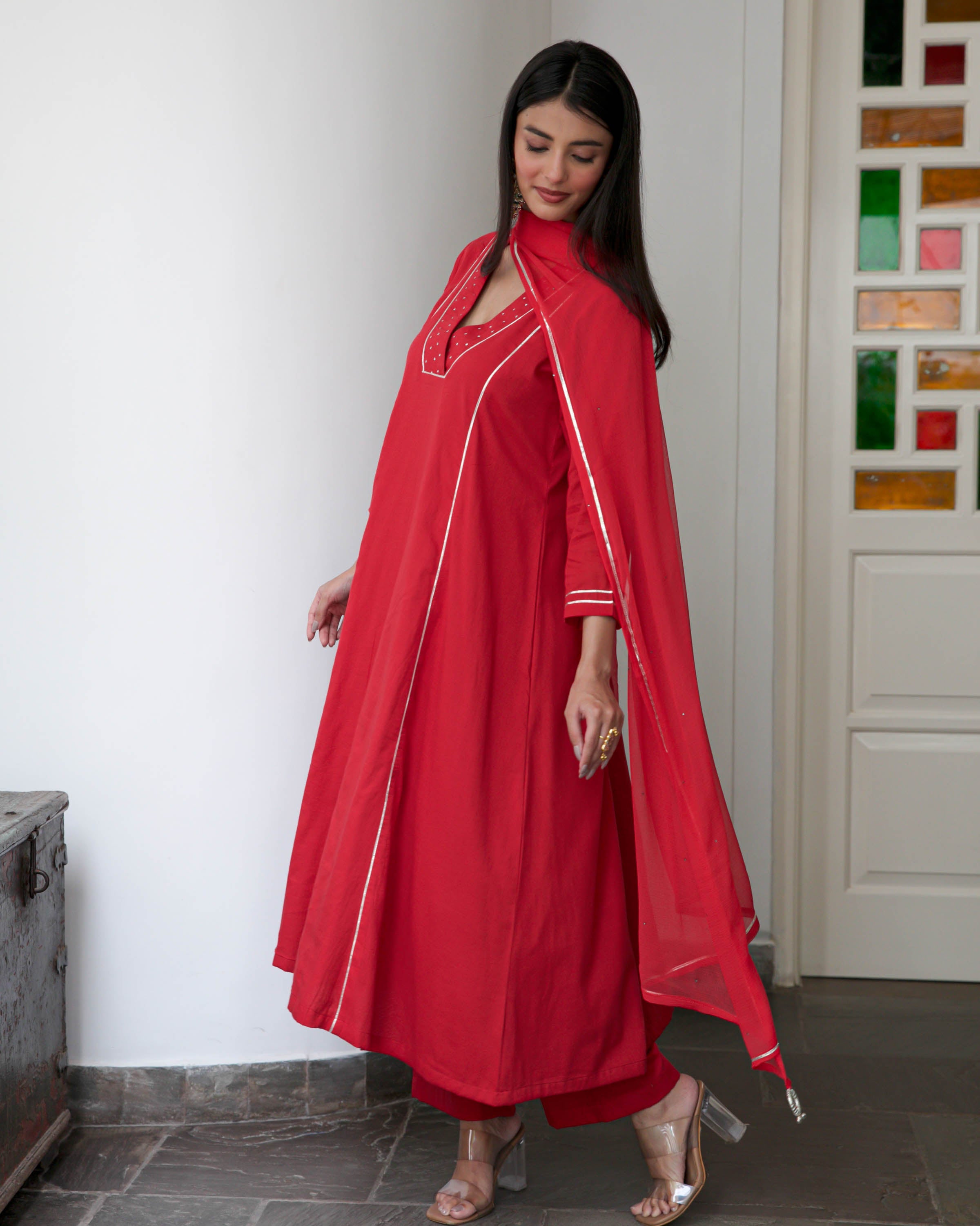 Make a bold statement with the Red Cotton Suit Set. Crafted in vibrant red cotton, this A-line kurta features a flattering V-neck and three-quarter sleeves for a classic silhouette. Paired with matching pants and a coordinating dupatta, it’s perfect for festive occasions, casual outings, and traditional celebrations, offering both comfort and timeless elegance.