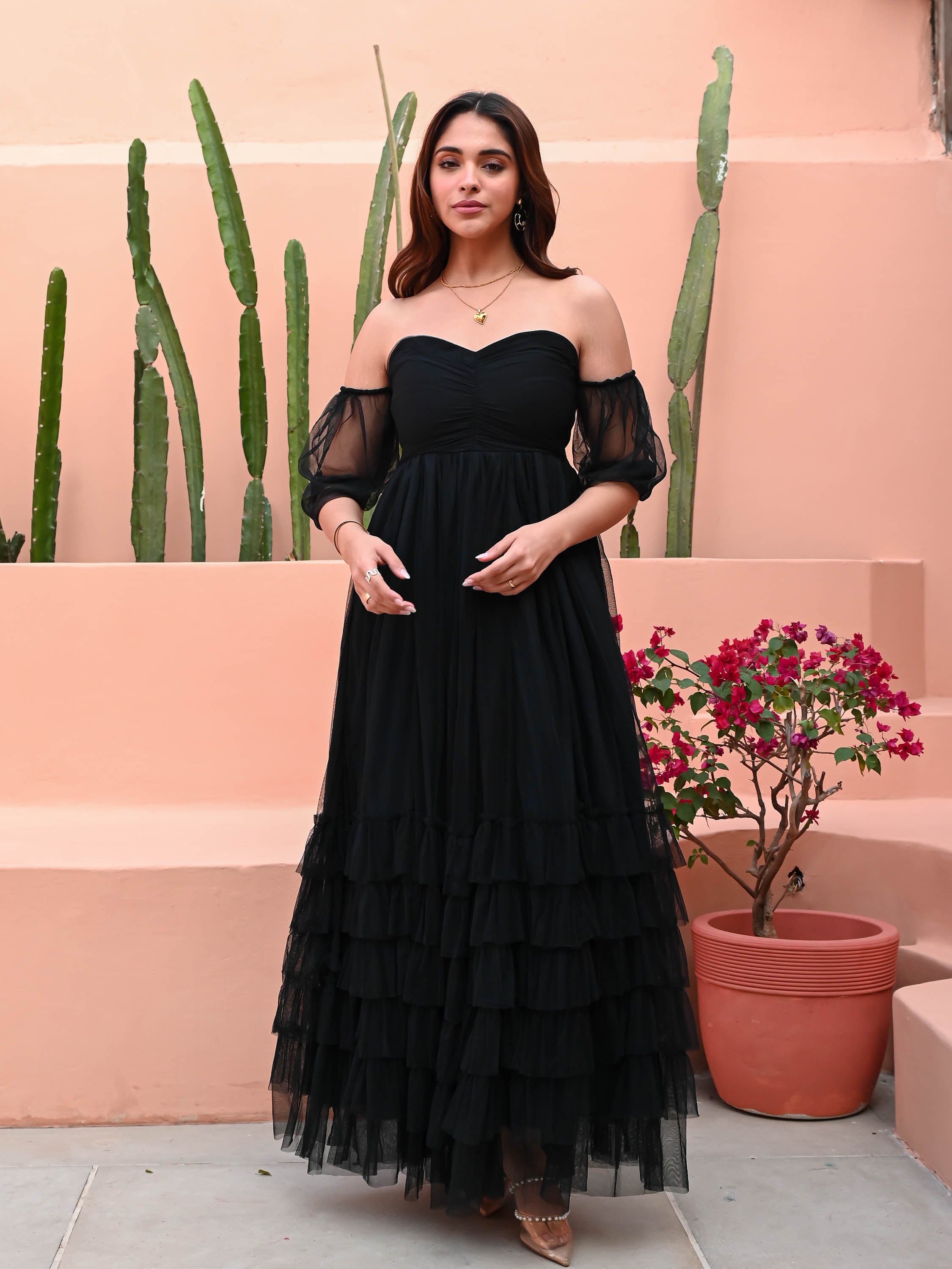 Turn heads in our Jet Black Neck Dress, crafted from elegant black net fabric. Featuring a flattering sweetheart neckline and chic off-shoulder puffed sleeves, this dress exudes timeless charm. The flared maxi skirt adds a touch of drama, making it perfect for evening soirees or special occasions. Effortlessly stylish, it's the statement piece your wardrobe needs.