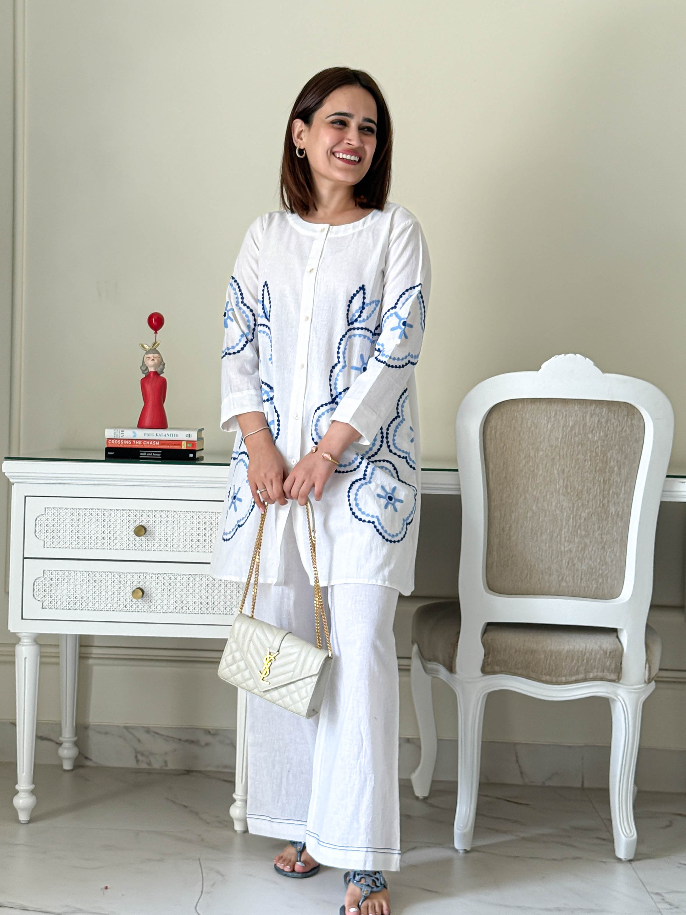 Embrace easy elegance with the Bunaai Power Pause Co-ord Set in pristine white cotton. The sleeveless short kurta features a round neck, front placket, and delicate threadwork embroidery, exuding timeless charm. Paired with solid white pants, this set is perfect for serene summer days, offering a clean, graceful look that feels both minimal and elevated.