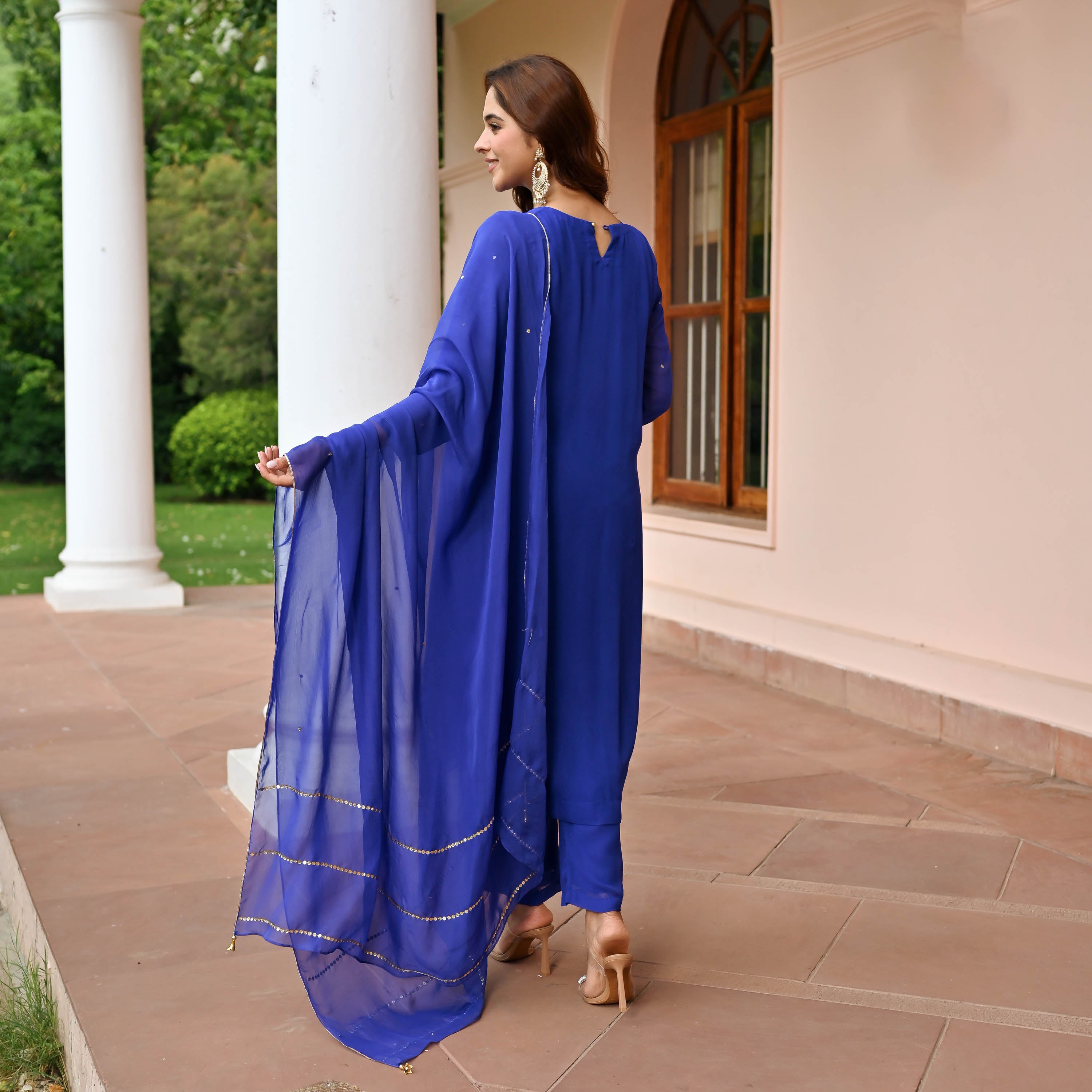 Elevate your style with the Blue Bliss Georgette Suit Set. This stunning set showcases a rich electric blue hue on luxurious georgette fabric. The straight kurta features a high round neck, three-quarter sleeves, and intricate placement embellishments, with a wavy sequin design on the side. Paired with matching pants and a dupatta adorned with sequins, it’s perfect for any festive occasion.