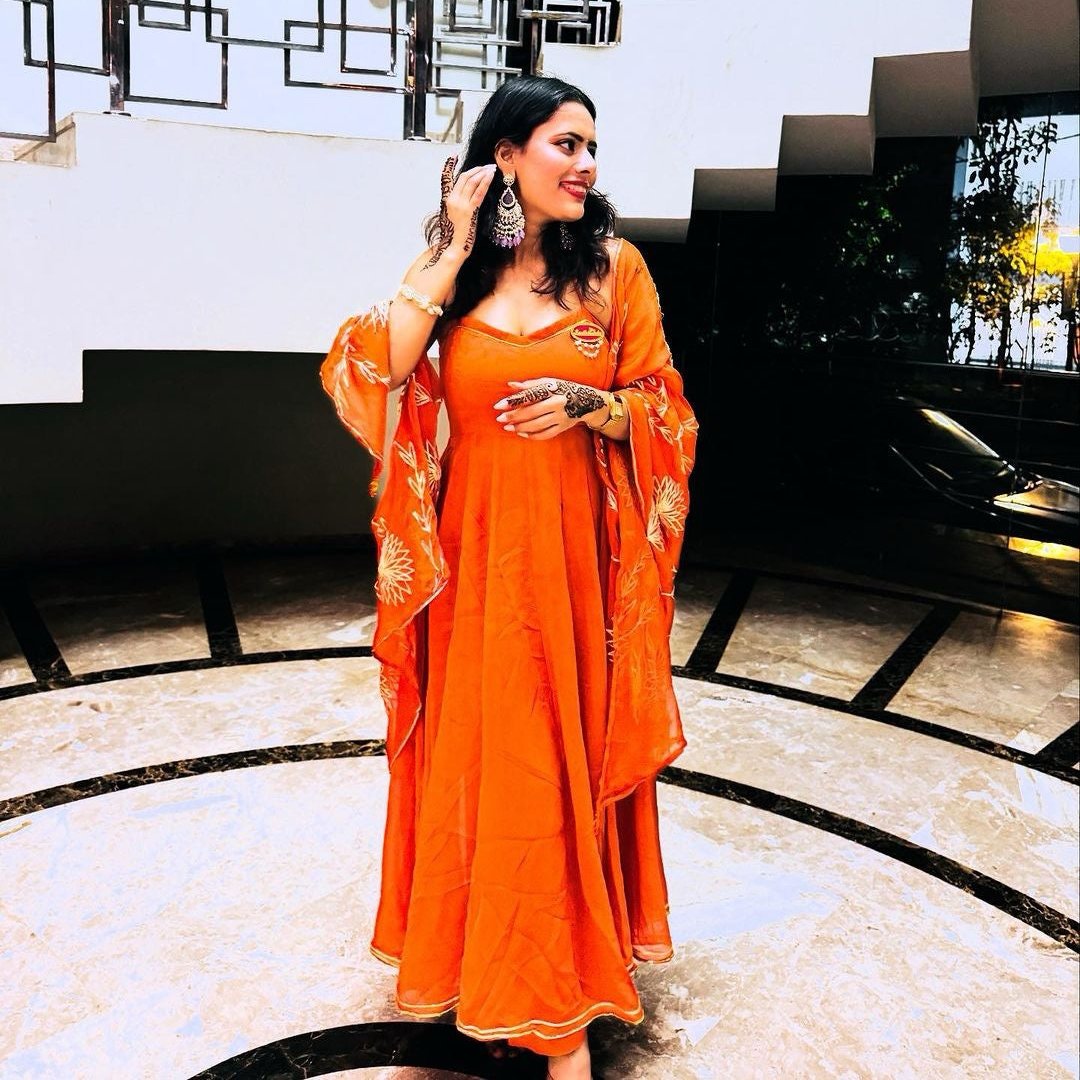 The Nandini Georgette Suit Set dazzles in a vibrant orange hue, made from plush georgette fabric. Featuring a flared Anarkali-style kurta with a unique sweetheart halter neck, this ensemble exudes modern elegance. Paired with matching pants and a heavily gota-embroidered dupatta, it's a statement piece perfect for adding flair to any festive or special occasion.
