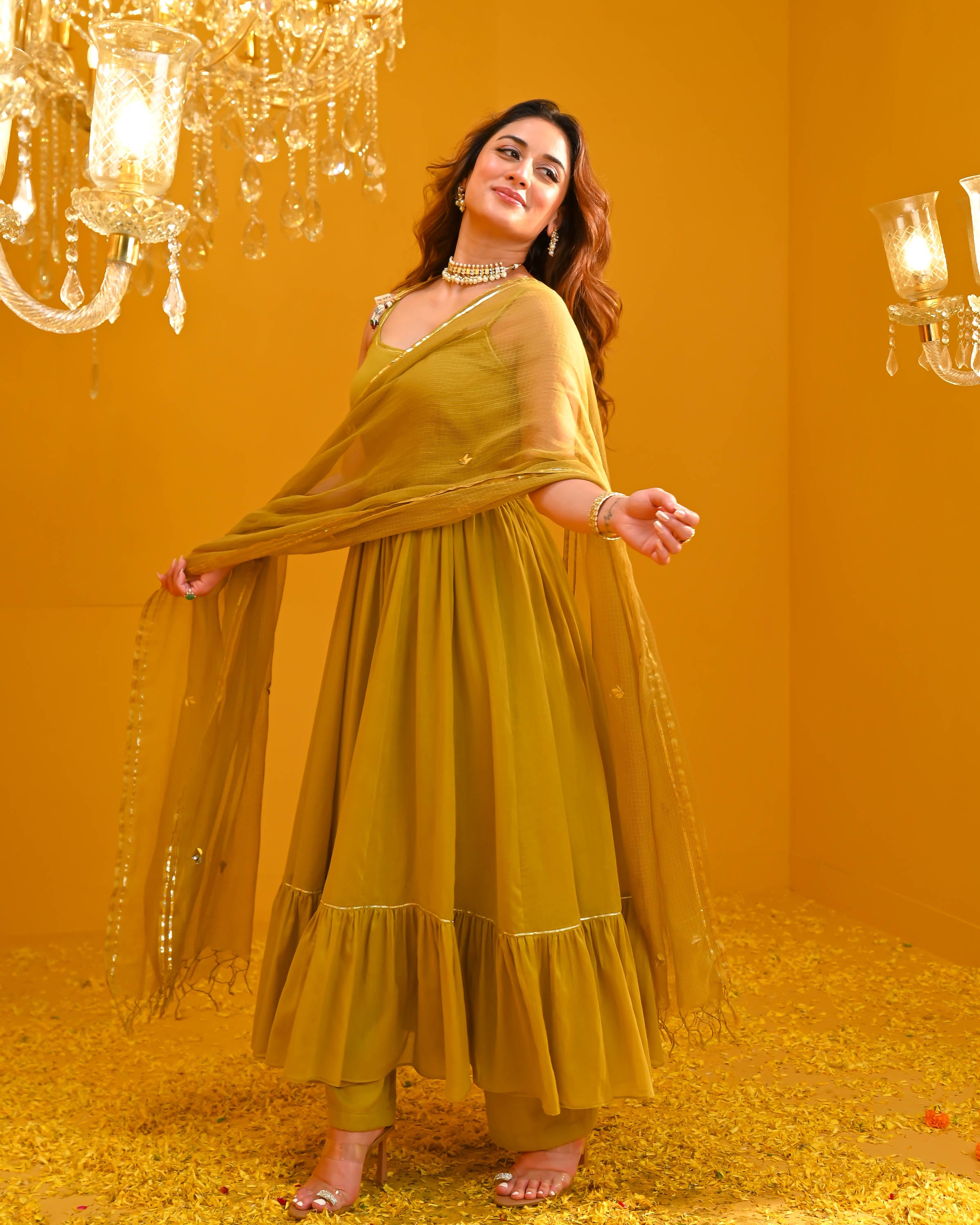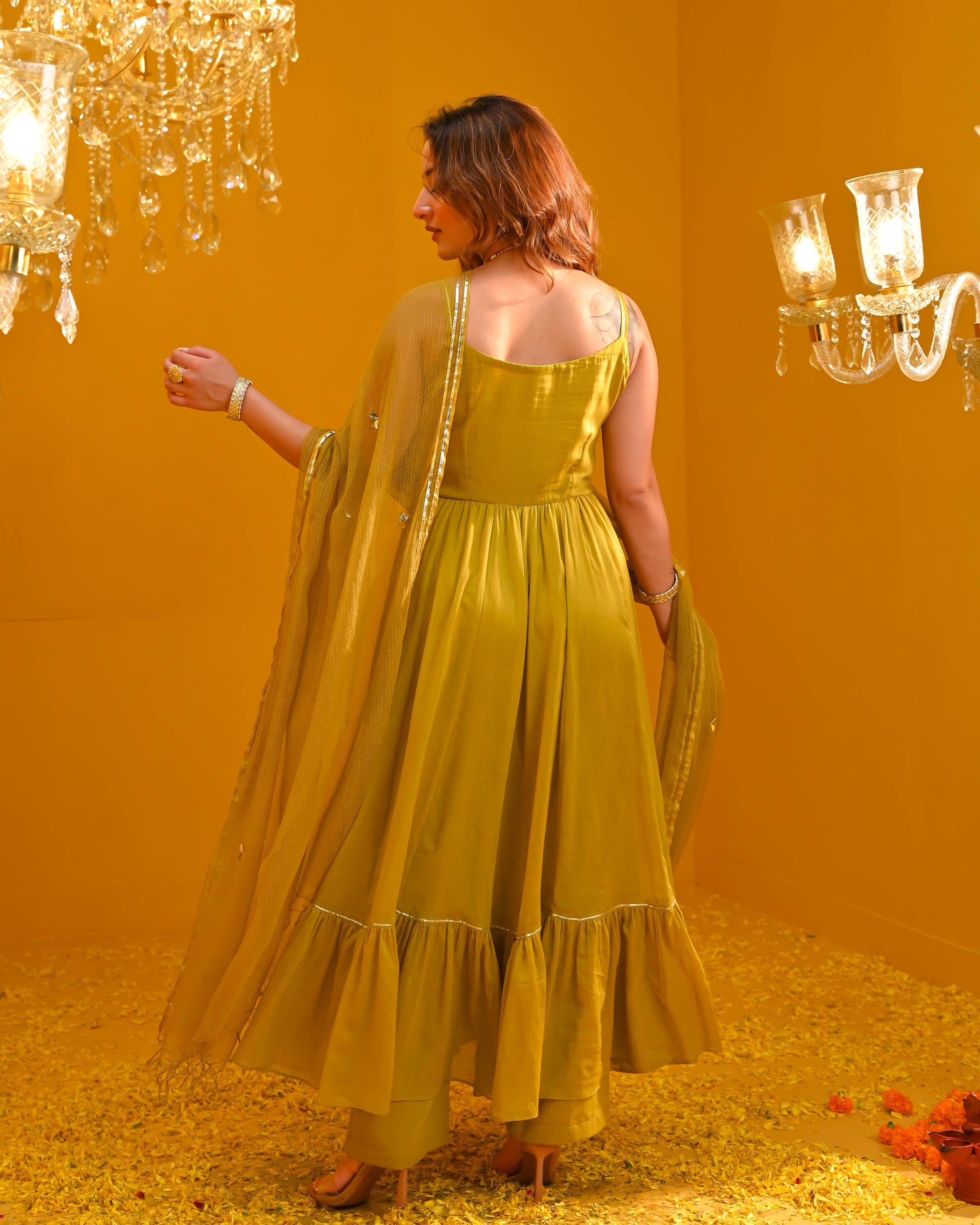 Tara Cotton Suit Set brings a fresh vibe in an elegant olive hue. Crafted from plush cotton, this flared Anarkali-style strappy kurta features a round neck adorned with delicate gota lace. Paired with matching pants, the look is beautifully completed by an embellished Kota Doriya dupatta, making it a perfect choice for daytime gatherings and festive celebrations.