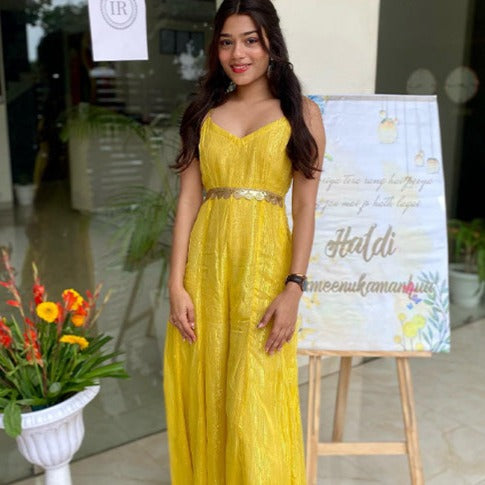 Get ready to be the centre of attention with our stunning Yellow Lurex Jumpsuit. This piece is the perfect mix of fun and glam, with its shimmering fabric and gold sequin details that add a touch of sparkle to your look. The strappy sleeves not only keep you cool but also add a touch of elegance to this already chic outfit. The gold sequin details at the waistline give you an enviable hourglass silhouette that will have you feeling like a Hollywood starlet. So, whether you're heading to a fancy dinner or a night out with the girls, this jumpsuit will have you feeling confident, sassy, and absolutely fabulous.