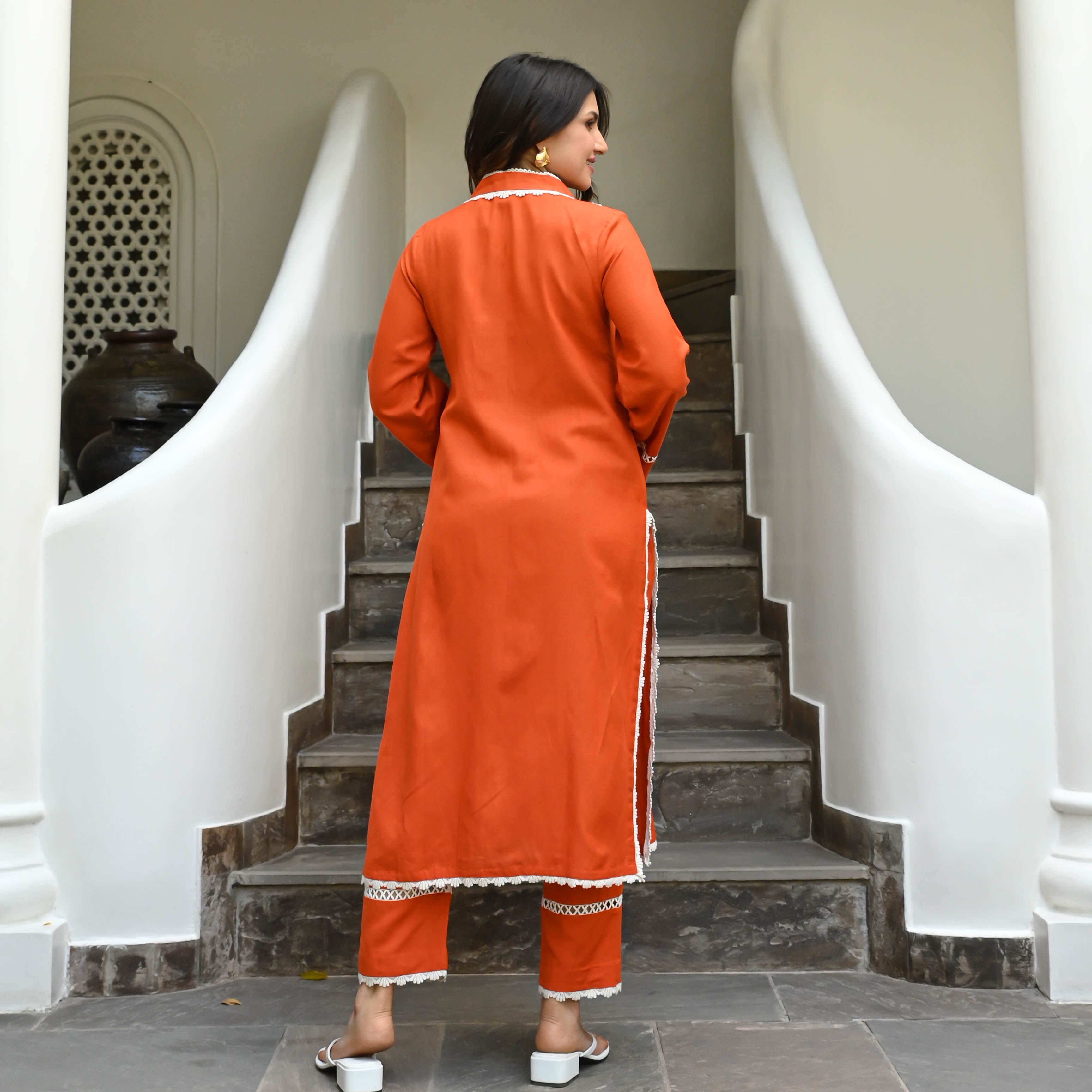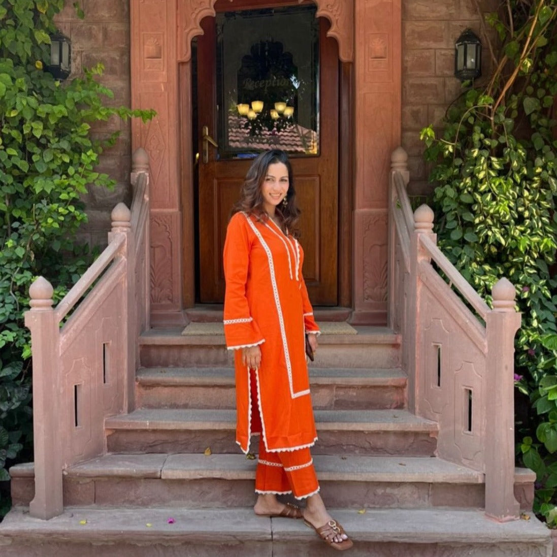 Indulge in the captivating charm of the Cotton Delight Co-ord Set, an exquisite ensemble that exudes grace and elegance. The beautiful orange hue is a burst of vibrancy, while the intricate lacework adds a touch of sophistication to the long kurta. With its V-neckline and flowing bell sleeves, this set effortlessly captures attention and showcases your impeccable style. Embrace the allure of lace and make a fashion statement that's truly unforgettable.