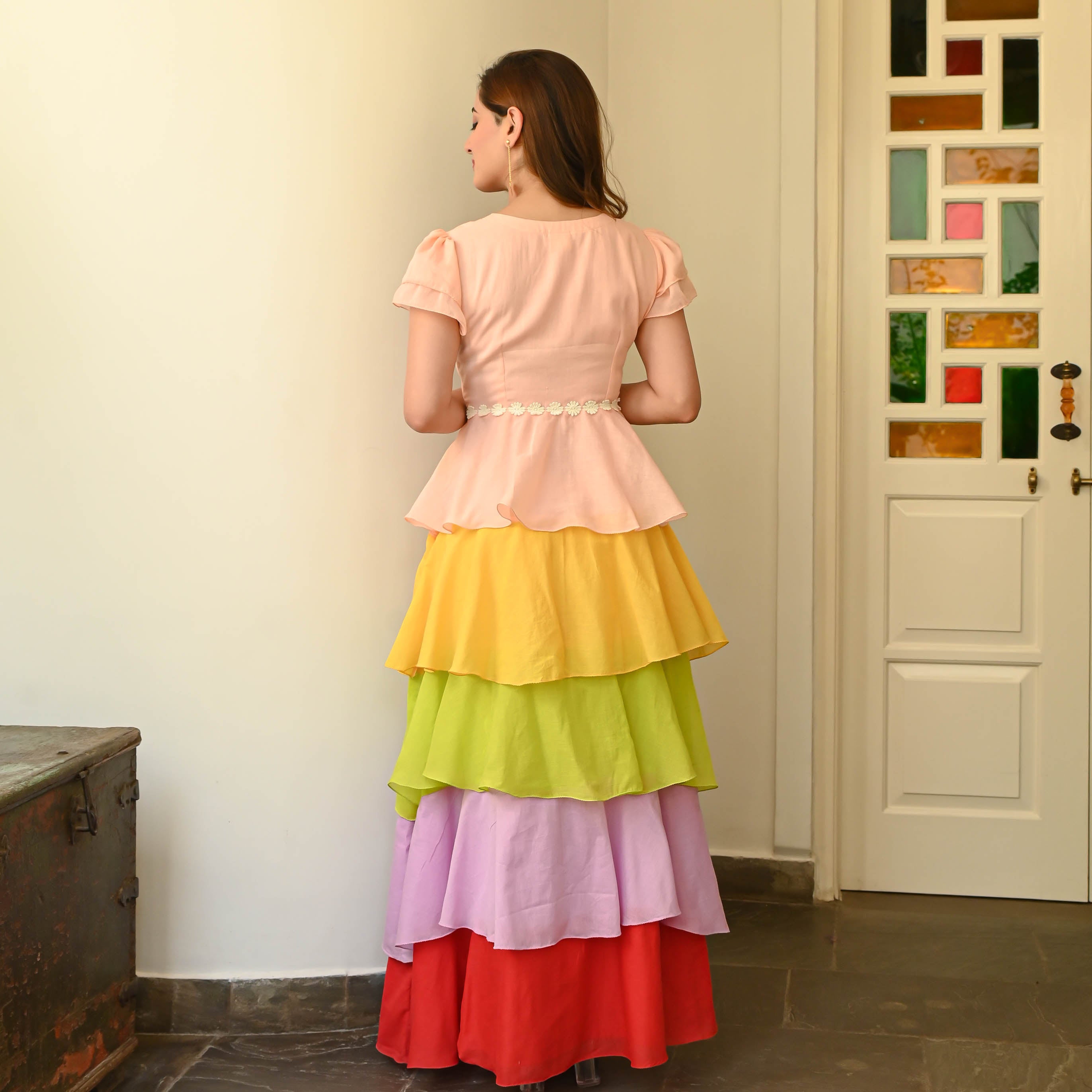Step into the enchanting world of the Sundress Cotton Tier Dress. With layered half sleeves and a squared neckline, it's the epitome of modern sophistication. The vibrant layers create a captivating and dimensional look, while the delicate white flower lace detailing adds a touch of femininity. Whether it's a casual event or a special occasion, this dress will make heads turn and highlight your impeccable style.