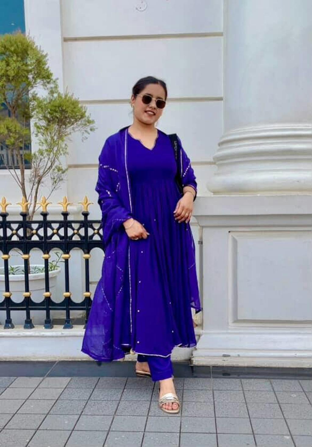 The Shreya Georgette Suit Set exudes sophistication in a rich navy hue. Crafted from plush georgette, the flared Anarkali-style kurta features a scalloped V-neck and intricately embellished flare for added elegance. Paired with matching pants, the ensemble is completed by an embellished dupatta, making it the perfect choice for festive gatherings or special occasions that call for a touch of glamour.