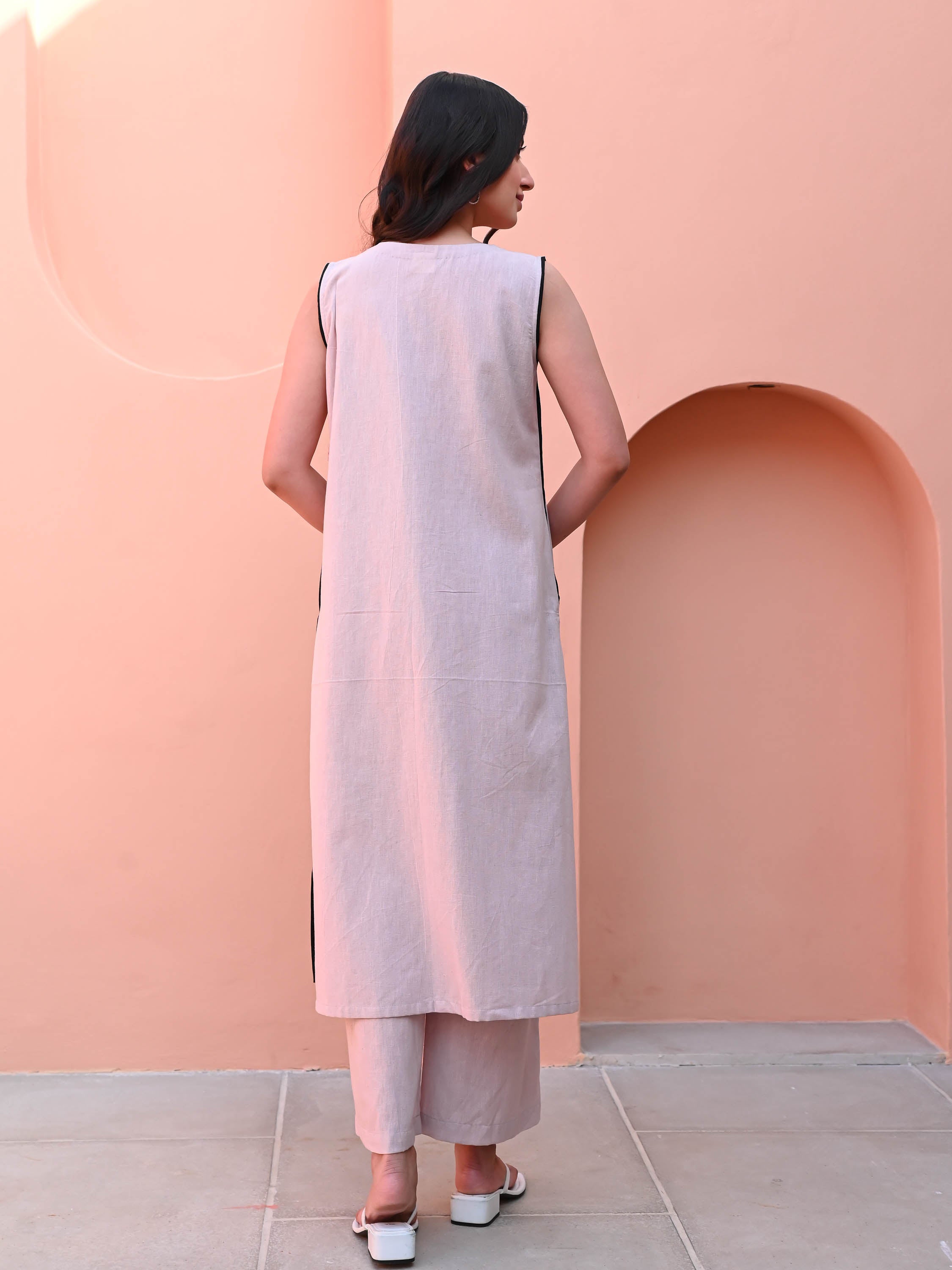 Elevate your everyday style with the Parfait Cotton Kurta Set, crafted from soft greyish beige cotton flex fabric. Featuring a flattering V-neckline, front and side slits, and delicate black lace accents, it’s finished with a chic black tassel on the front placket. Paired with matching pants, this set blends comfort and elegance effortlessly. Perfect for understated sophistication.