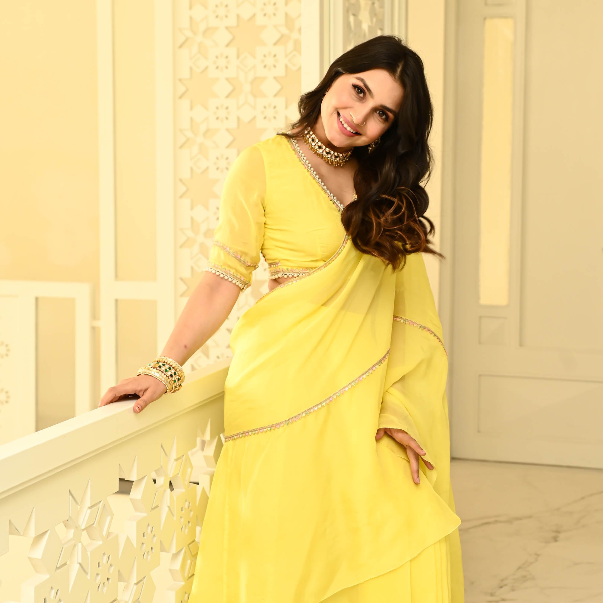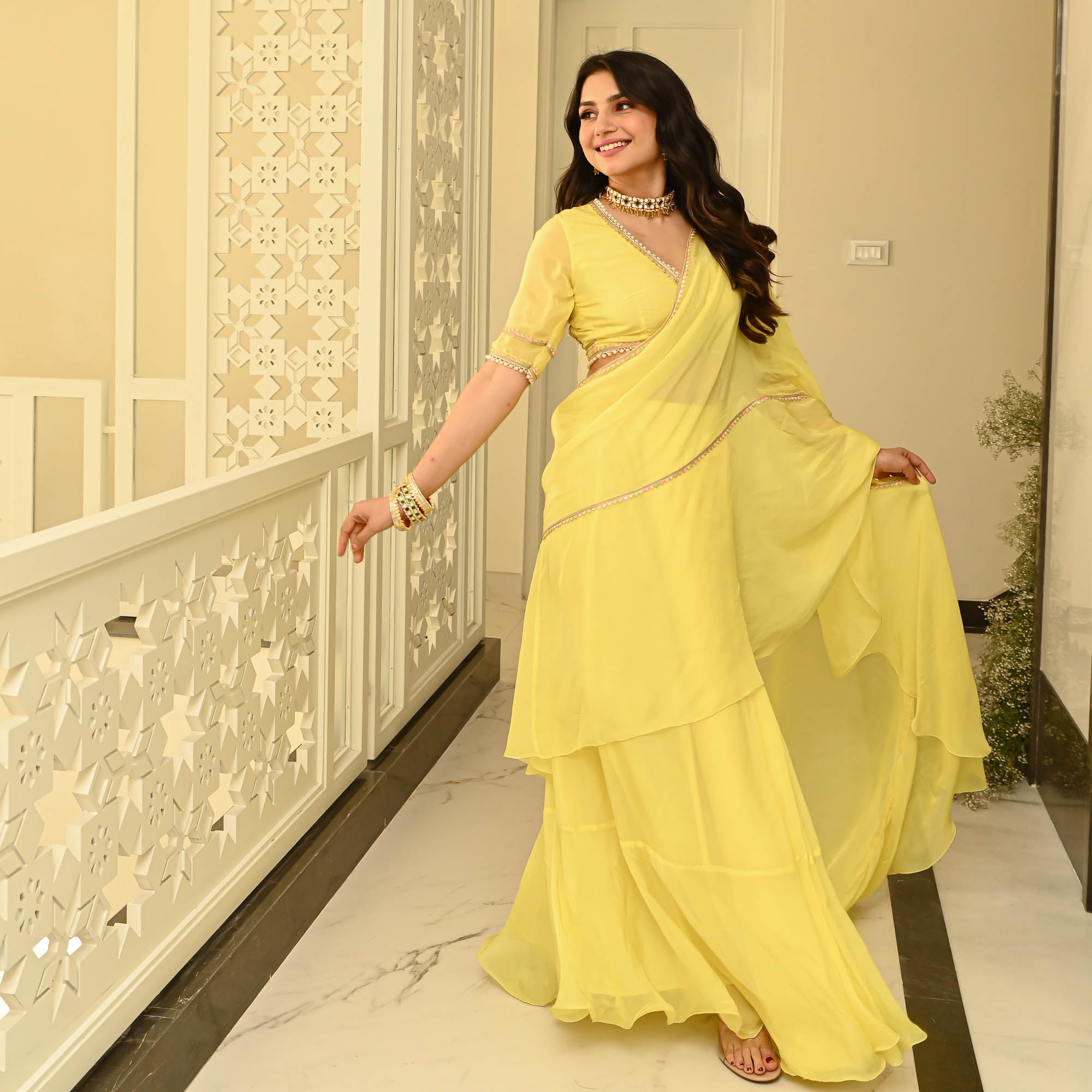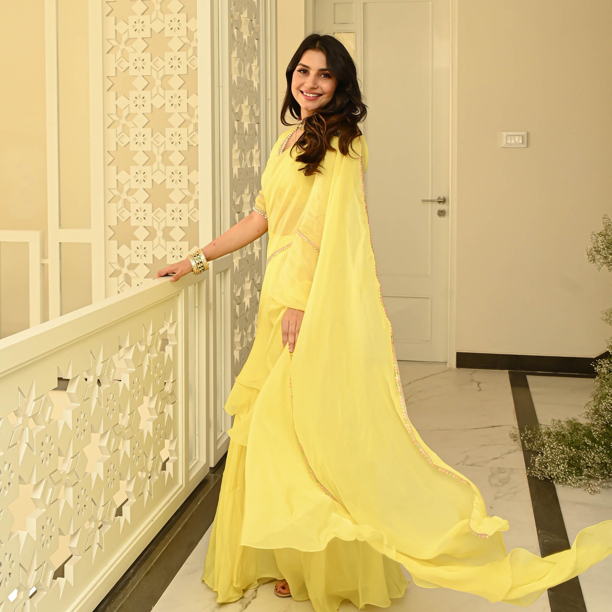 Experience the Magic with our enchanting Light Yellow Organza Draped Saree, where glamour effortlessly meets grace in a seamless dance of fabric. The soothing hues of the stunning fabric and the sway of delicate ruffles lend a sense of calm and awesomeness. This ethereal piece captivates attention with each sway of the soft folds, creating an enchanting aura that lingers long after you've walked into a room. Paired with a matching blouse that features enchanting elbow-length sleeves and cut-out detail in the back. Let the magic unfold in every pleat, allowing this saree to become an integral part of your unique style story, leaving an indelible mark of sophistication.