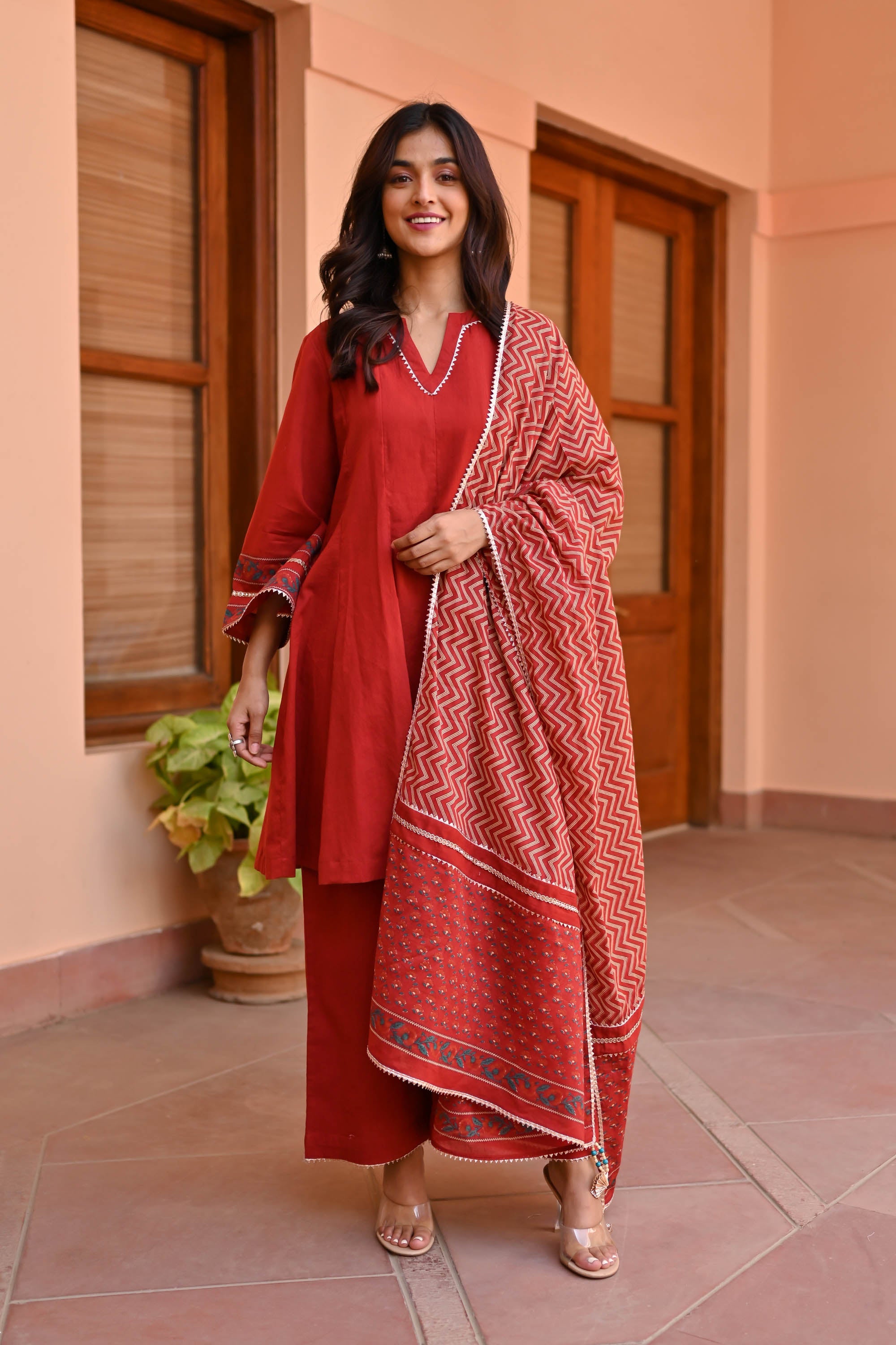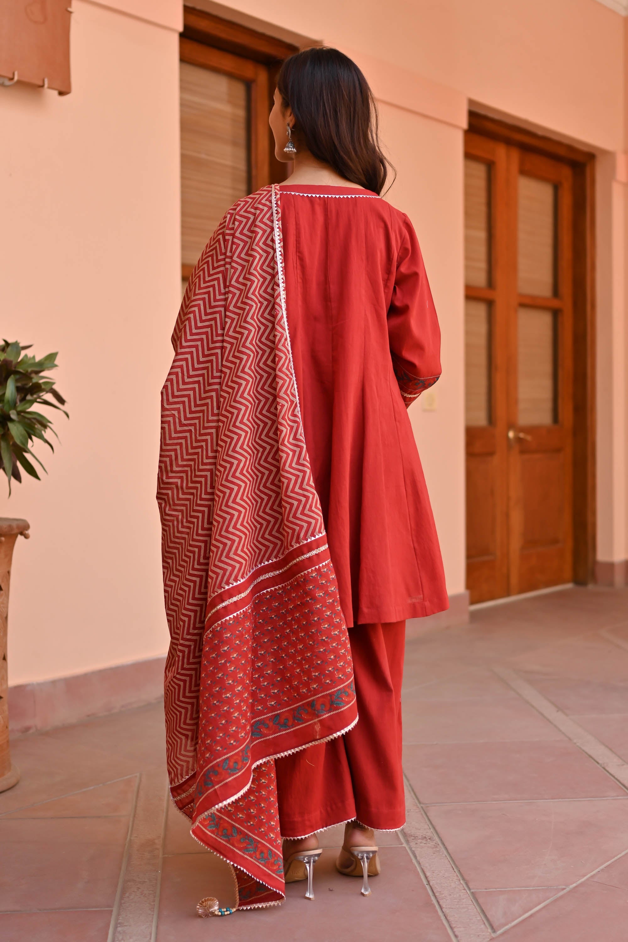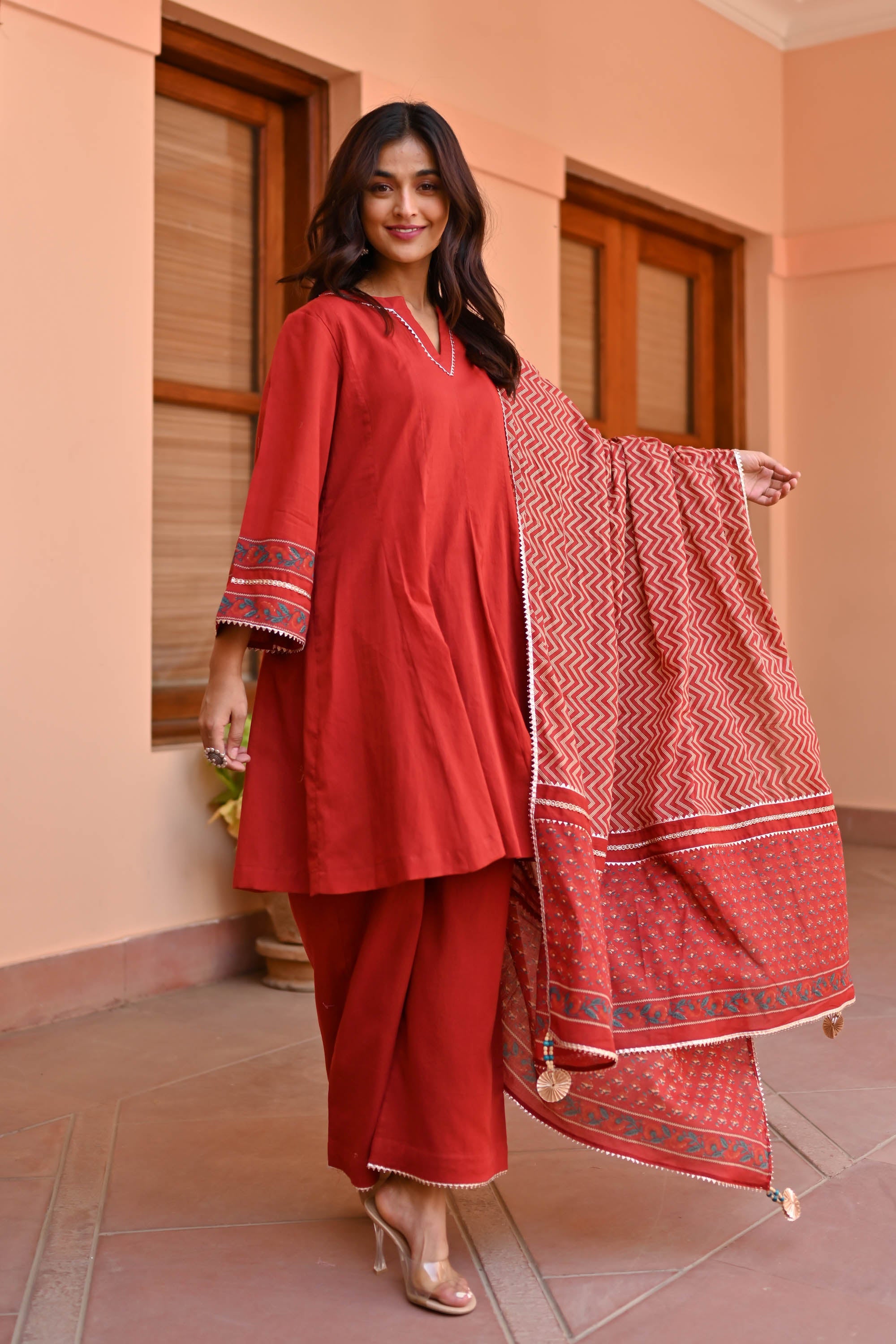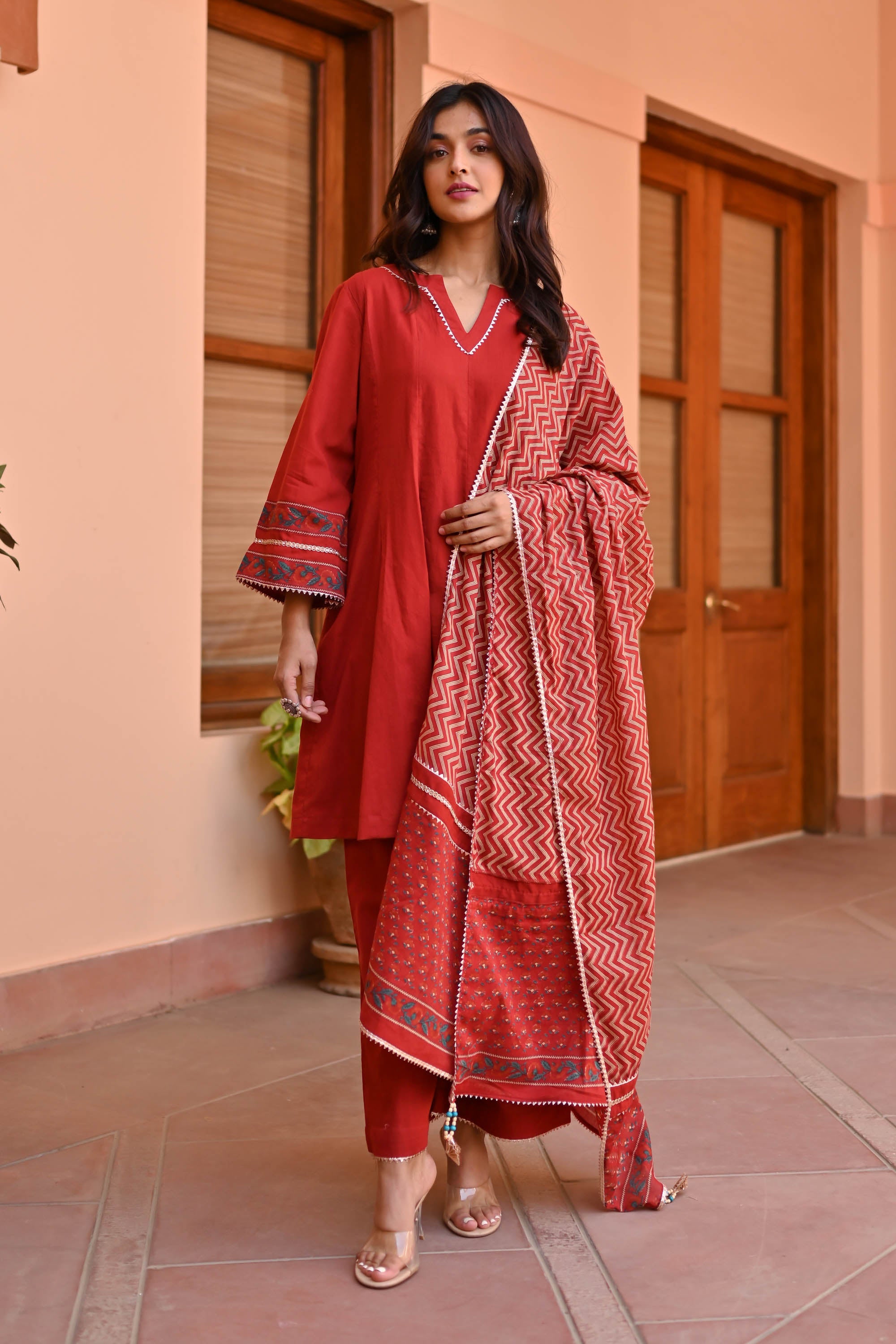 Elevate your style with the Orchid Trio Cotton Suit Set. Meticulously crafted from luxurious cotton, this ensemble exudes sophistication and comfort. The rich rust hue enhances the relaxed A-line fit kurta, accentuated with intricate lace detailing and contrasting panels on flared sleeves. Paired with matching pants and a printed dupatta, it's a stunning fusion of elegance and ethnic charm for the modern woman.