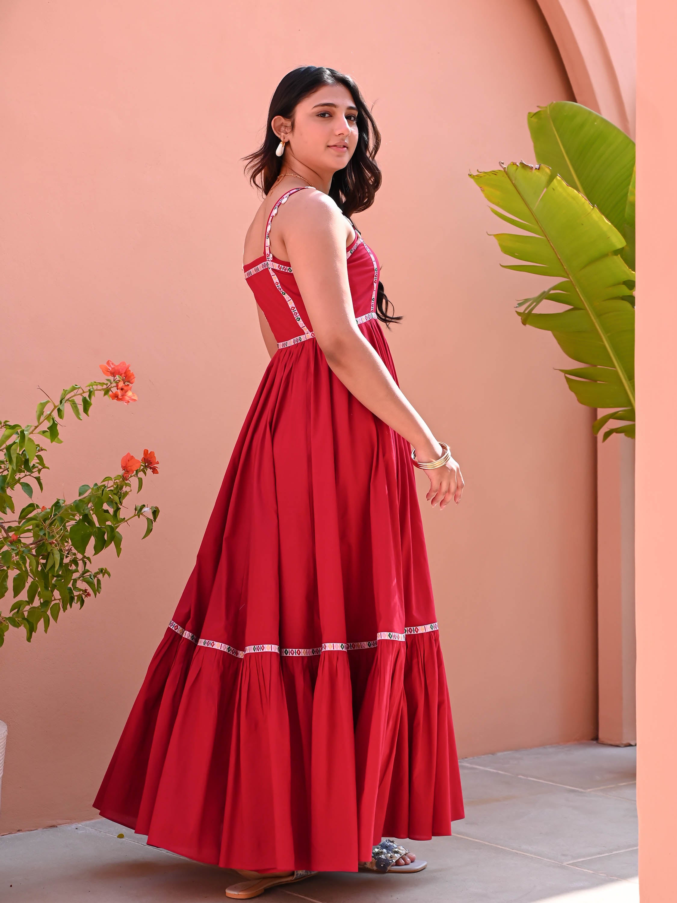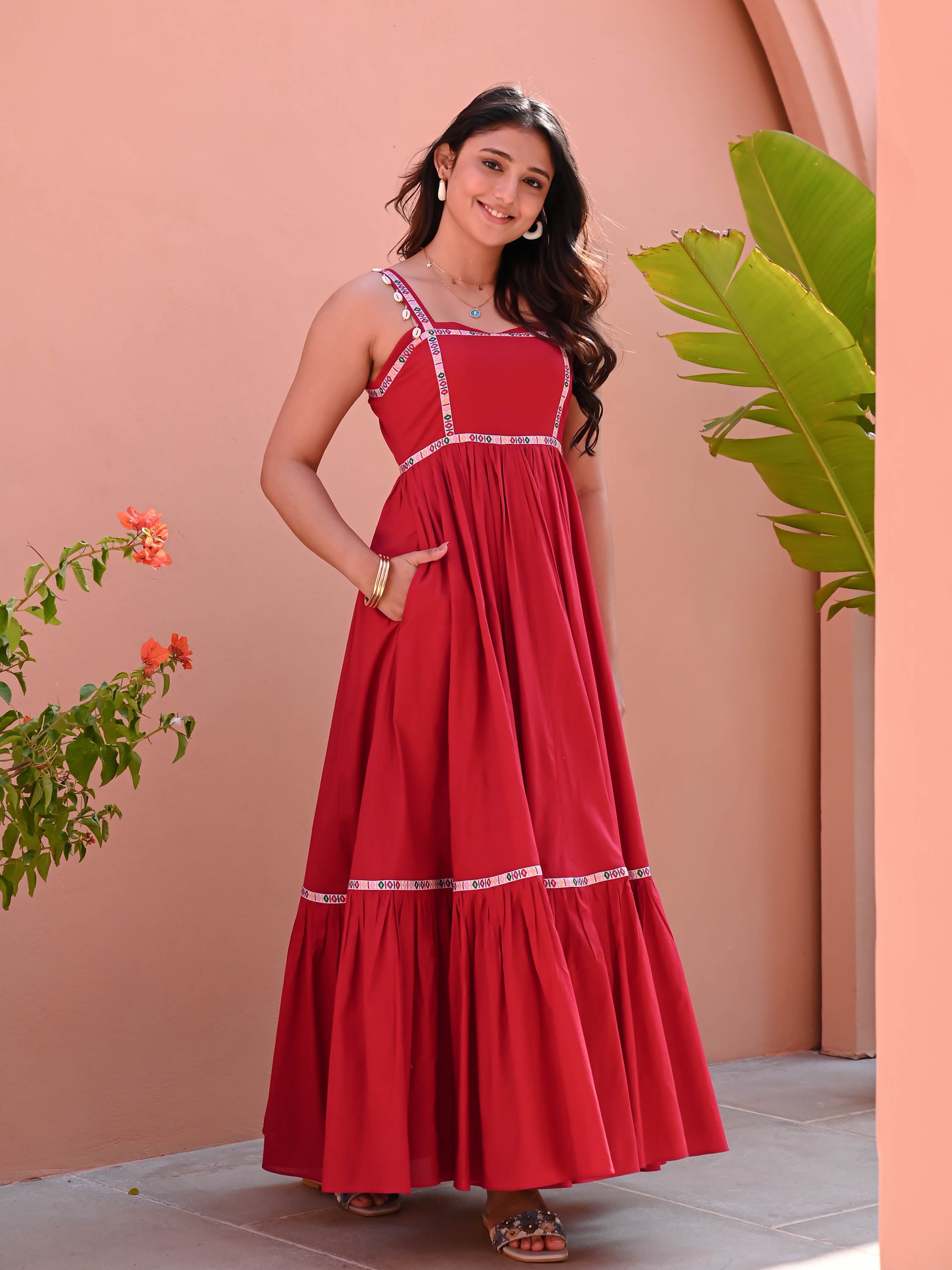 Bold and beautiful, the Cayenne Cotton Dress is a striking blend of elegance and charm. Crafted from vibrant red cotton, this strappy dress features delicate lace detailing for a touch of romance. The full flared skirt with a frilled hem adds graceful movement, making it a perfect choice for effortless, statement-worthy styling.