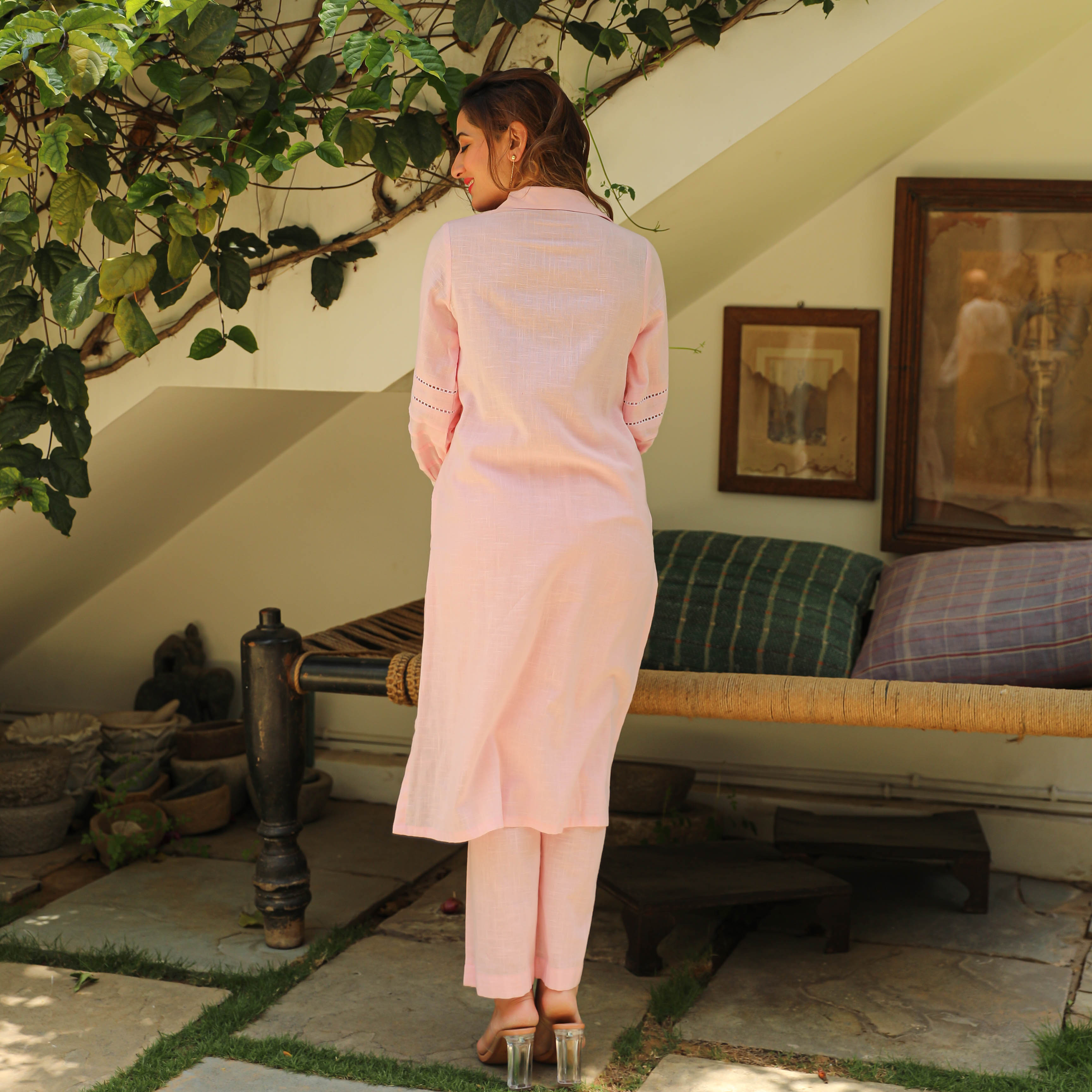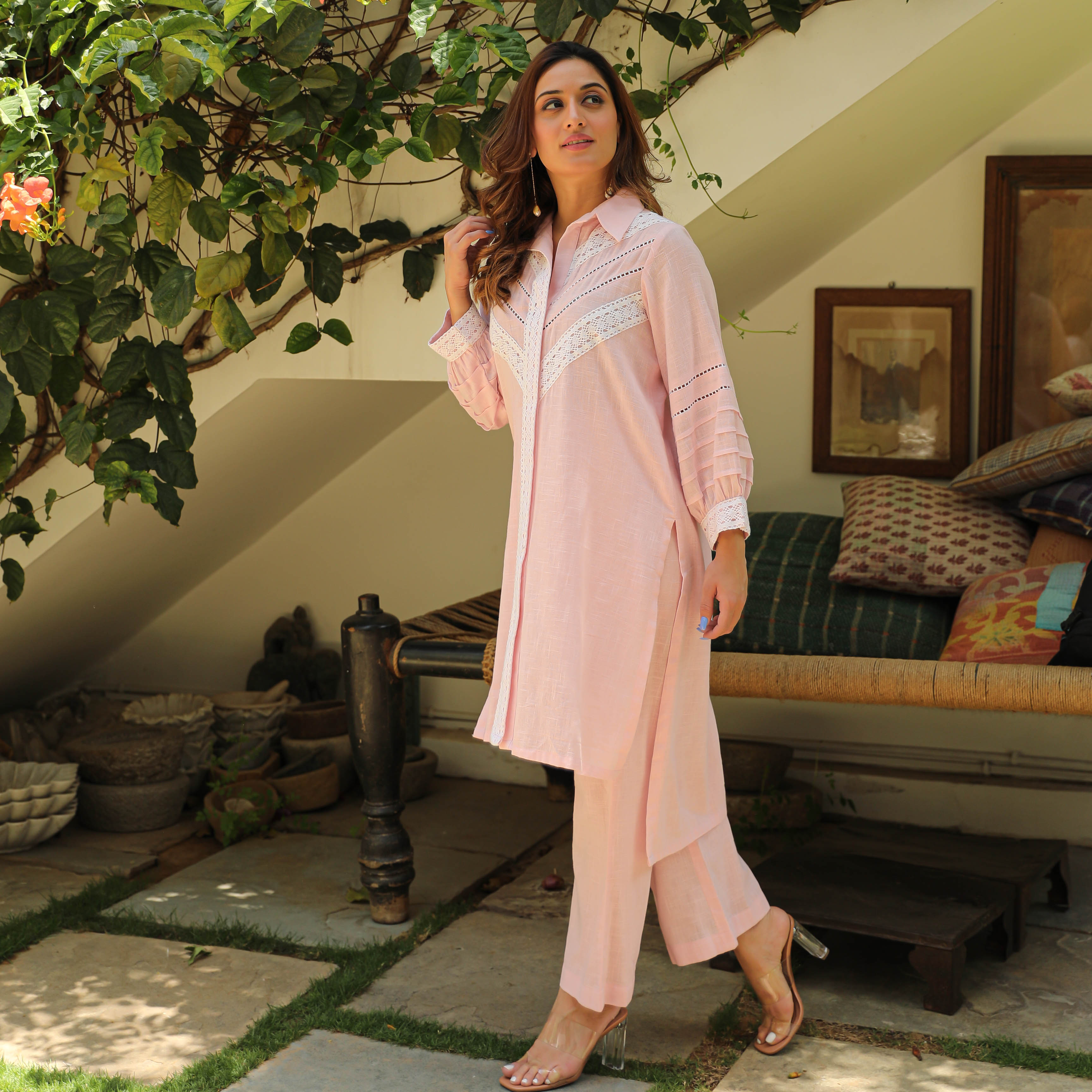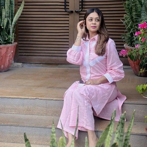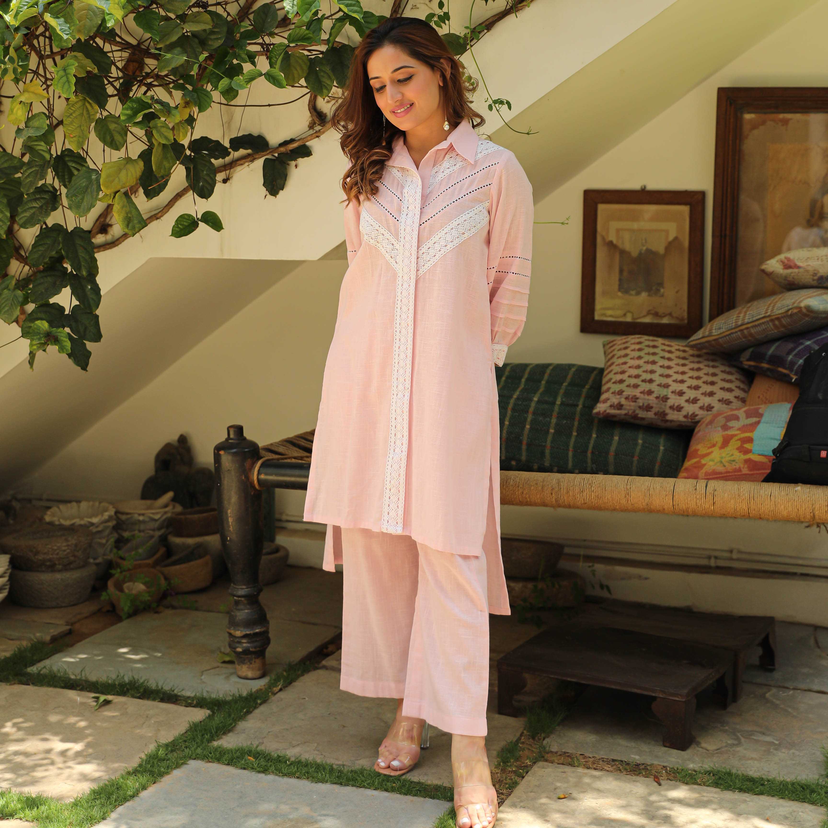 Indulge in the luxurious comfort of this Cotton Reverie Co-ord Set, crafted from the finest cotton that feels as gentle as a daydream against your skin. The soft peach hue radiates a sense of serenity and femininity, while the intricate white lace and schiffli embellishments add a touch of elegance and playfulness. Get ready to float through your day in sheer enchantment with this ensemble.