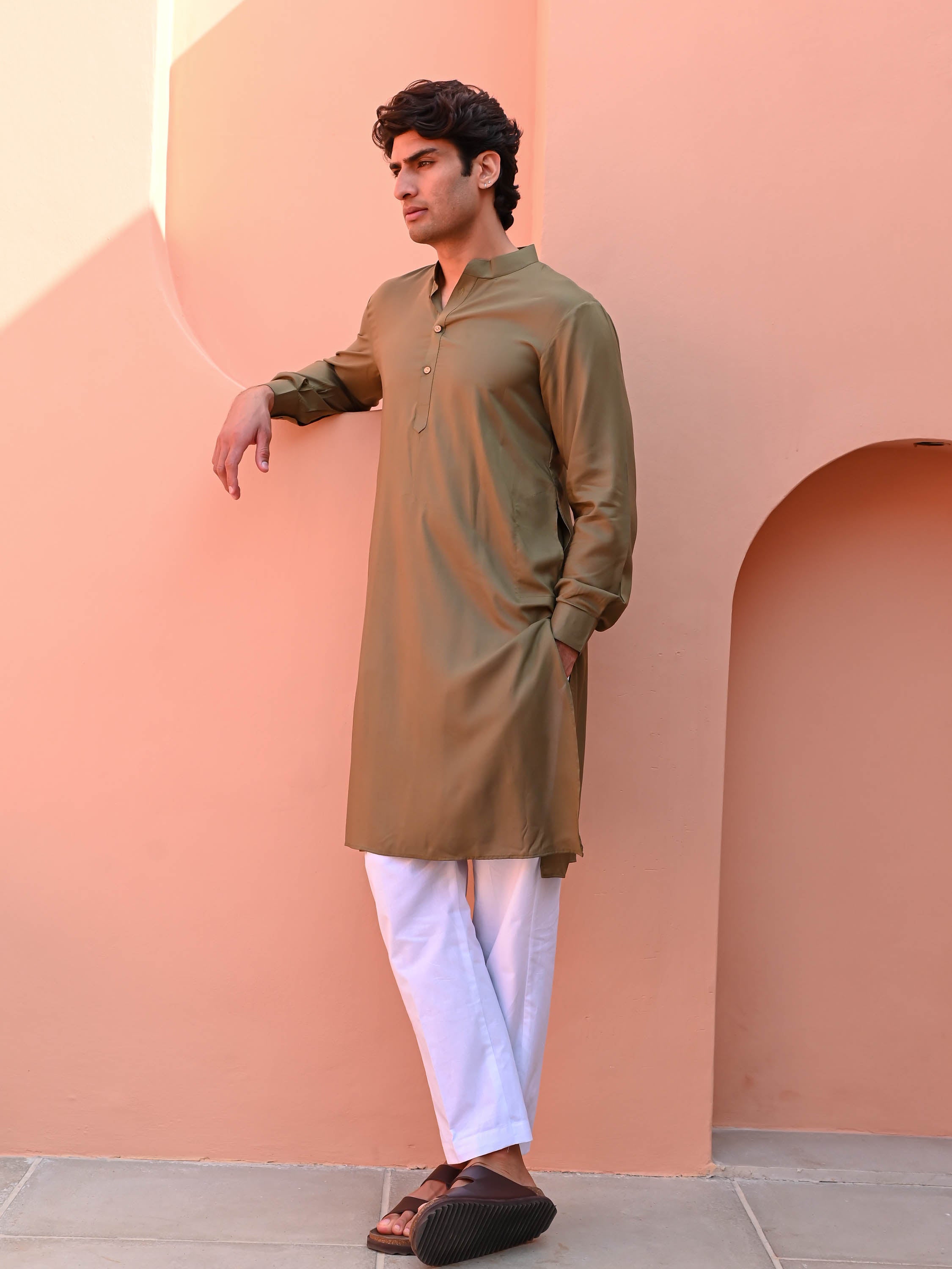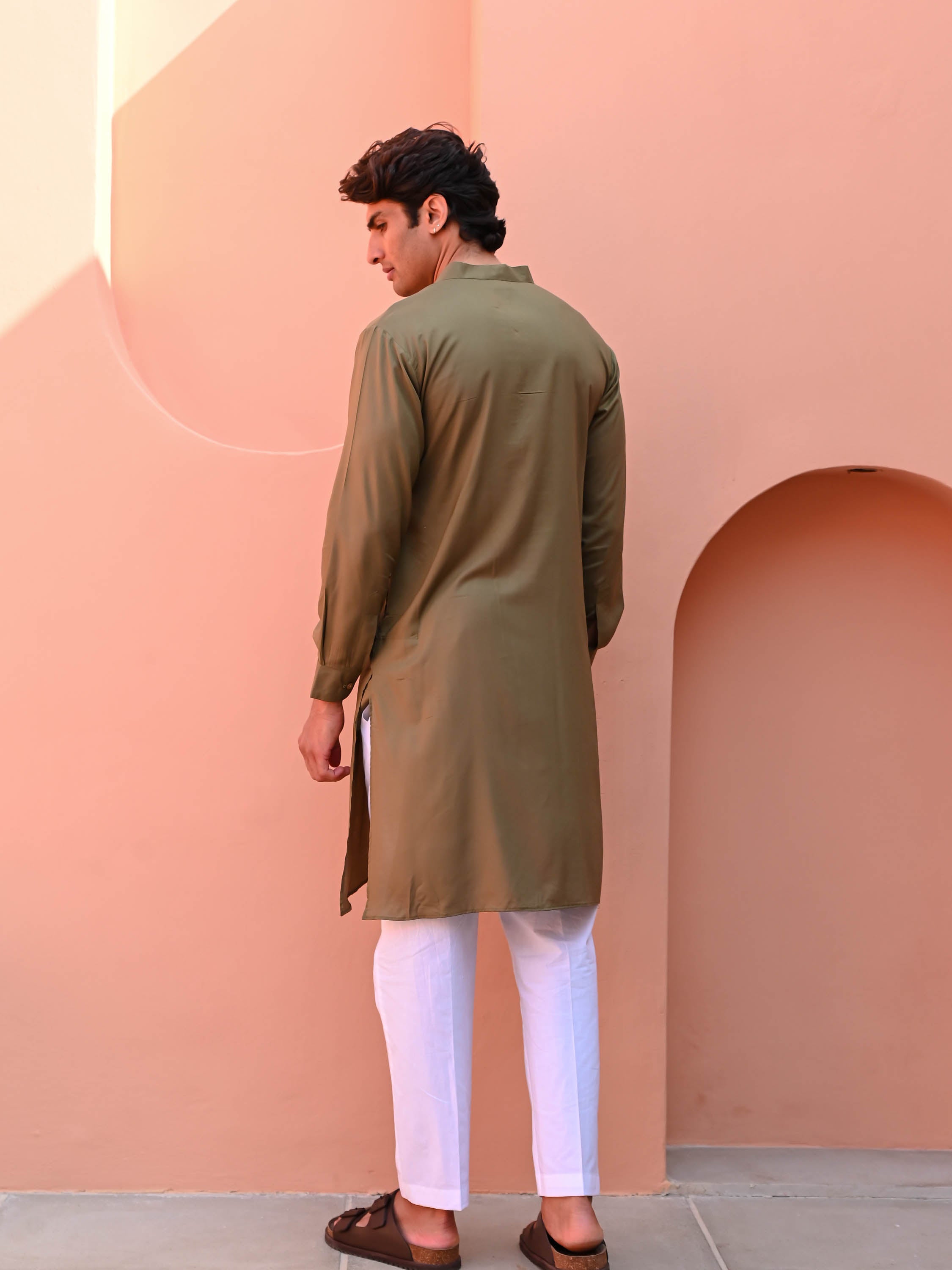 Elevate your style with the Dark Olive Men Long Kurta, crafted from luxurious modal satin fabric for a smooth, refined finish. Featuring a sleek Mandarin collar, a button-front placket, and full sleeves with cuffs, this kurta combines tradition with contemporary elegance. Complete with two side pockets, it’s perfect for both casual and festive occasions.