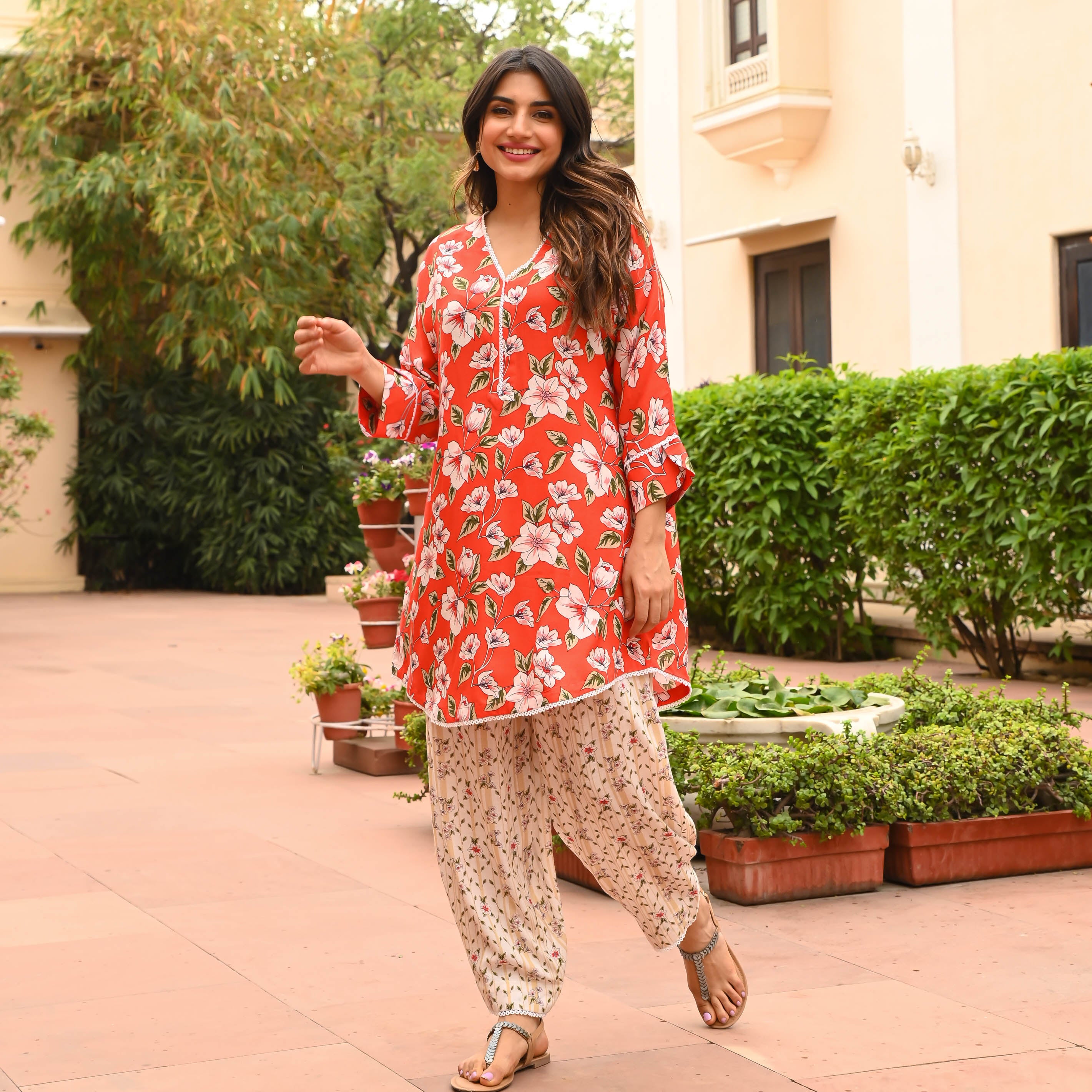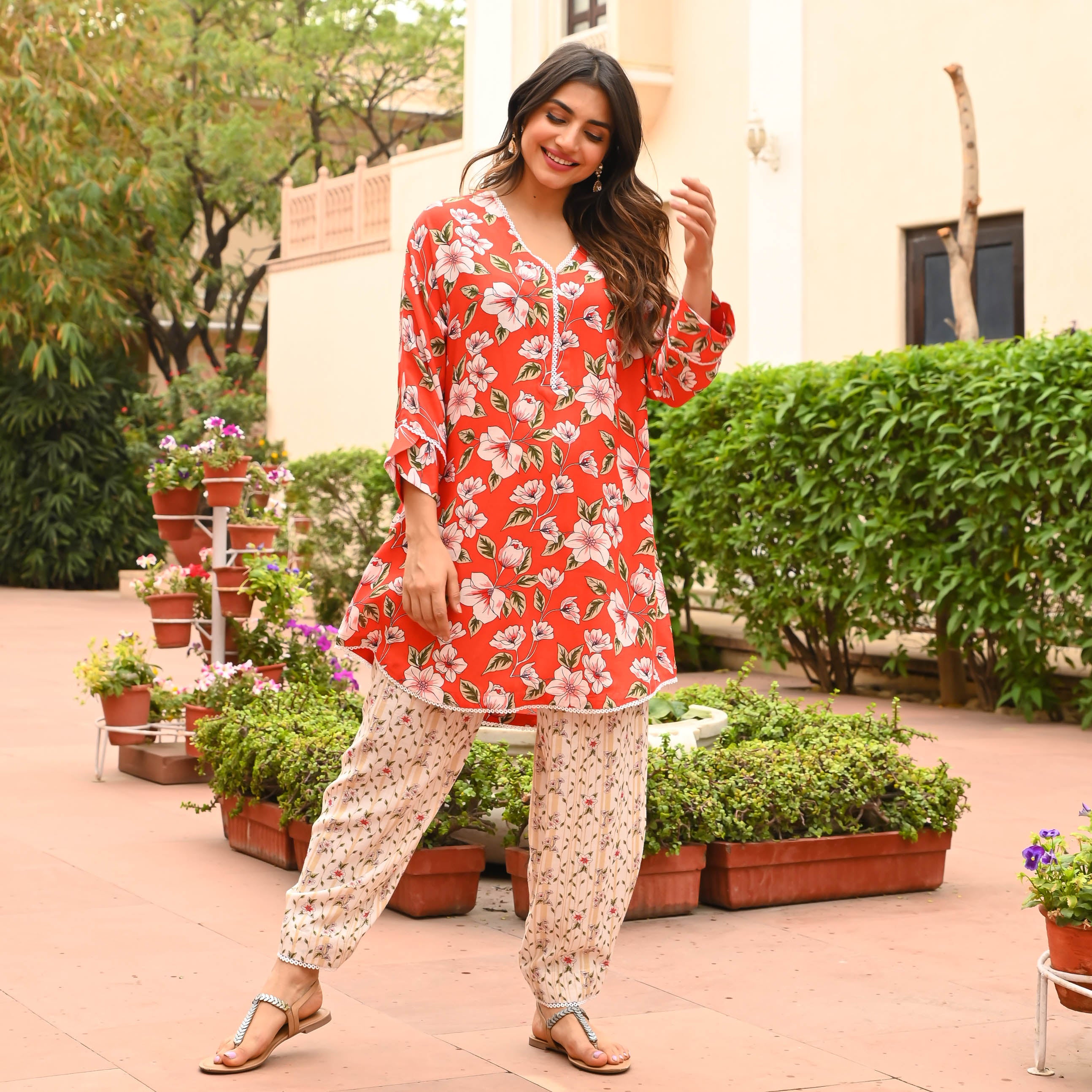 Crafted with care and attention to detail, this Orange Salwar Set features a bold and eye-catching beige floral digital print that exudes confidence and style. The loose-fitting design ensures comfort and ease of movement, making it ideal for casual outings in the Summer heat. The Set comes with a pair of cream salwar pants that provide a subtle contrast to the vibrant orange top, creating a balanced and cohesive look. Made from high-quality materials, this Salwar Set is both durable and easy to care for, ensuring that it remains a staple in your wardrobe for years to come.
