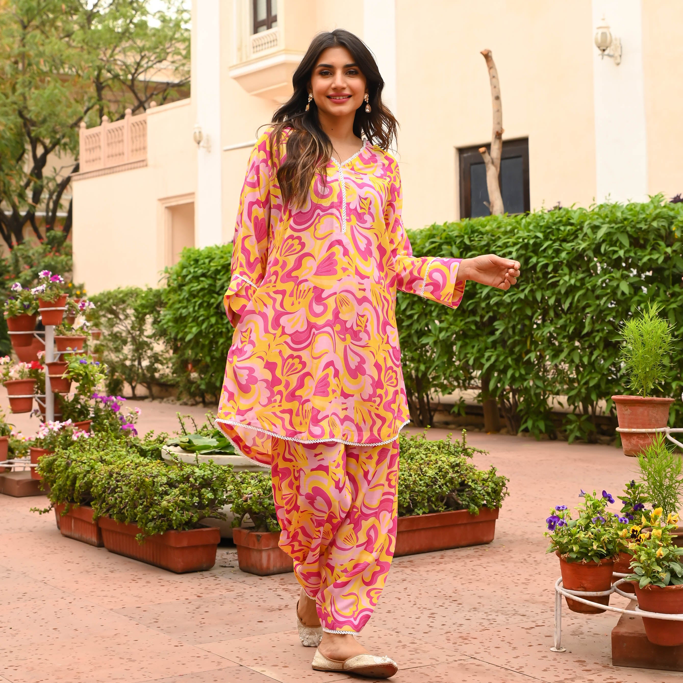 The beauty of nature meets the art of fashion in our stunning Harmony Hues Kurta Set. This Set is sure to transport you to a world of whimsy and beauty. This Kurta Set is designed for maximum comfort, making it perfect for all-day wear and the beautiful abstract floral print in pink and yellow adds a touch of vibrancy and liveliness to the outfit. The loose fit and V-neckline of the Kurta Set are perfect for those who prefer comfort while looking fashionable. The versatility of this Kurta set makes it a must-have in your wardrobe.