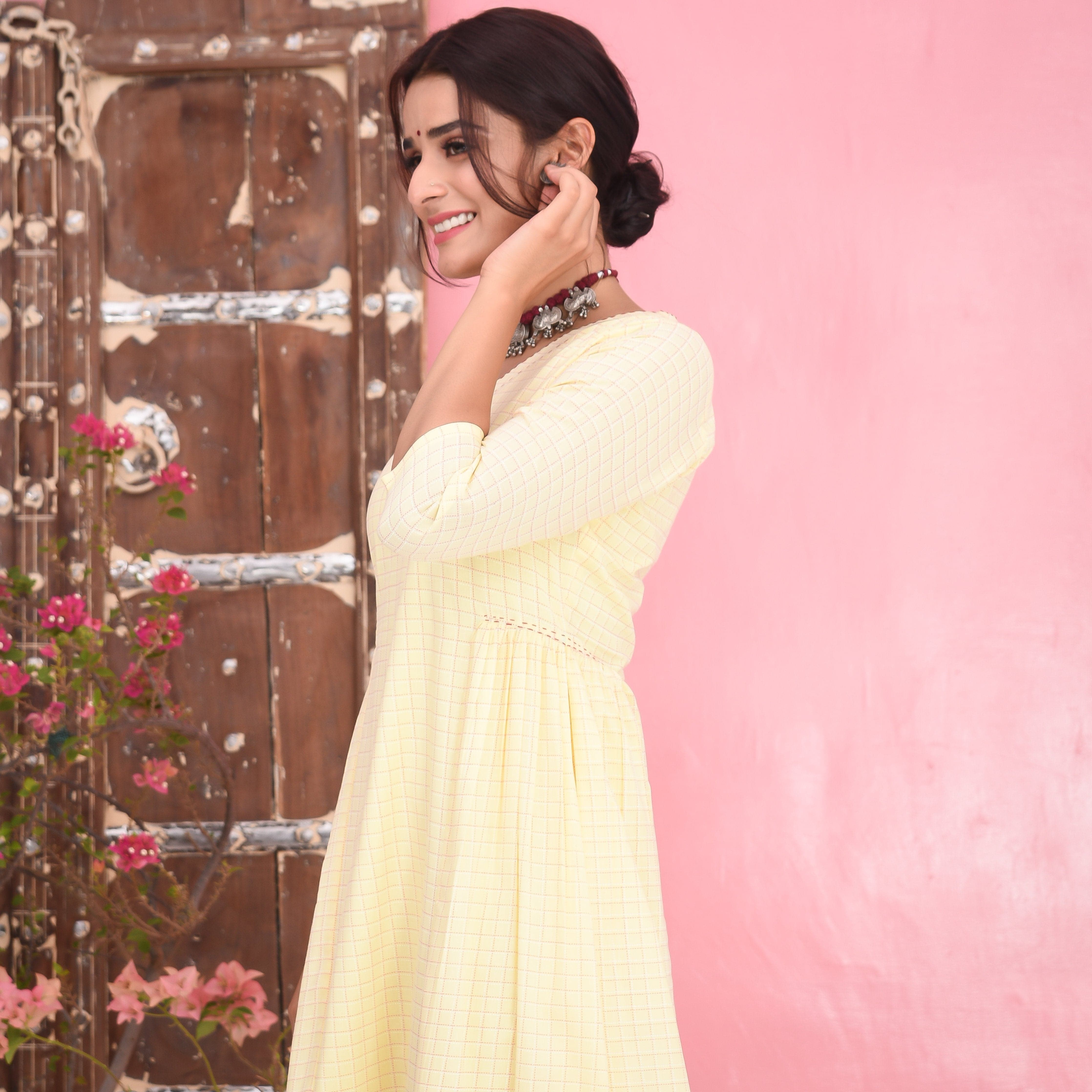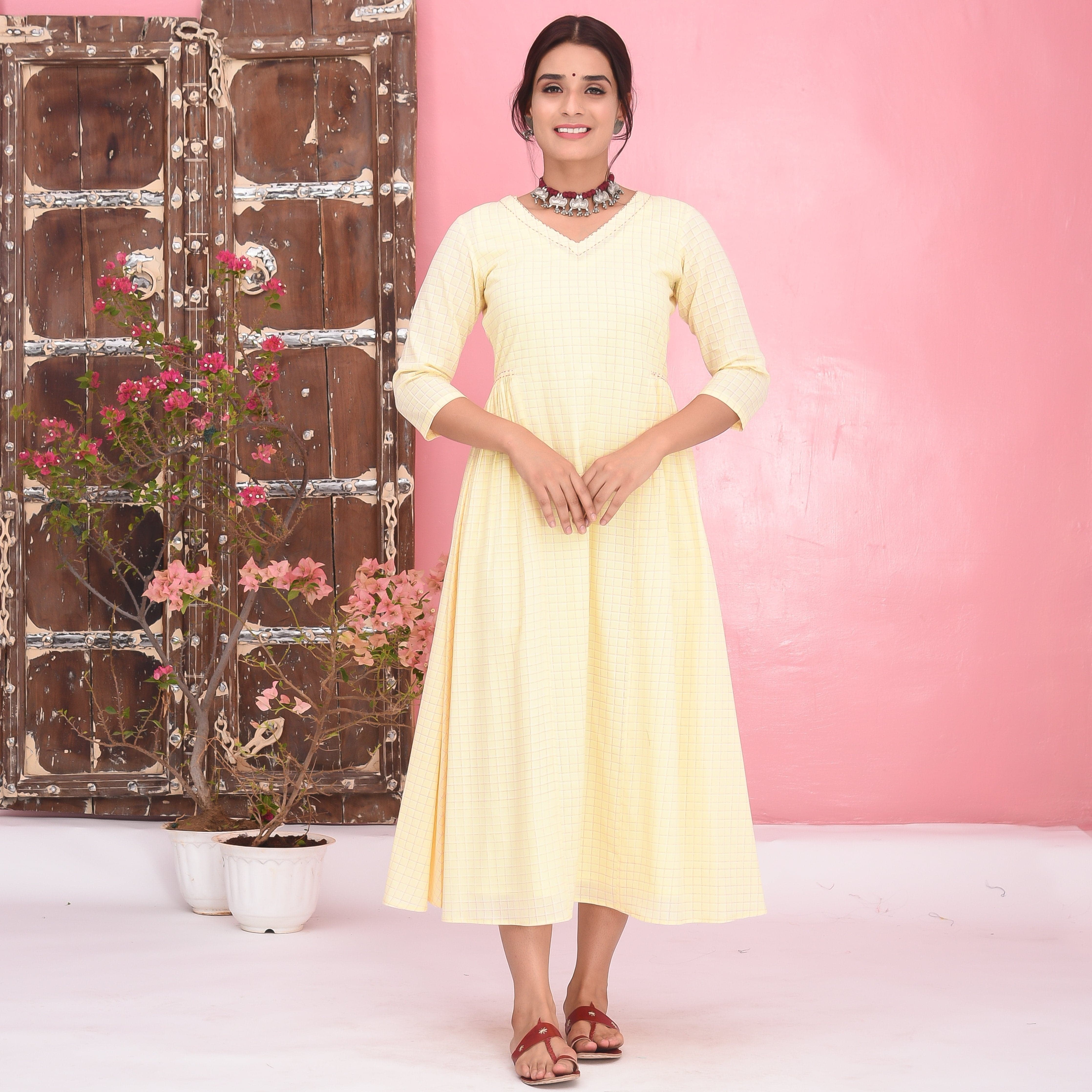 Natural-dyed colours might bleed during the first few washes or rub against the skin & other light-coloured garments. In the artful process of hand block-printing, embroidery work and stitching, variations are likely to come into existence. These irregularities are the hallmark of all handmade products and give each style a unique identity.