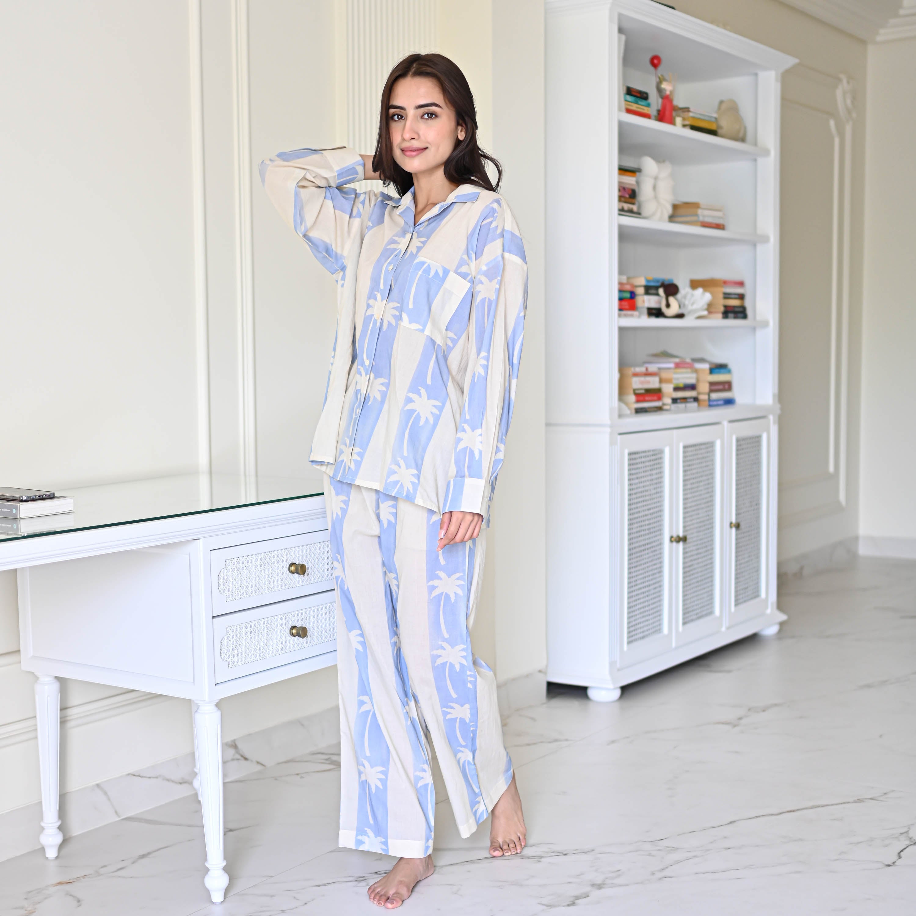 Escape to tropical serenity with our Palm Tree Print Pyjama Set, crafted from luxurious cotton for ultimate relaxation. Adorned with charming palm tree prints on an enchanting beige and blue background, this nightwear ensemble brings a touch of paradise to your bedtime routine. The relaxed-fit shirt features full sleeves with cuffs, a button-down front with a classic collar, and a handy pocket. Paired with matching pyjamas, it's perfect for dreaming in style.