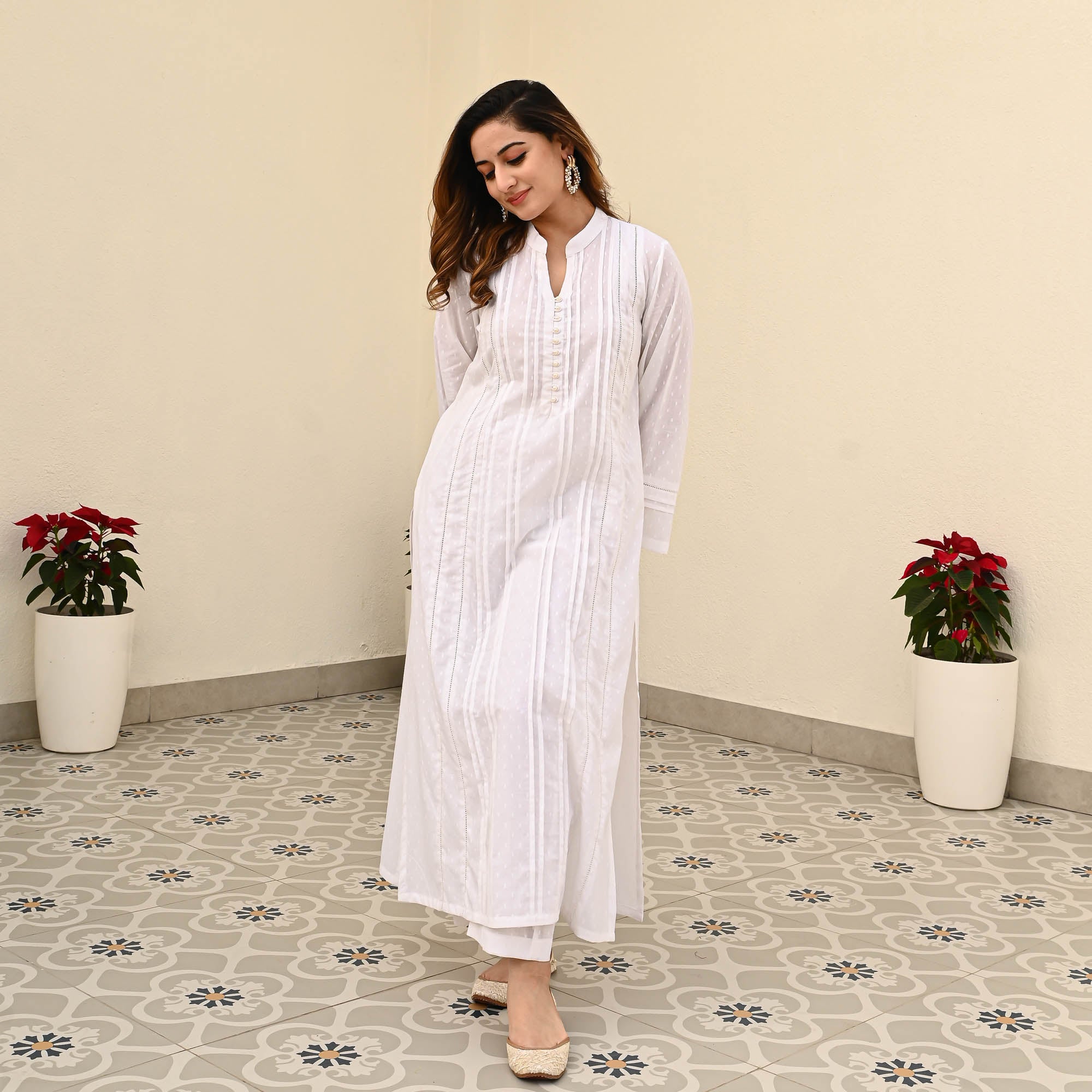Strut into the summer in style with the stunning White Cotton Dobby Coord Set, crafted from the most luxurious and soft as-butter cotton dobby fabrics, the stunning co-ord set features a straight kurta with a mandarin collar and pearl with loop details on the front placket, pin-tuck details with ladder lace throughout, and full sleeves. Paired with matching pants to elevate the allure of the ensemble. The easy breezy relaxed-fit kurta is perfect for strolling through the sunlit summer gardens, feel comfy and chic without compromising on the style statement. Step out to slay this Spring-Summer and steal hearts.