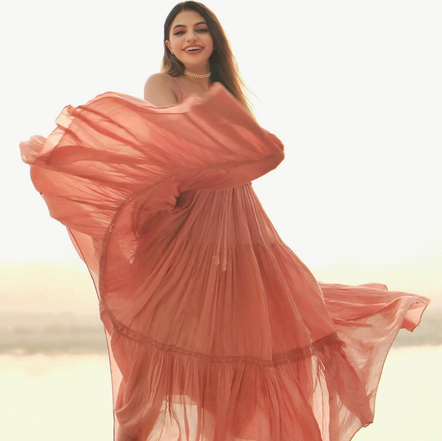 The Beauty Cotton Dress is a symphony of rustic charm and modern flair. Crafted from sumptuous cotton, this maxi dress radiates understated elegance in its pale rust hue. Featuring delicate strappy sleeves and innovative corset-like tie-up details on the yoke, it marries classic and contemporary design seamlessly. Complete with intricate crochet lace accents beneath the yoke and a full skirt with tiered layers, it's a unique expression of timeless beauty.