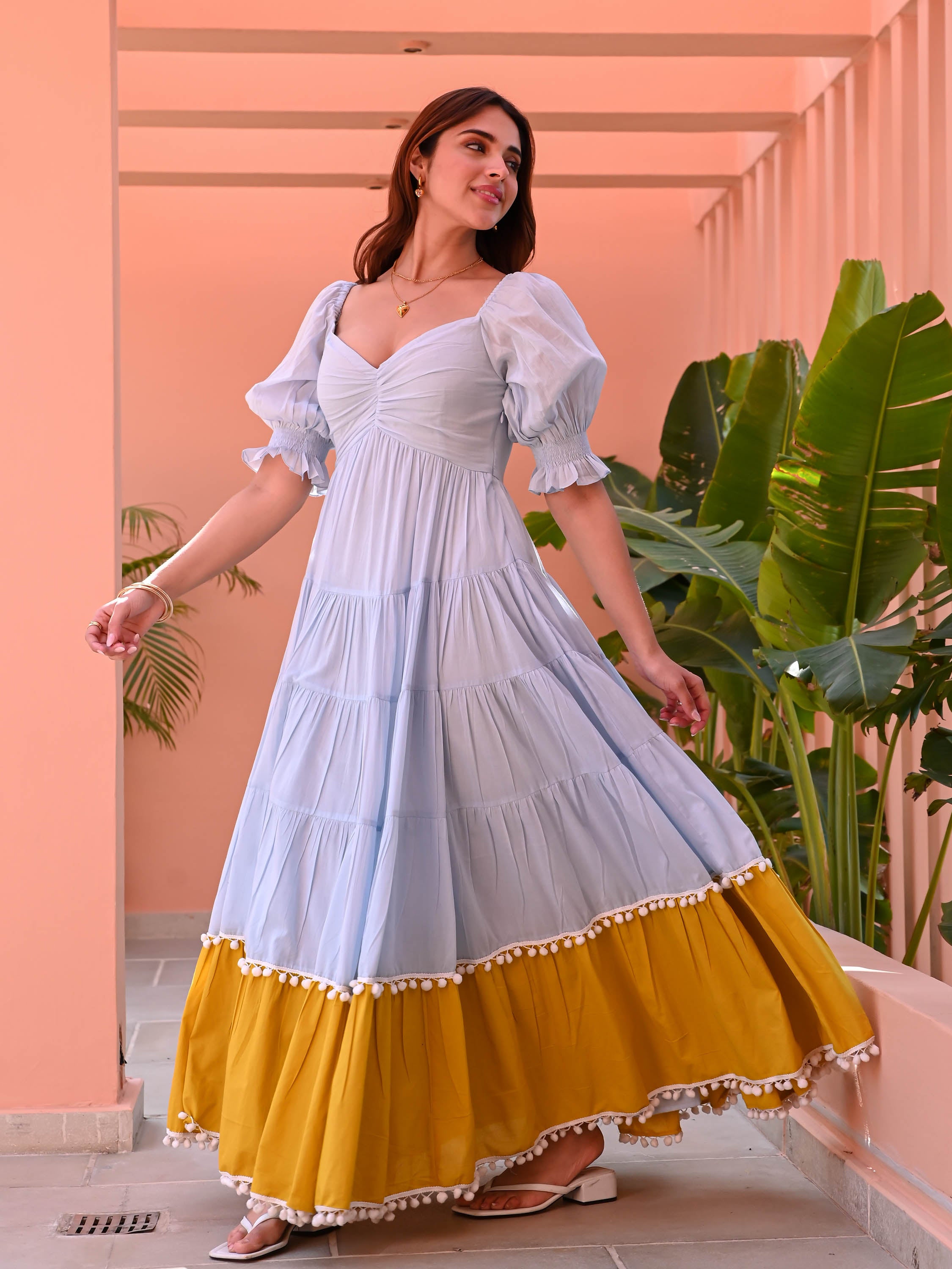 The Blue Mustard Cotton Dress is a perfect mix of elegance and playfulness. Made from soft powder blue and mustard cotton, it features a flattering sweetheart neckline and charming short puffed sleeves. The tiered full skirt, accented with a mustard tier and delicate pompom lace, adds a whimsical touch, making it an effortless choice for breezy, feminine styling.