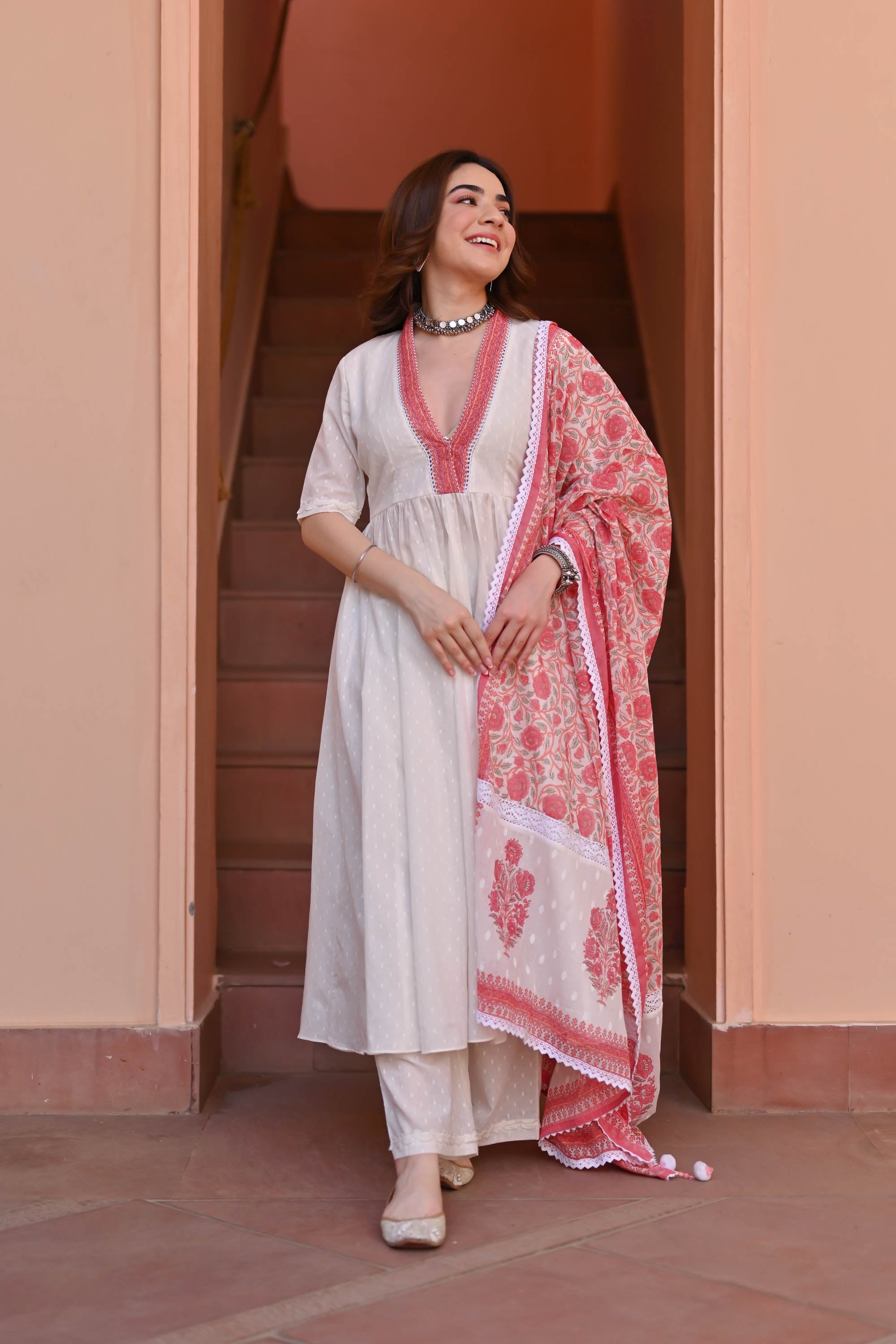 Experience ultimate luxury with the Cotton Nightingale Set Of Three. Crafted from the finest cotton fabrics, this serene white suit features printed panel details on a deep V-neckline, elbow-length sleeves with lace accents, and a flared hemline. Paired with matching pants and a contrasting printed dupatta, it offers an elegant blend of comfort and style.