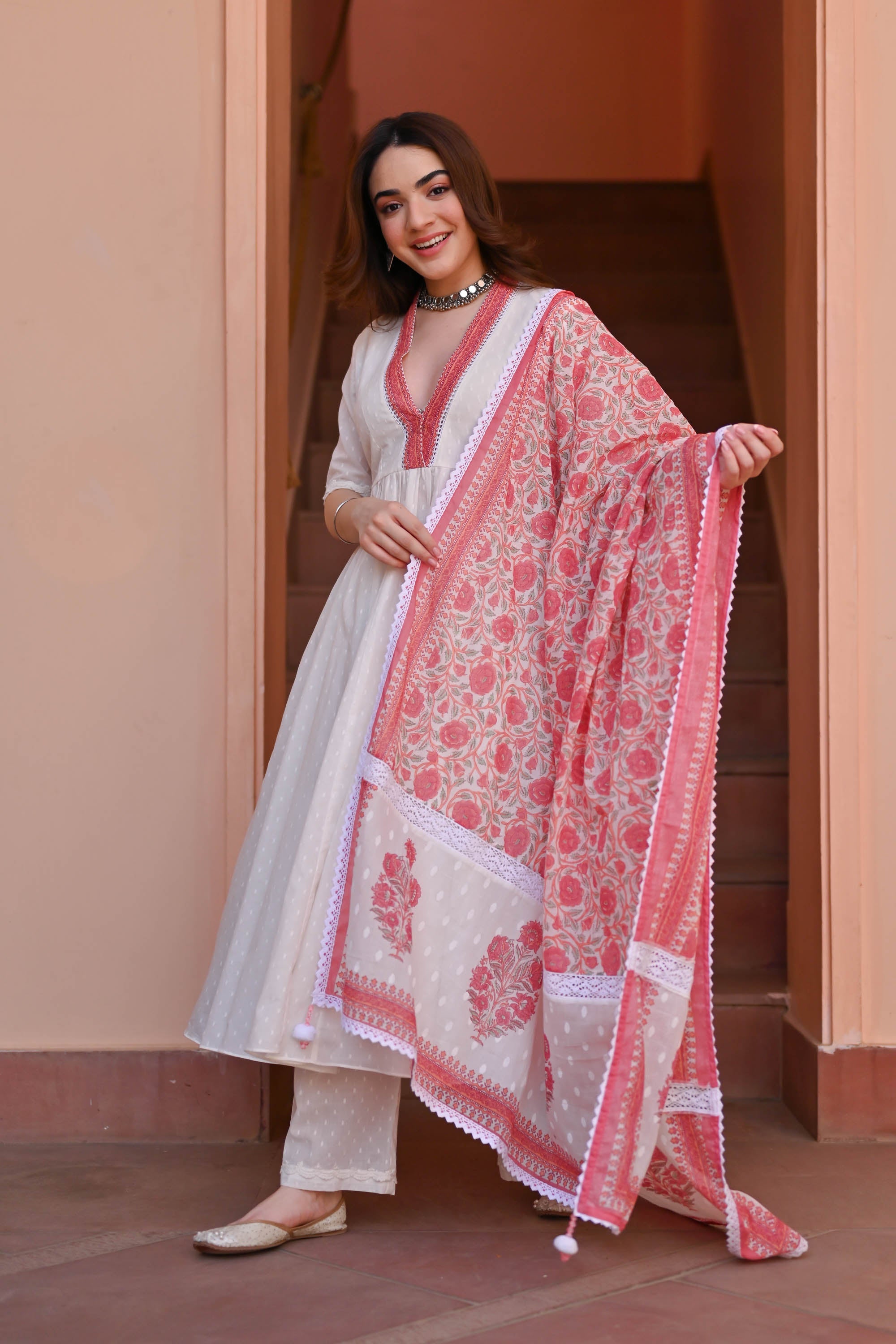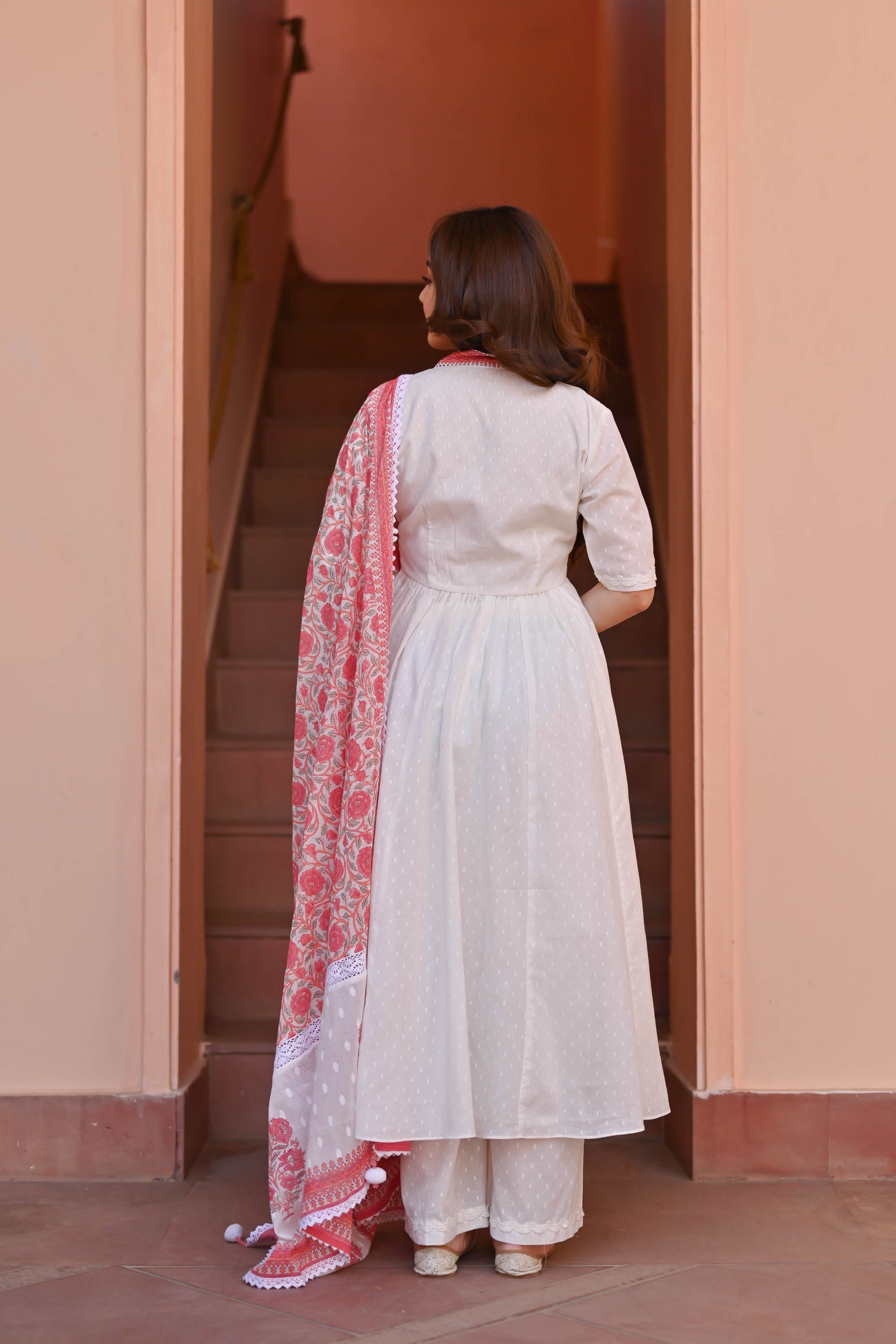 Elevate your style when you dress to perfection in our Mulmul Cotton Suit. Crafted from premium cotton, this Anarkali suit features solid kurta pants paired with a beautifully printed dupatta. Embrace comfort and style in serene white hues, perfect for any occasion. Pakistani cotton suits for women exude timeless elegance and grace, offering unmatched breathability and sophistication. Discover the epitome of chic with our cotton Anarkali suit collection today.
