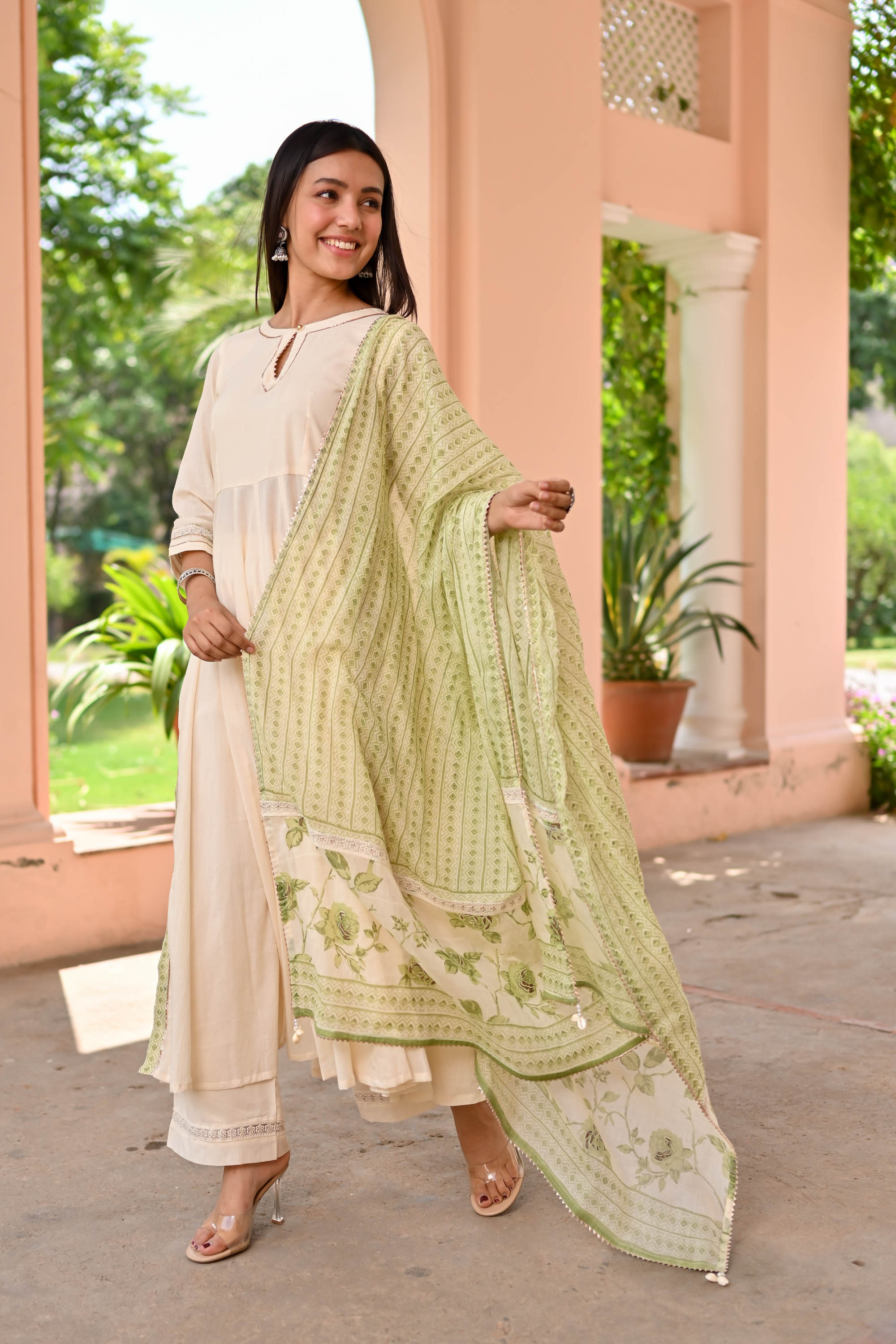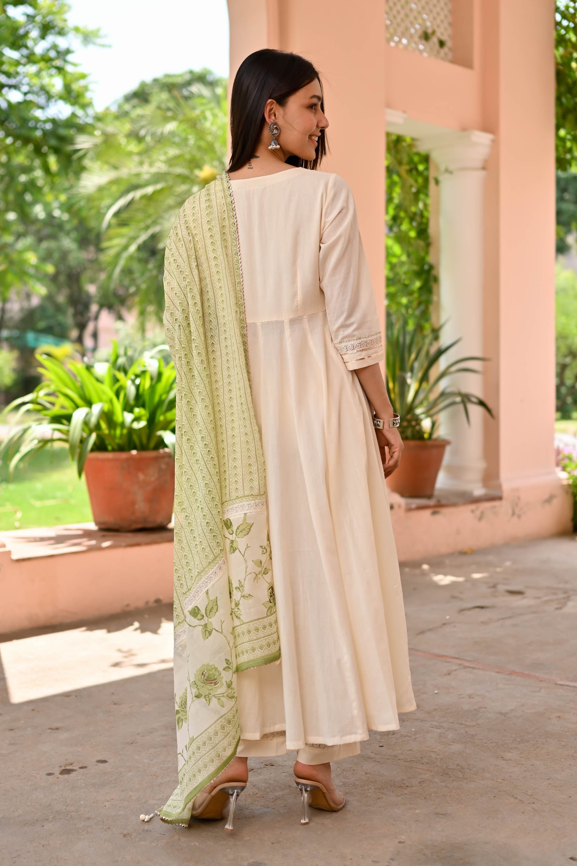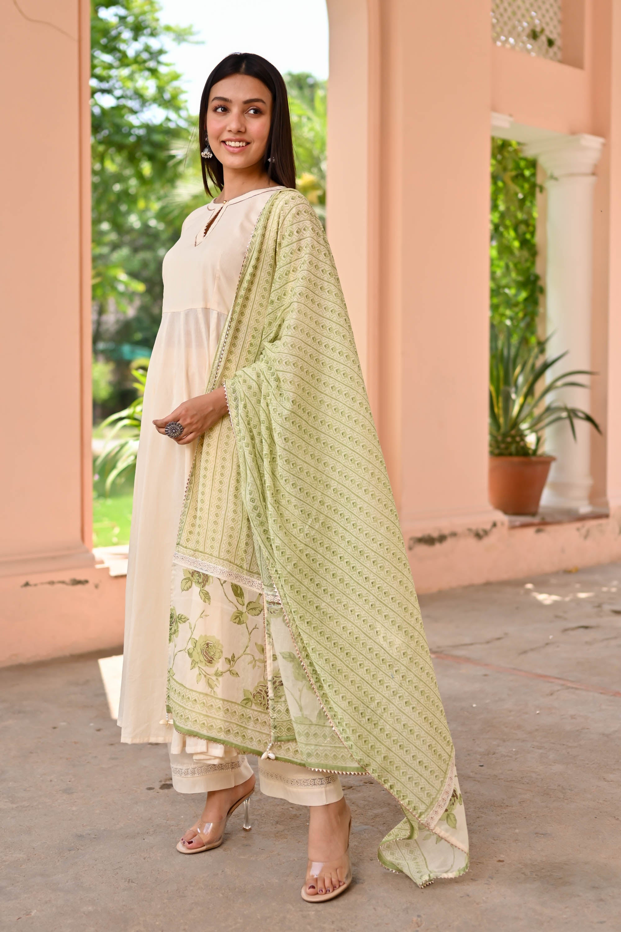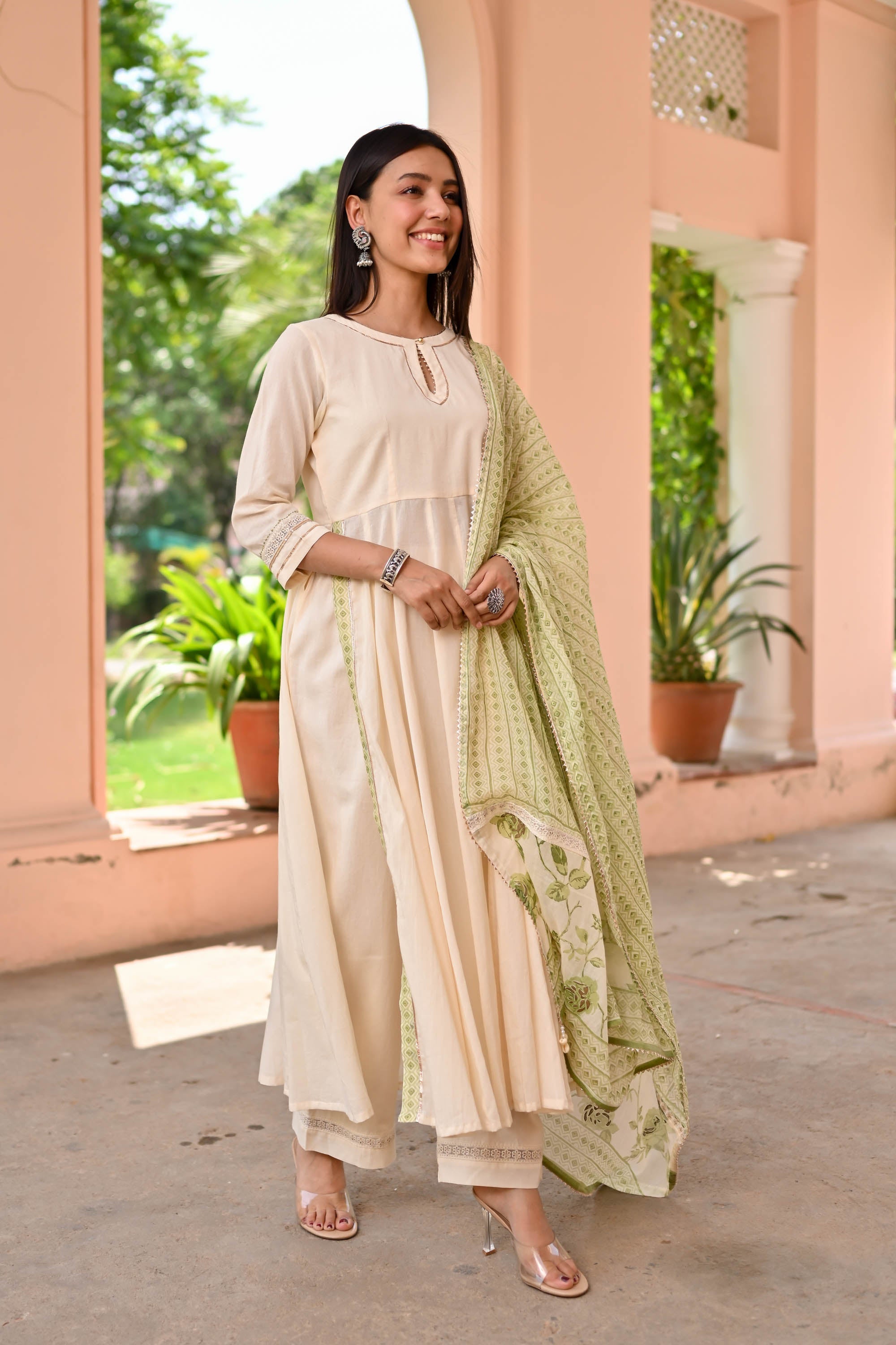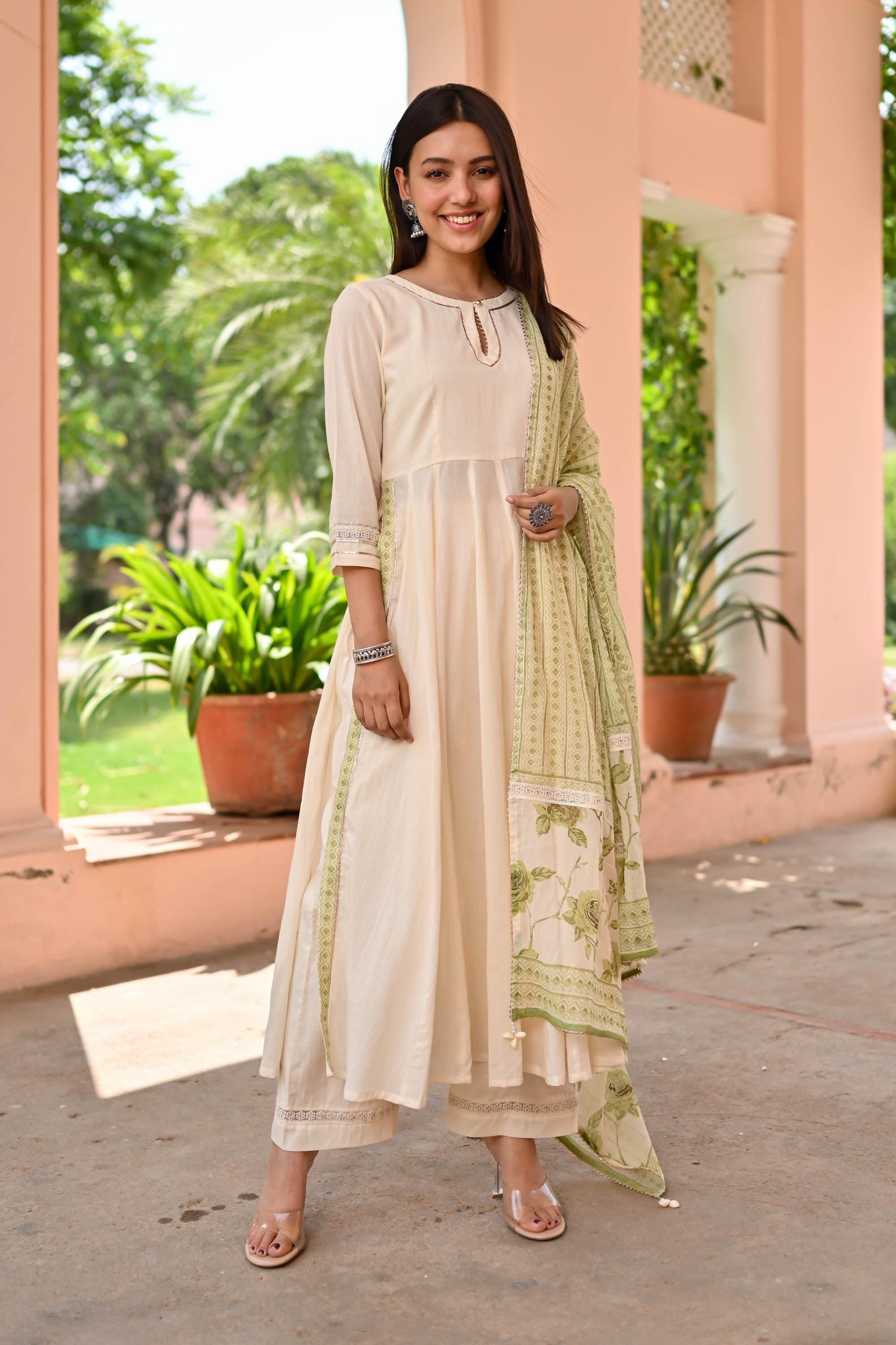 Unveil elegance with the Drishti Cotton Suit Set Trio, a harmonious blend of sophistication and comfort. Crafted from premium cotton, its captivating cream hues exude timeless charm. The flared kurta showcases a round neckline with delicate keyhole details and three-quarter sleeves adorned with intricate lace accents. Paired with coordinating pants and a printed dupatta featuring ethnic motifs, this ensemble promises effortless style for any occasion.