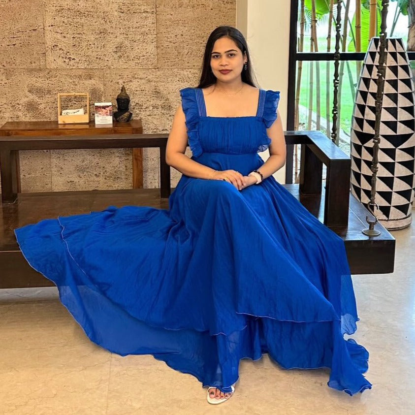 Galaxy Blue Cotton Dress is a celestial wonder that will transport you to fashion galaxies far, far away. This dress is a star-studded delight, crafted from the softest cotton fabric that glides and flows with every step, creating an enchanting A-line silhouette that flatters your figure. The dress also boasts playful ruffled sleeves that add a touch of whimsy and movement.