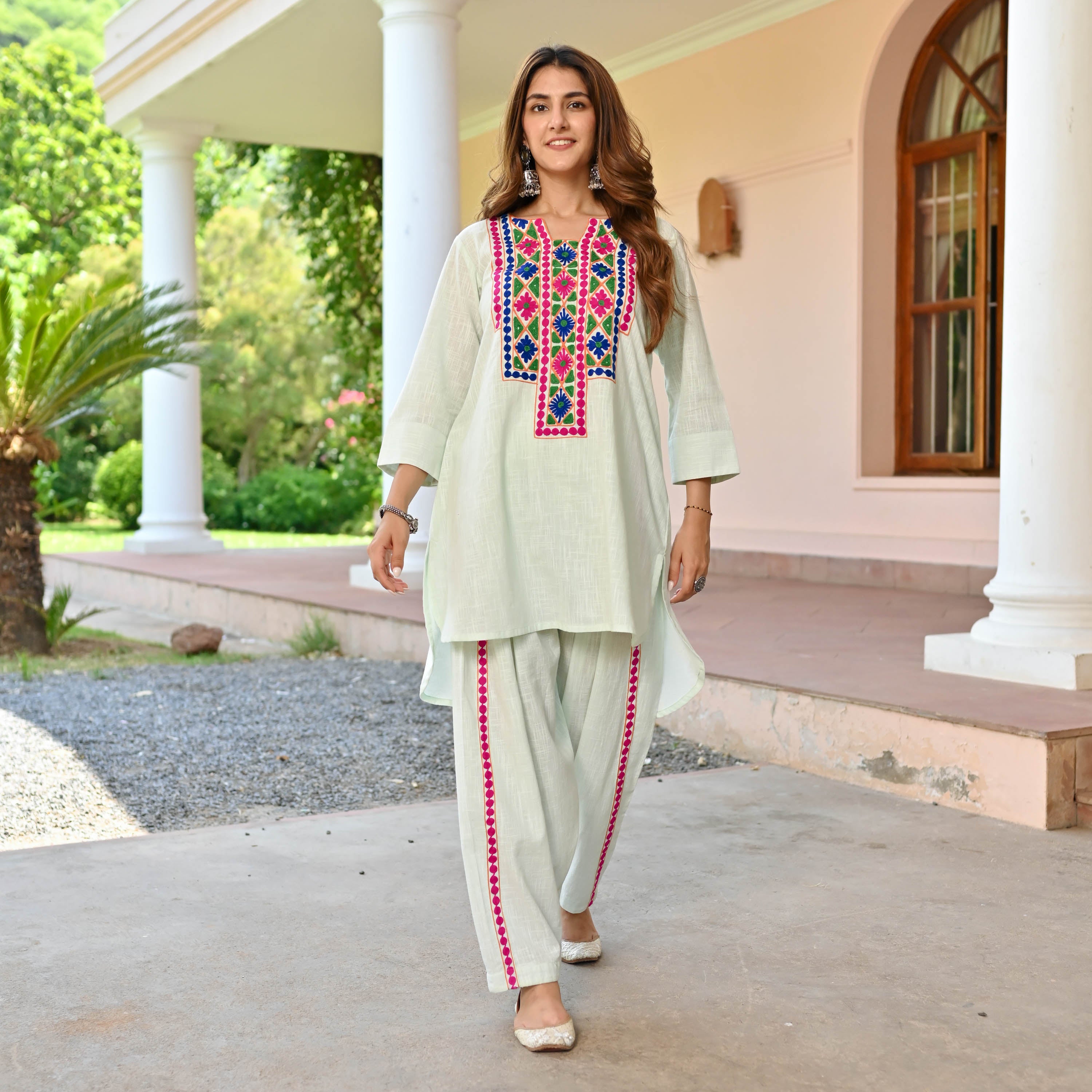 Step up your style with the Mink Aari Work Kurta Pants. This white cotton kurta showcases multicolor ethnic aari work on a round neck with a notch and detailed front yoke, complemented by three-quarter sleeves. Paired with matching Patiala-style pants, this ensemble brings together vibrant artistry and traditional charm for a look that’s effortlessly chic and comfortable.