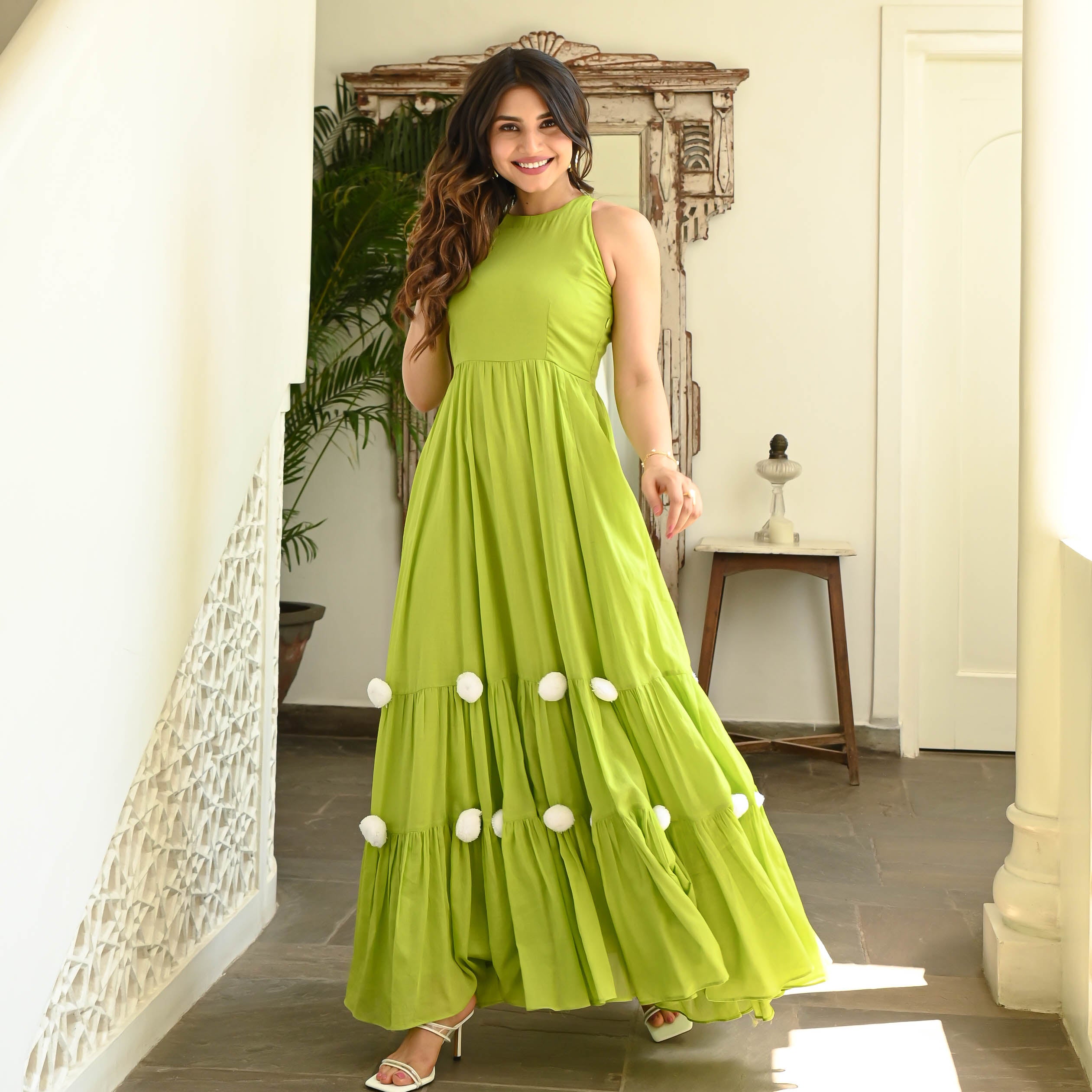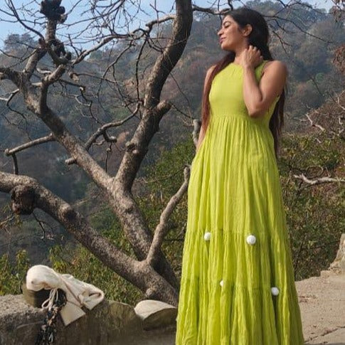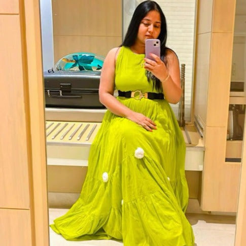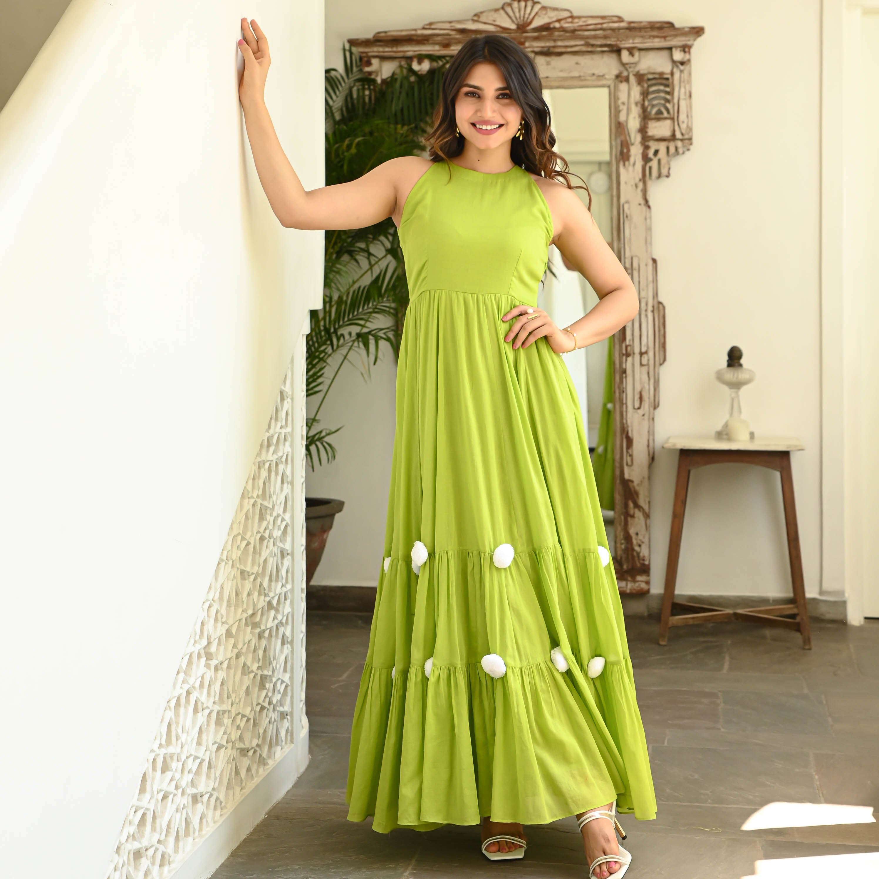 Step into a tropical paradise with the Parrot Green Pompom Dress. Its halter neckline exudes a sense of elegance, while the whimsical white pompoms delicately adorn the vibrant green flare, creating a playful and eye-catching contrast. With the addition of two convenient pockets, this dress combines style and practicality in the most remarkable way. Get ready to turn heads and embrace the spirit of summer with this truly amazing piece of fashion.