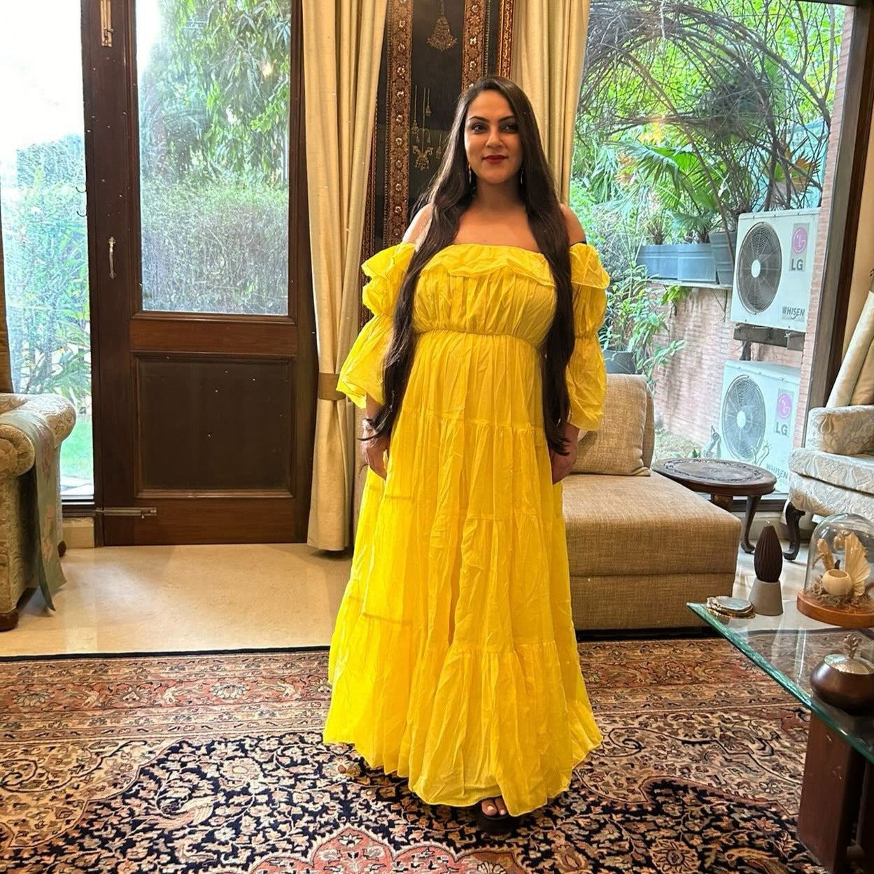 Introducing our Tropical Tango Cotton Dress, a vibrant ode to sunny days and carefree vibes. Crafted from luxurious cotton, this radiant bright yellow maxi dress channels the spirit of a blooming sunflower. Its flirtatious off-the-shoulder neckline adorned with playful frills and charming puffed frilled sleeves exude effortless elegance. With a cinched waistline and a full skirt cascading with tiers, it's a dance of tropical allure wherever you go.