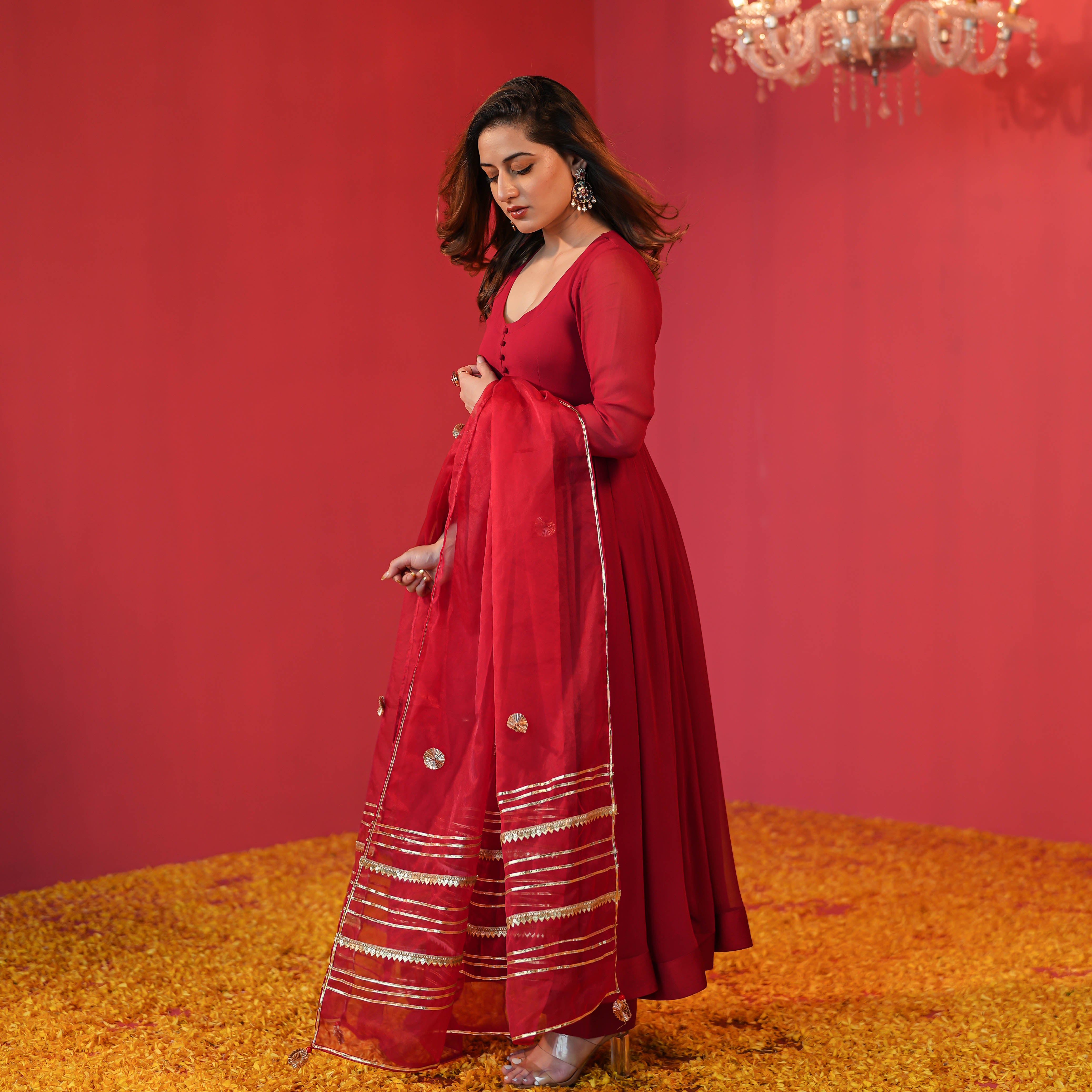 Indulge in opulent elegance with our Maroon Georgette Suit Set. This enchanting ensemble, crafted from rich maroon Georgette fabric, exudes regal charm and sophistication. The set is gracefully completed by a delicate organza dupatta, adding an ethereal touch to your look.