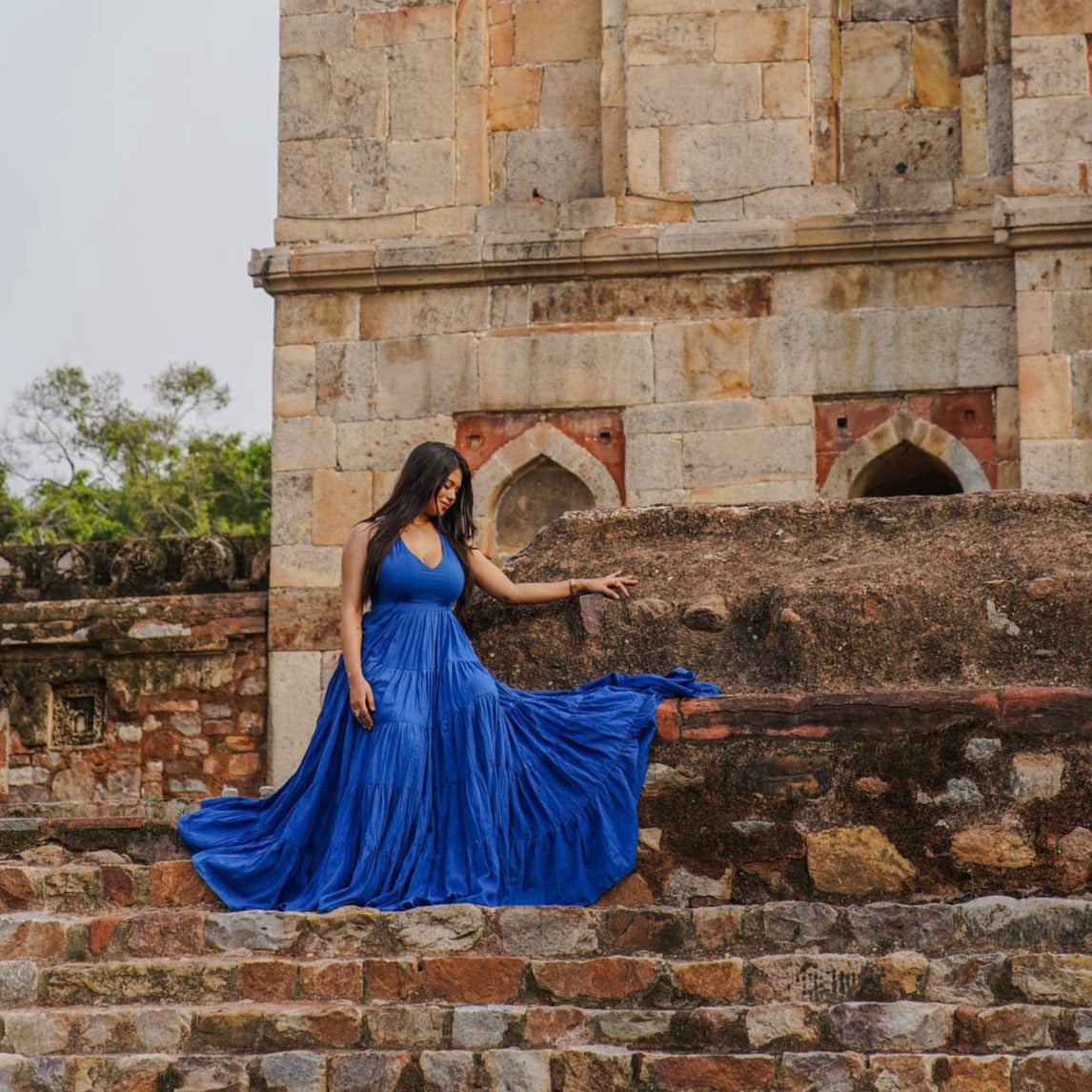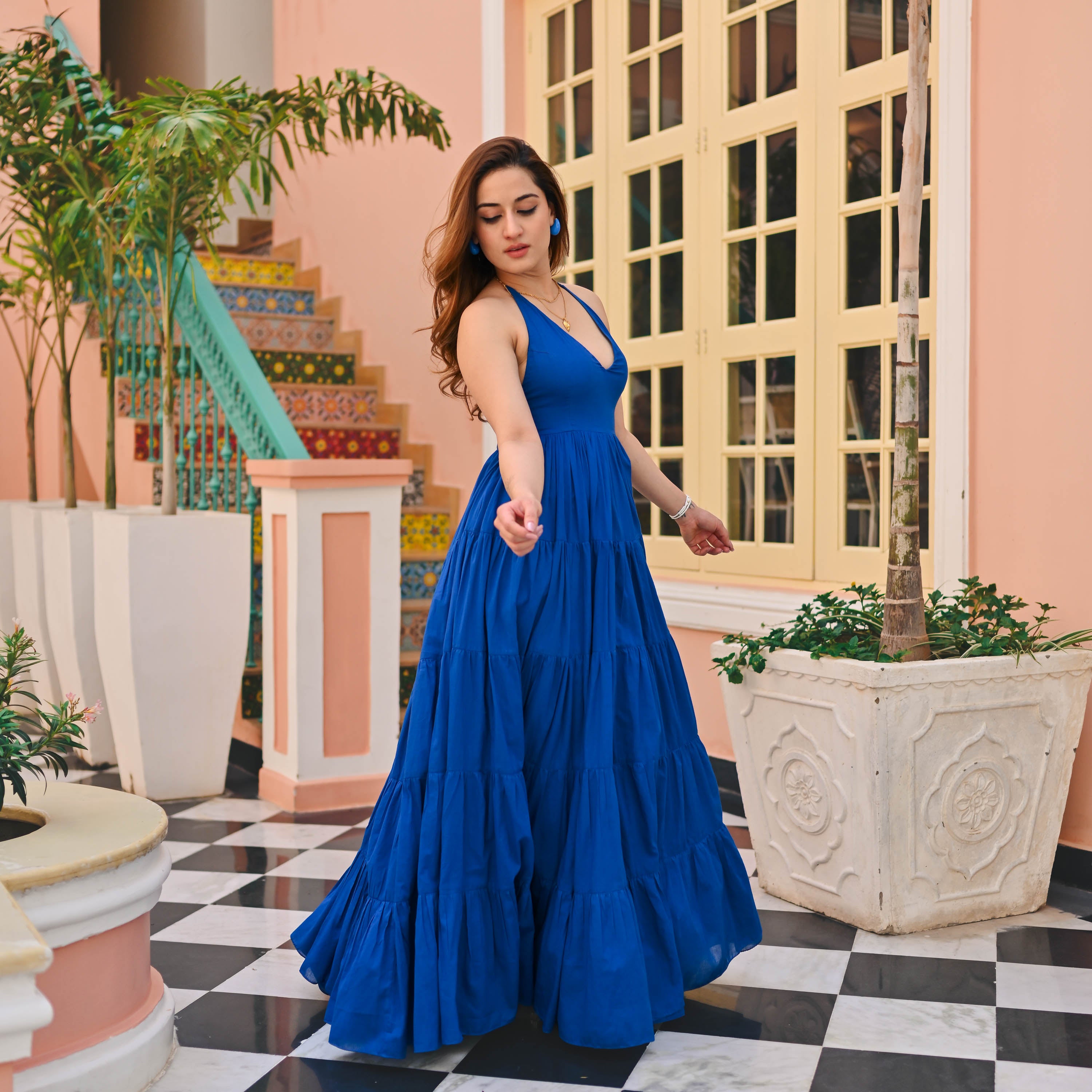 Dive into seaside chic with our Beachy Blush Cotton Dress! This cobalt blue maxi is a head-turner, boasting a deep V halter neckline that adds allure to every wave and breeze. With a cinched waistline and a full skirt cascading into tiers, it's the epitome of beachside elegance. Embrace the sun, sand, and style with this luxurious cotton ensemble!