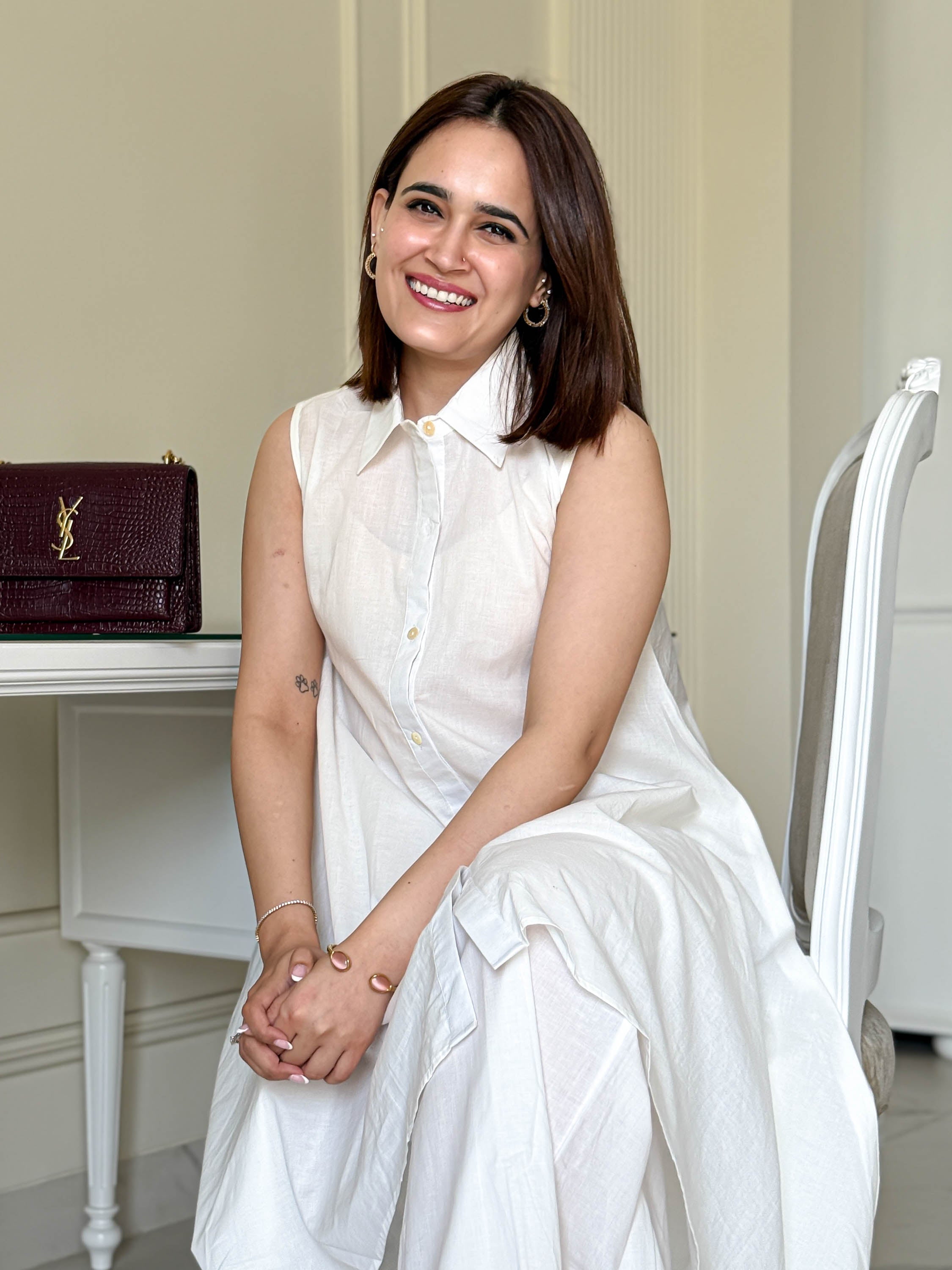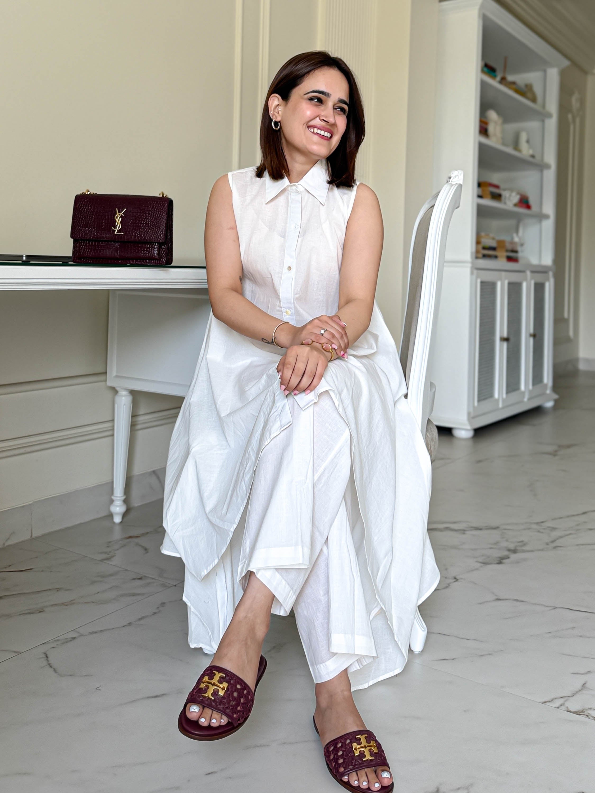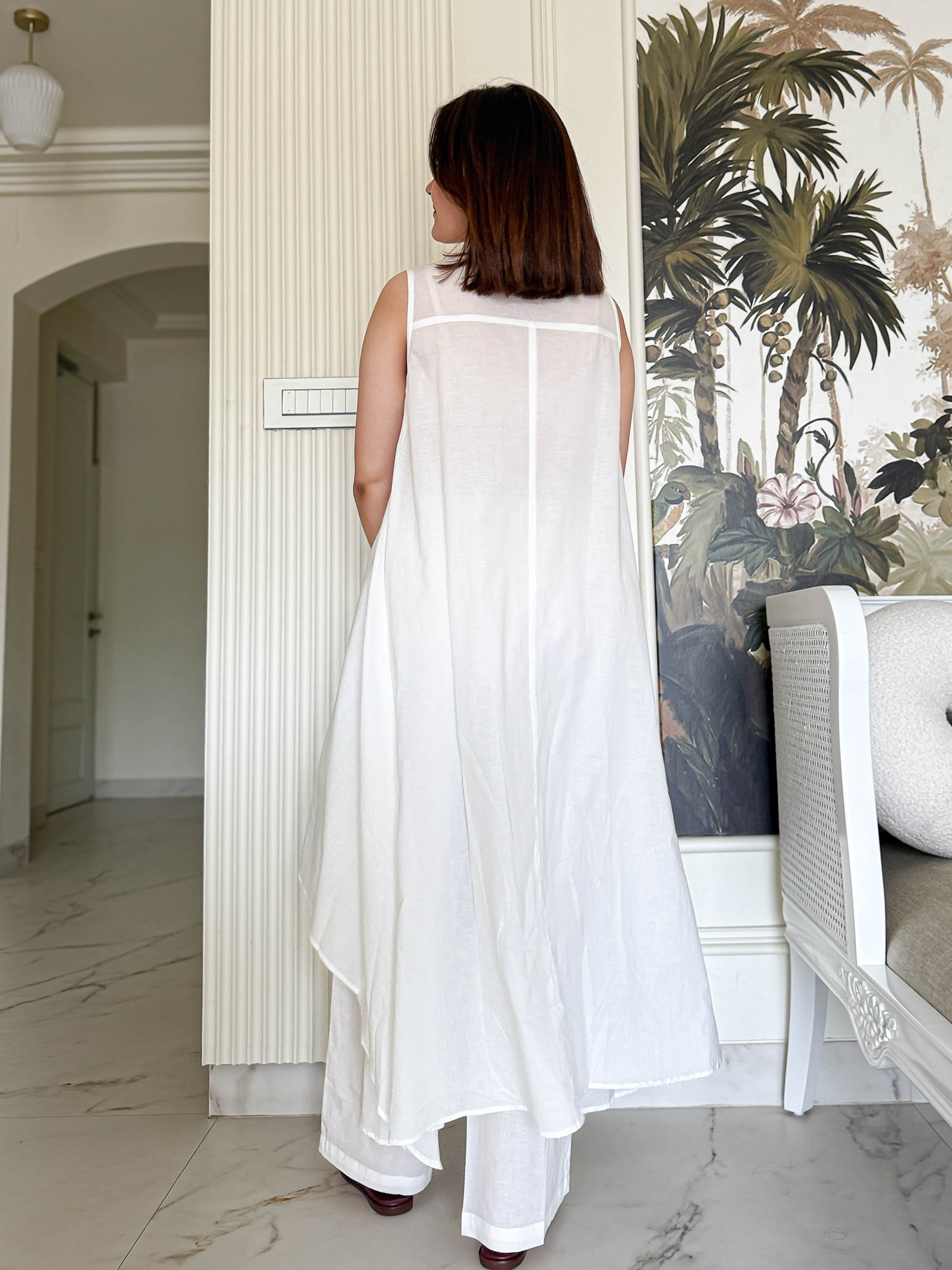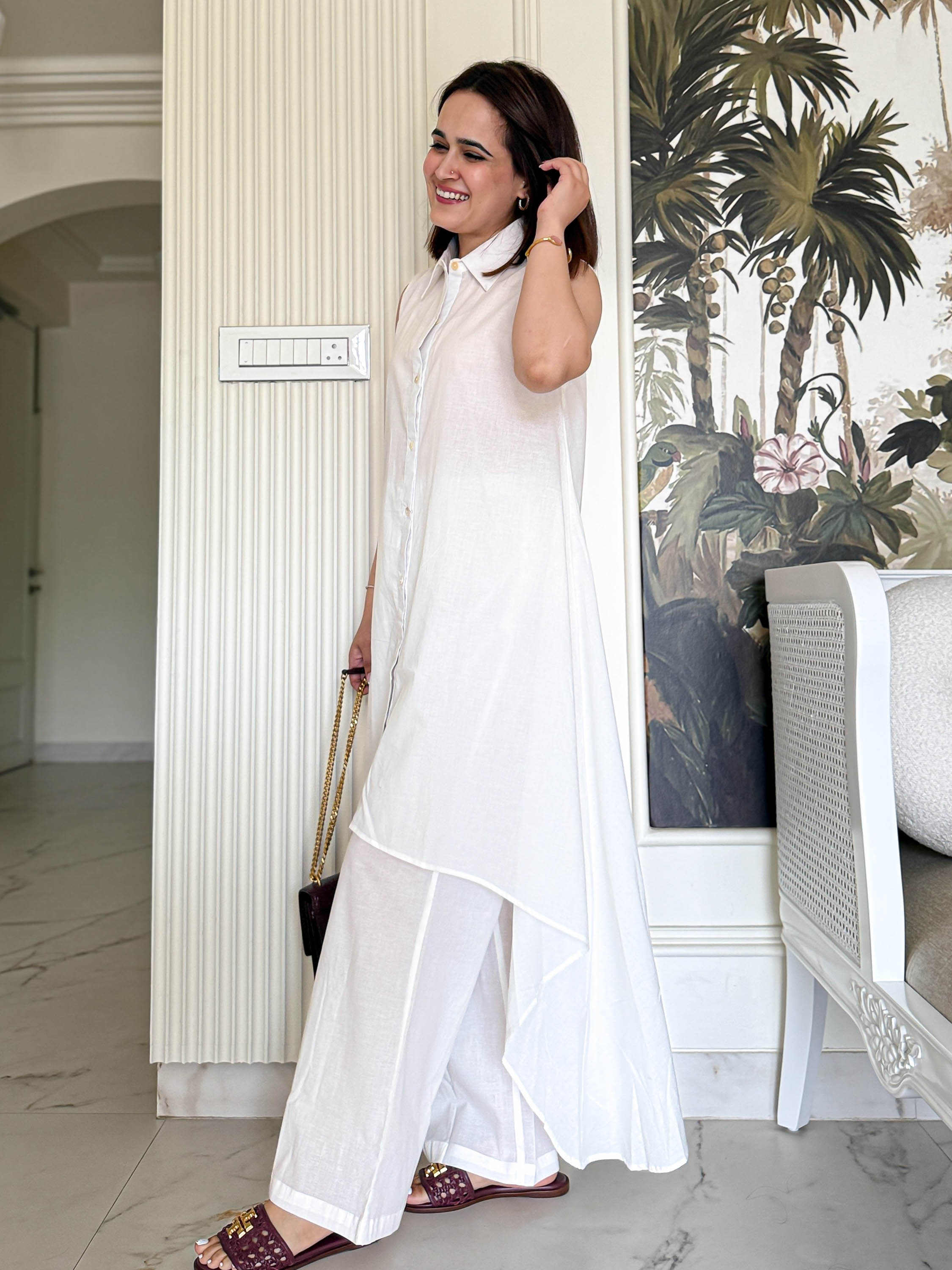 Stay effortlessly stylish in the Bunaai Flair Affair Co-ord Set, crafted in breathable white cotton. The sleeveless, relaxed-fit kurta features a smart collar neck, button-down front placket, and a trendy high-low hemline. Paired with matching pants, this easygoing yet polished set is perfect for casual days when comfort and minimal elegance go hand in hand.