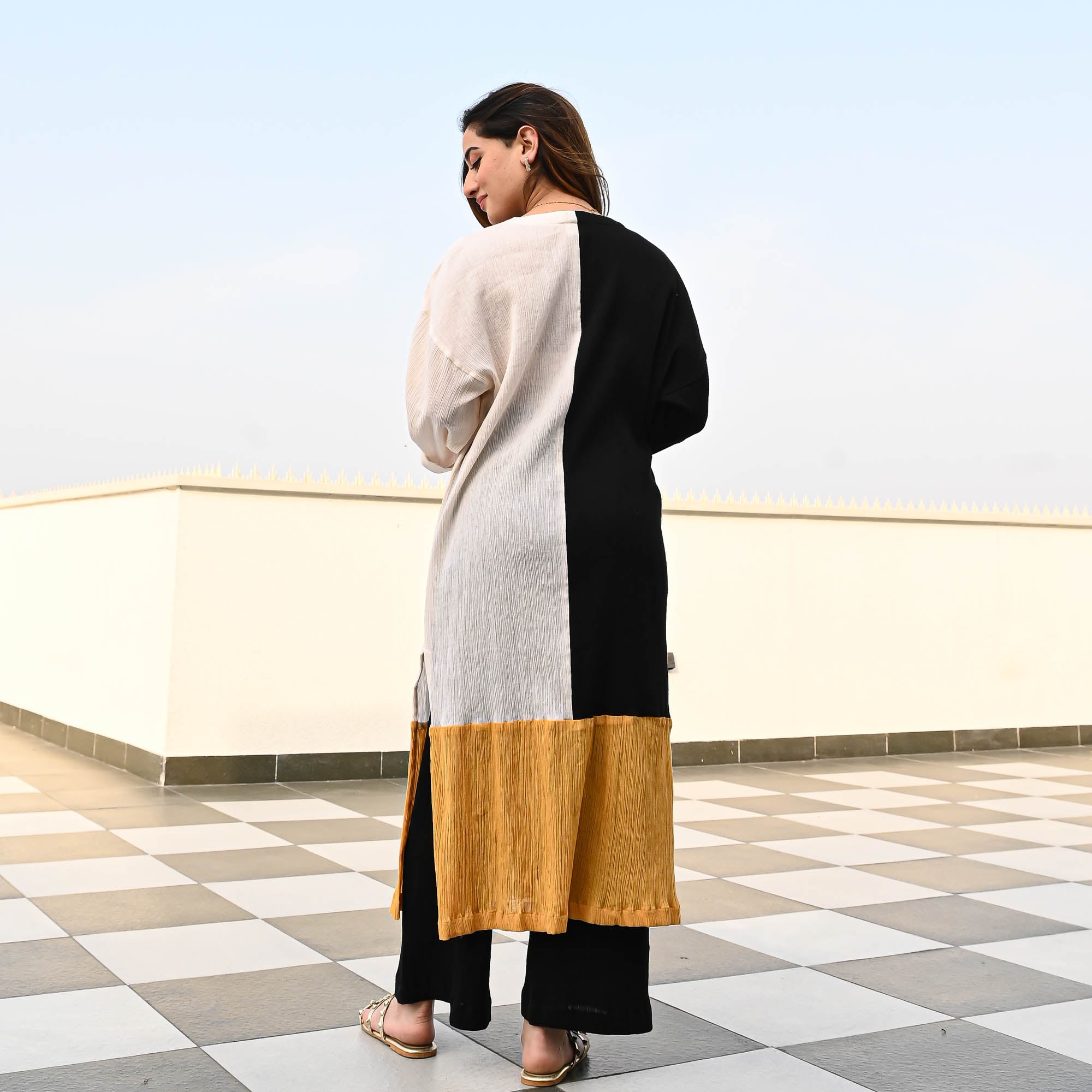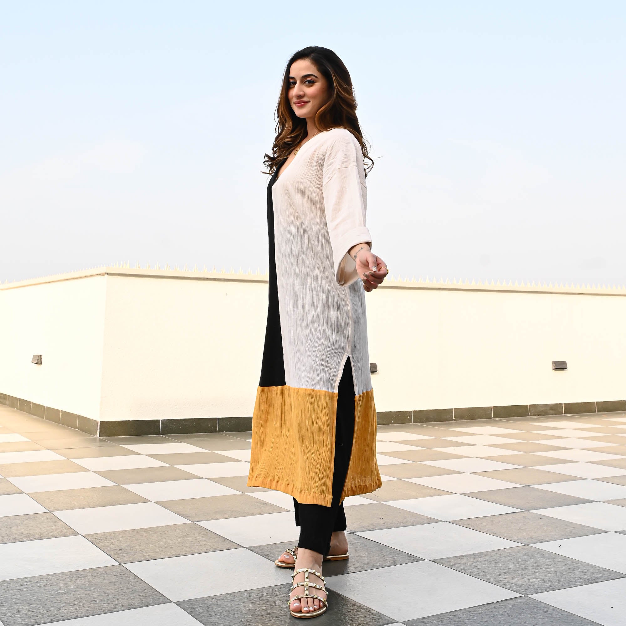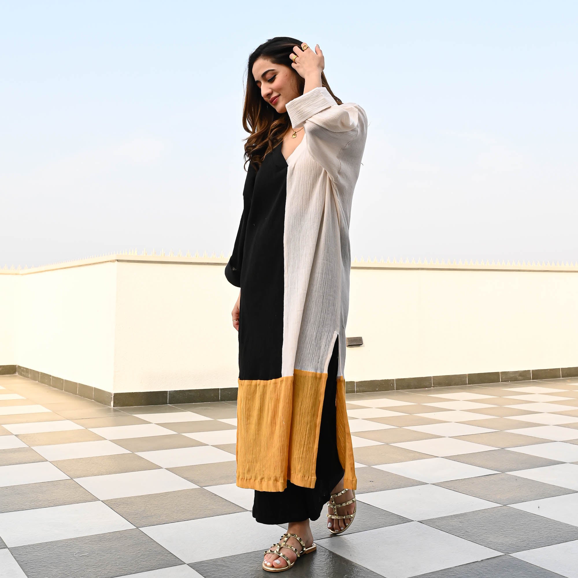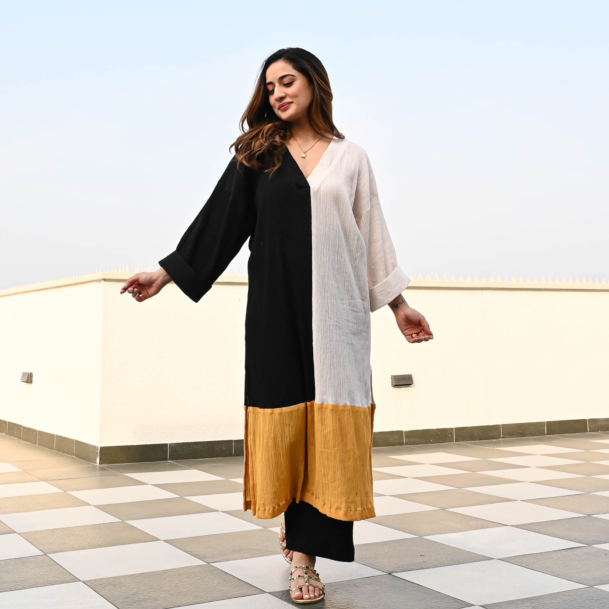Make a striking statement with our Color Block Crushed Cotton Coord Set. This exquisite ensemble boasts a colorblocked relaxed fit kurta adorned with captivating black, white, and mustard hues. The V-neckline adds a touch of allure, while the three-quarter cuffed sleeves exude sophistication. Paired flawlessly with matching pants, this co-ord set offers a perfect blend of style and comfort. Whether you're stepping out for a casual gathering or a special event, this ensemble is sure to command attention and elevate your look. Embrace the boldness of color blocking and let your fashion sense shine with this stunning addition to your wardrobe.