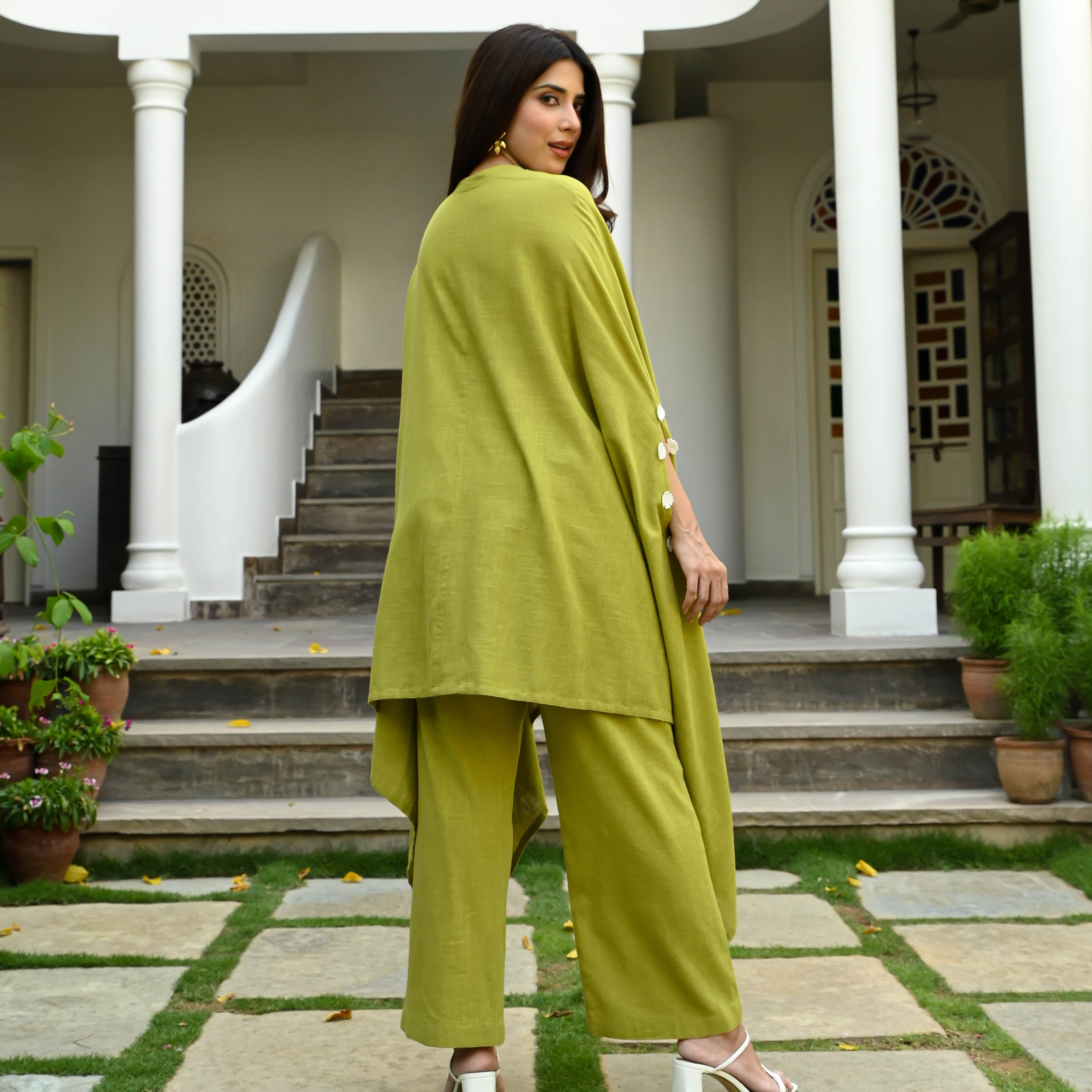 Unveiling our Cotton Blossom Co-ord Set, perfect for adding a touch of floral elegance to your wardrobe! This stunning set features a vibrant mustard green asymmetric kurta with a flattering V-neckline and intricate white flower detailing on the front buttons and sleeves. The straight pants add a modern edge to the classic silhouette. This set is perfect for any occasion, from brunch with friends to a day out shopping. Don't miss out on this blooming beauty!
