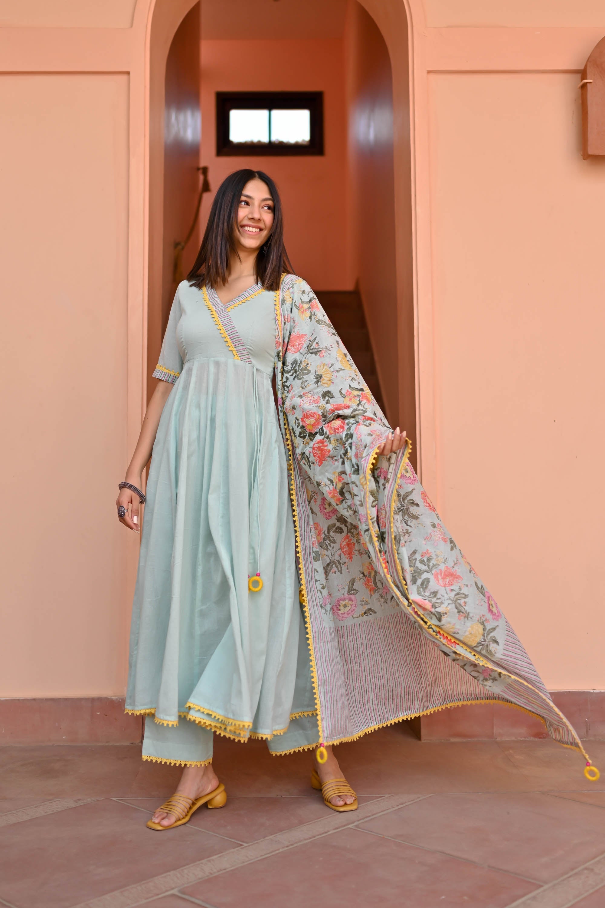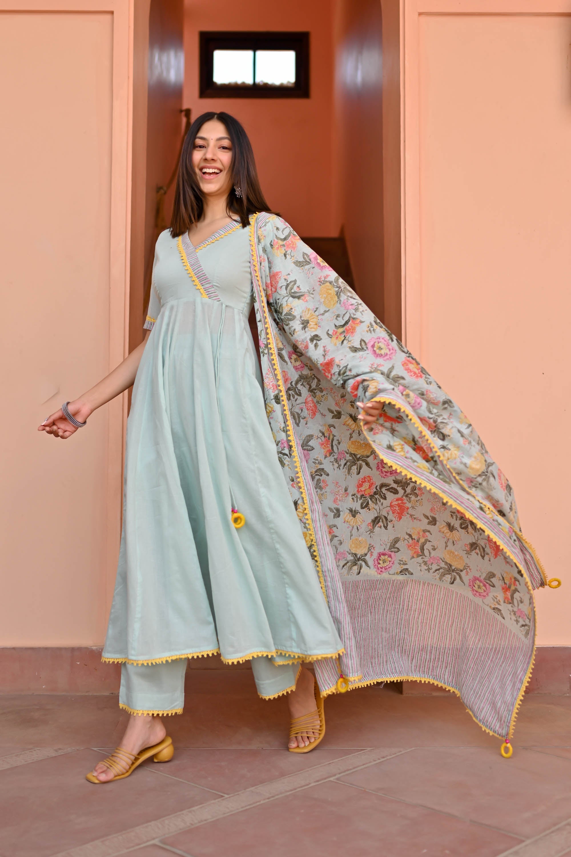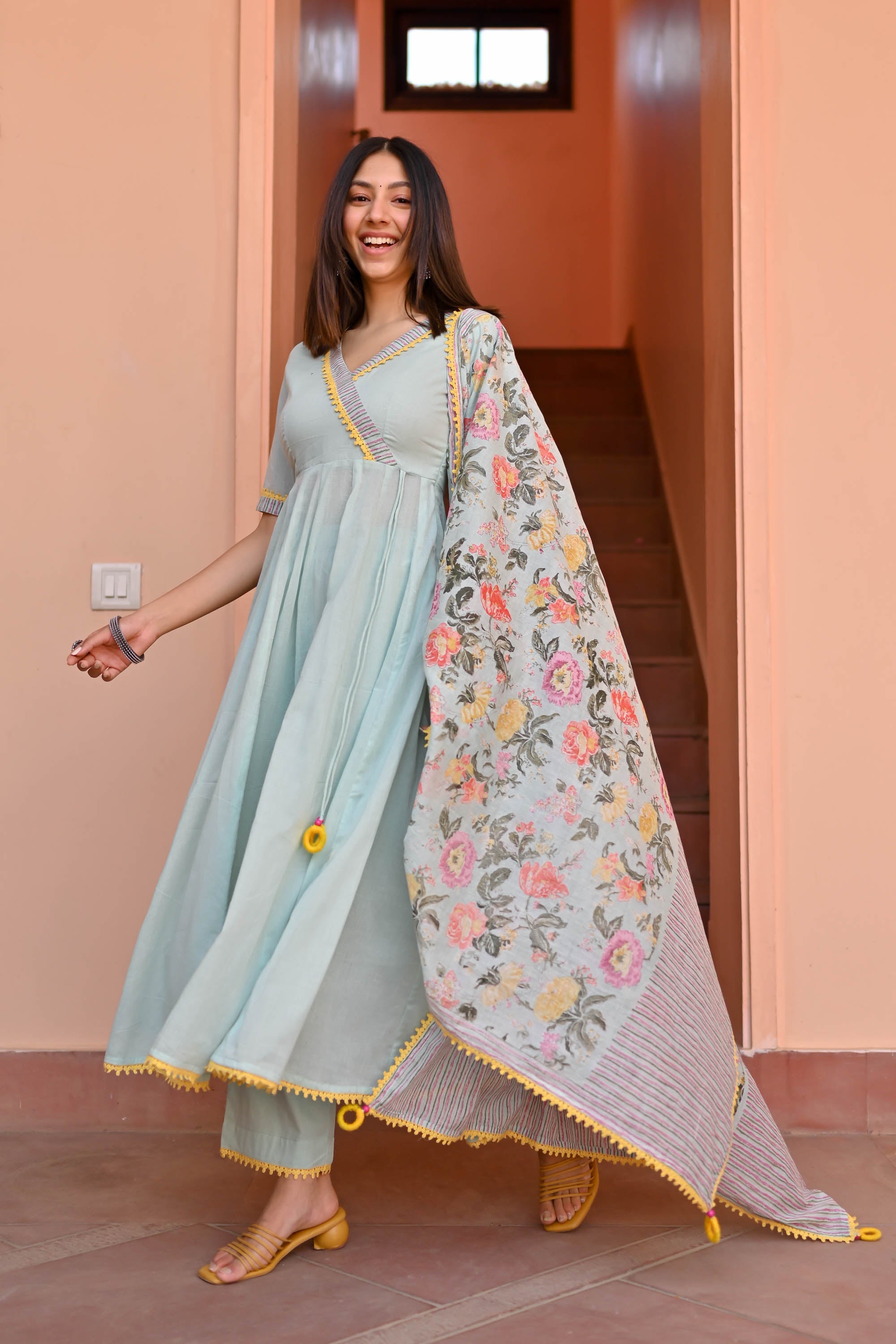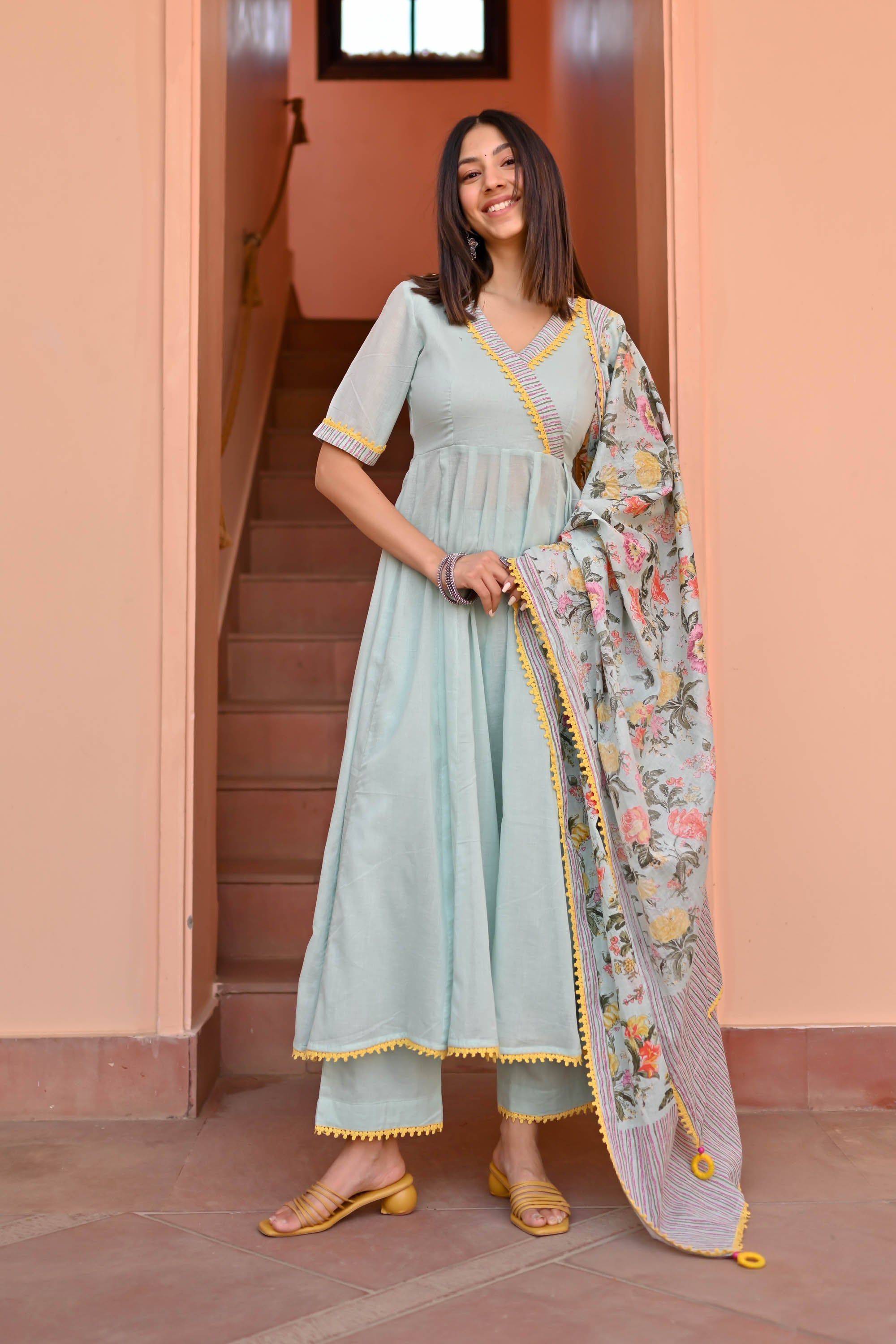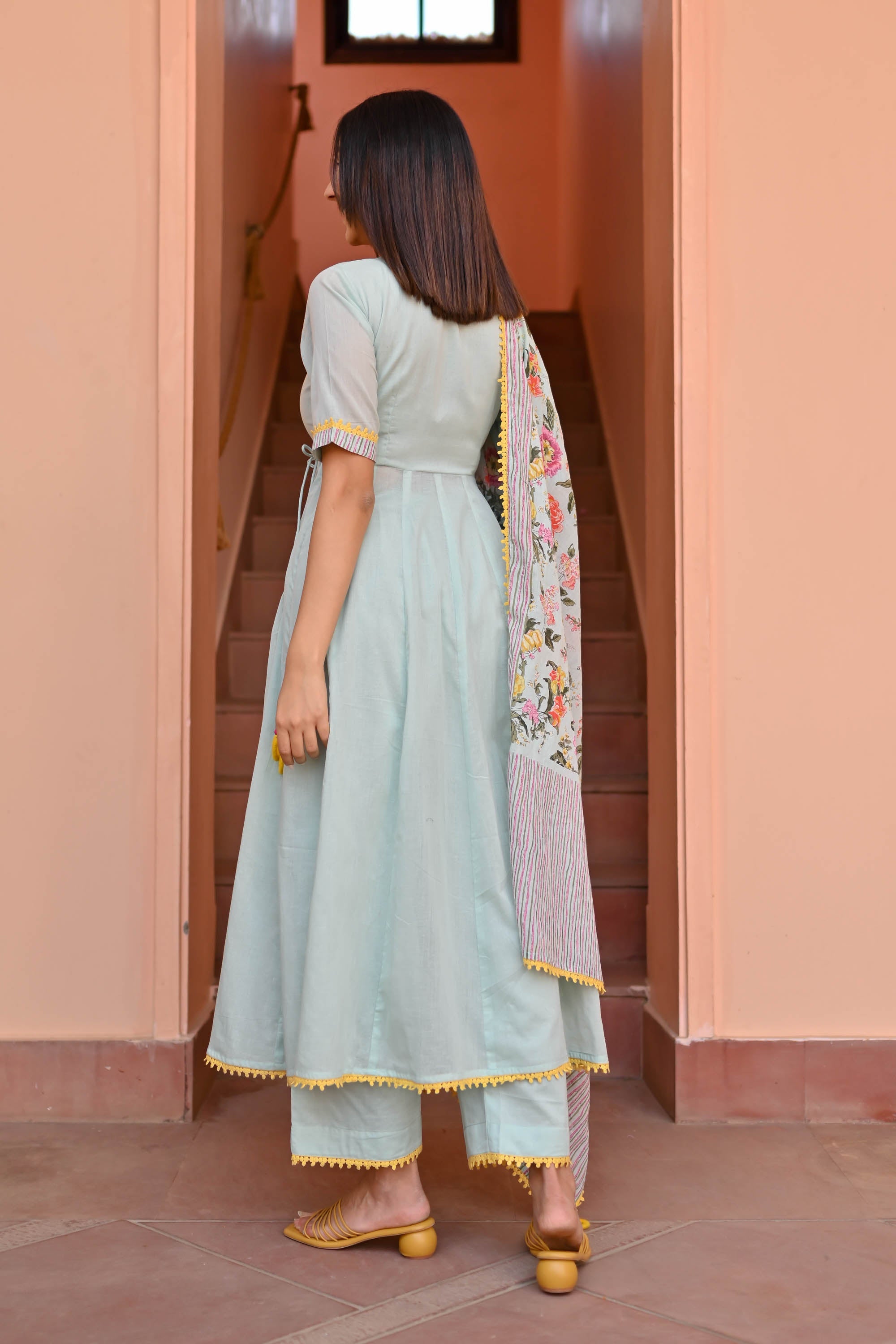 Introducing the Dew Cotton Suit Set Of 3, a masterpiece of luxury. Crafted from premium cotton, its sky-blue hues exude elegance. The angrakha pattern yoke with contrasting panel detailing, dori with tassel detailing under the yoke, and elbow-length sleeves with contrasting panels elevate its charm. Paired with matching pants and a floral printed dupatta, this ensemble epitomizes timeless grace with a contemporary flair.