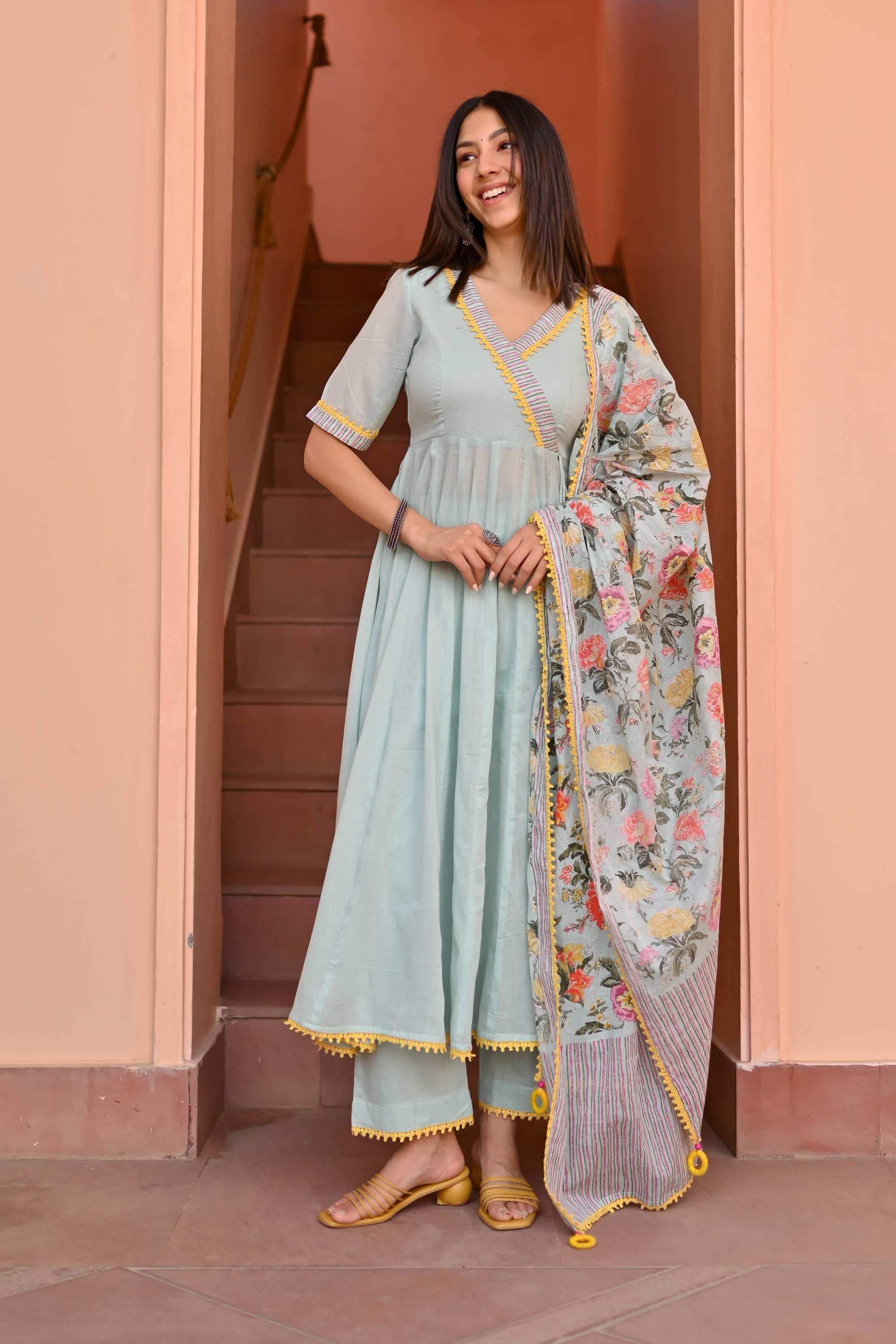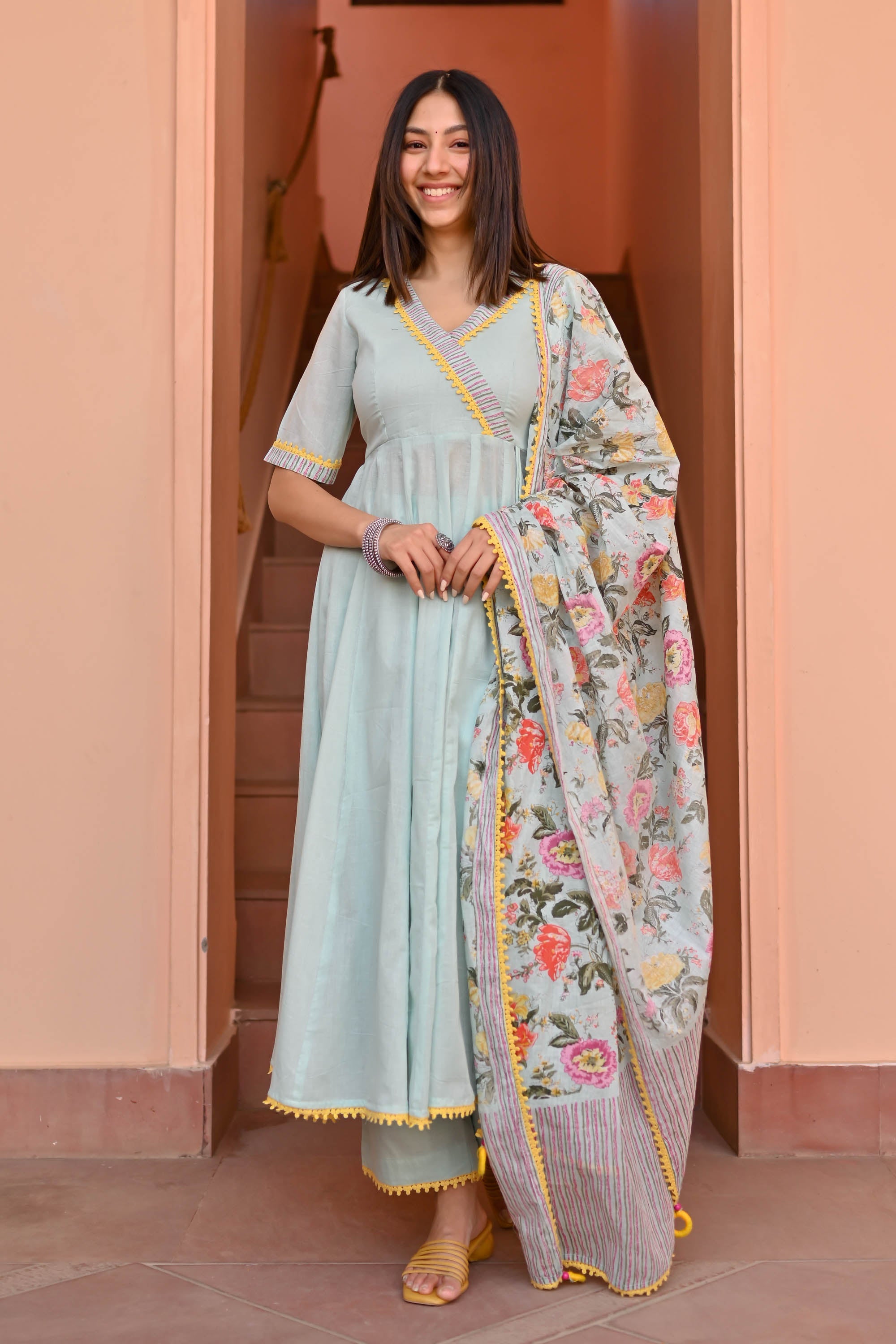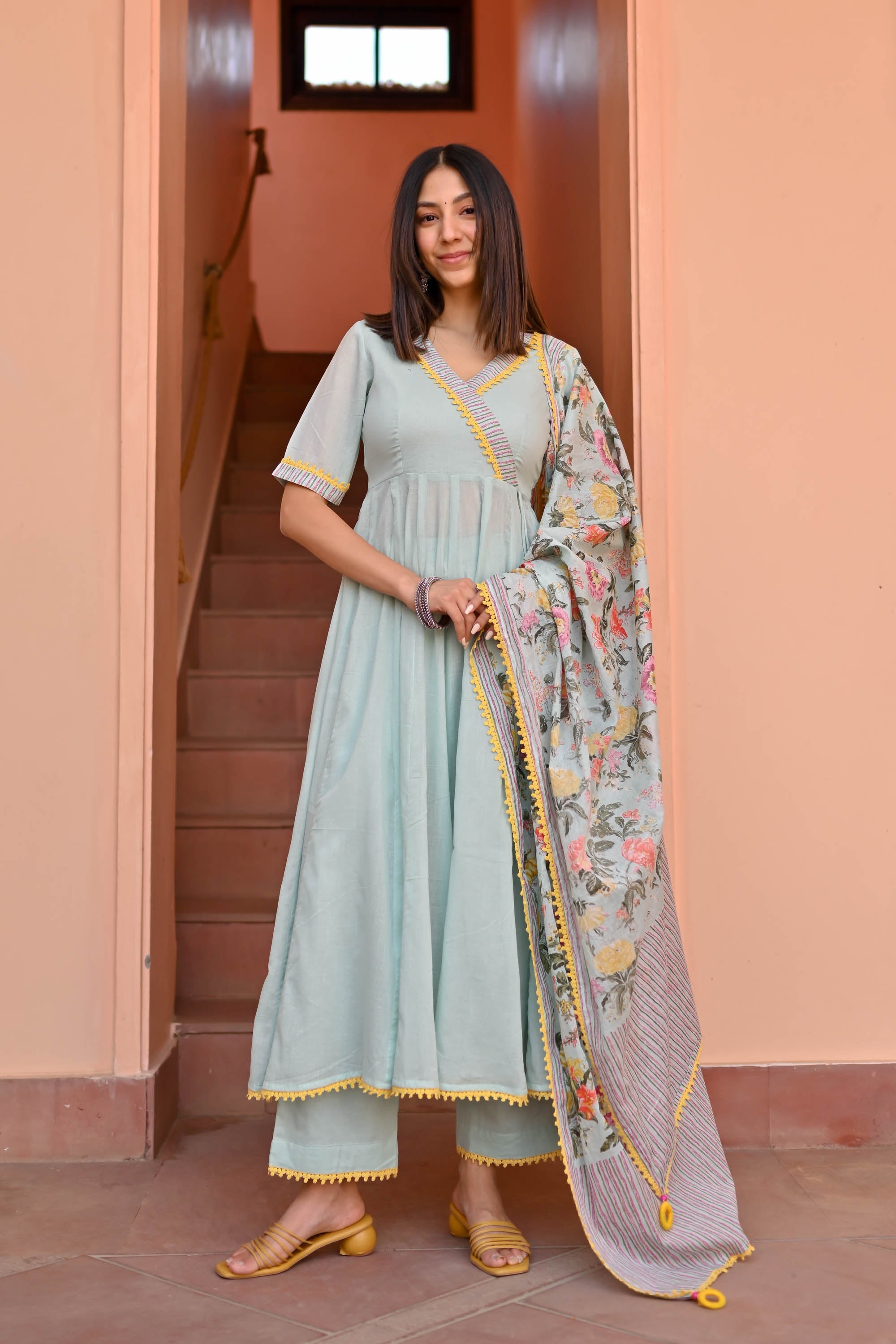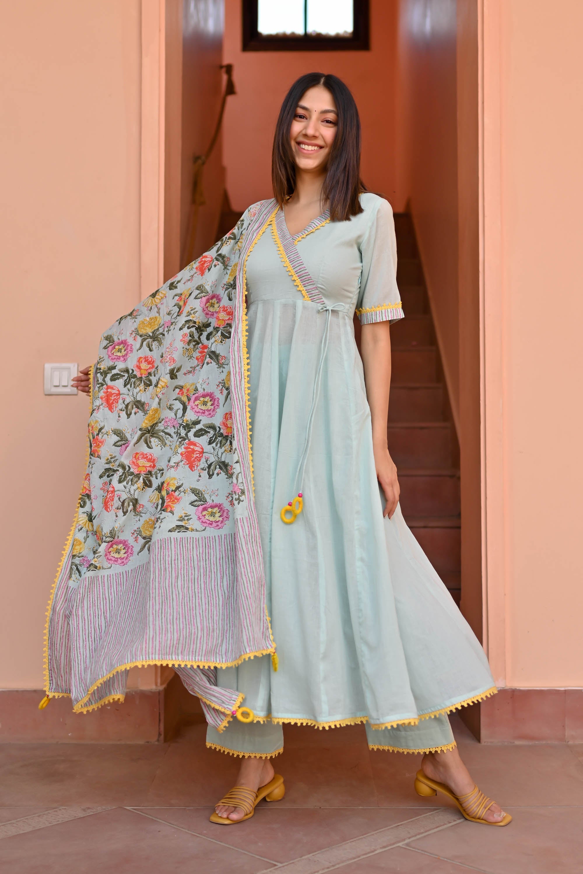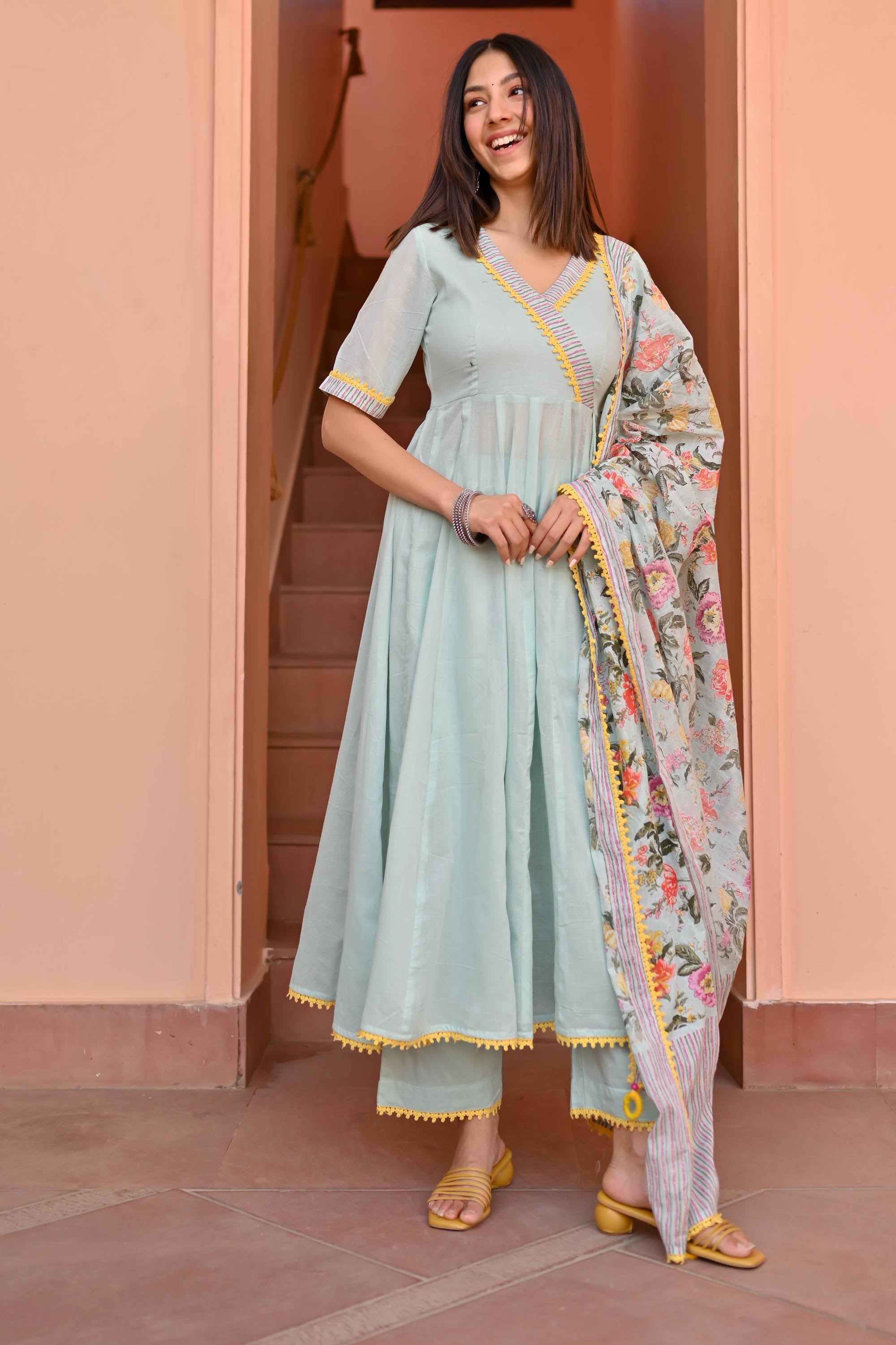 Introducing the Dew Cotton Suit Set Of 3, a masterpiece of luxury. Crafted from premium cotton, its sky-blue hues exude elegance. The angrakha pattern yoke with contrasting panel detailing, dori with tassel detailing under the yoke, and elbow-length sleeves with contrasting panels elevate its charm. Paired with matching pants and a floral printed dupatta, this ensemble epitomizes timeless grace with a contemporary flair.