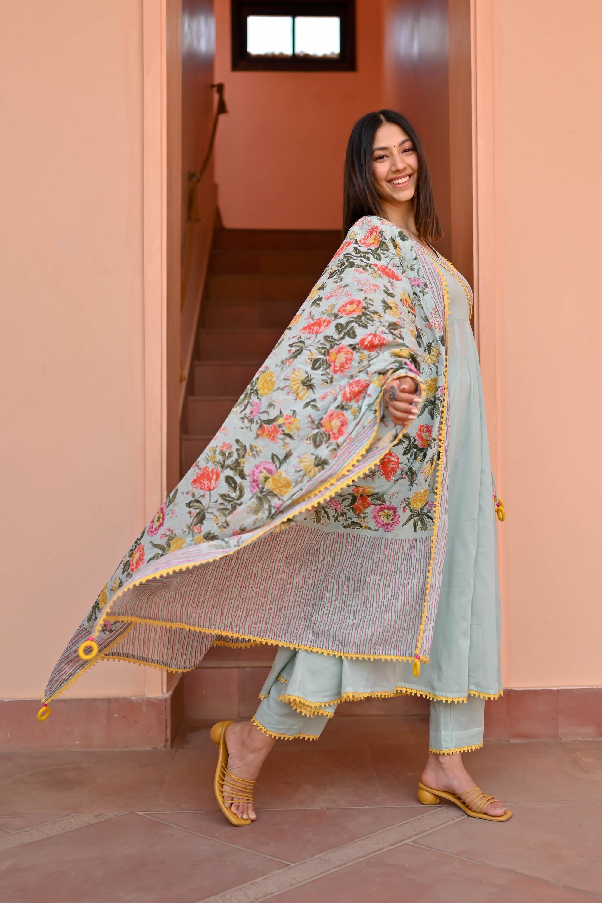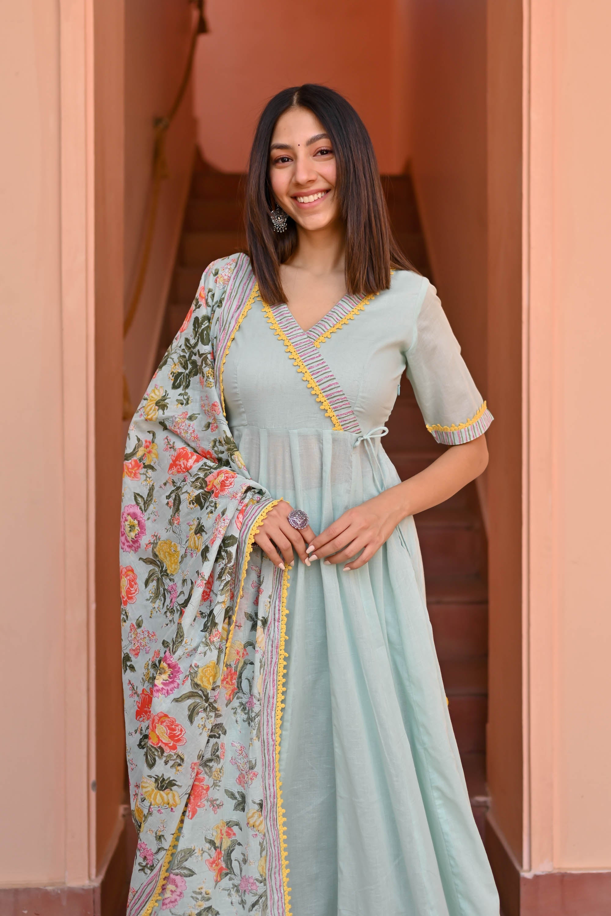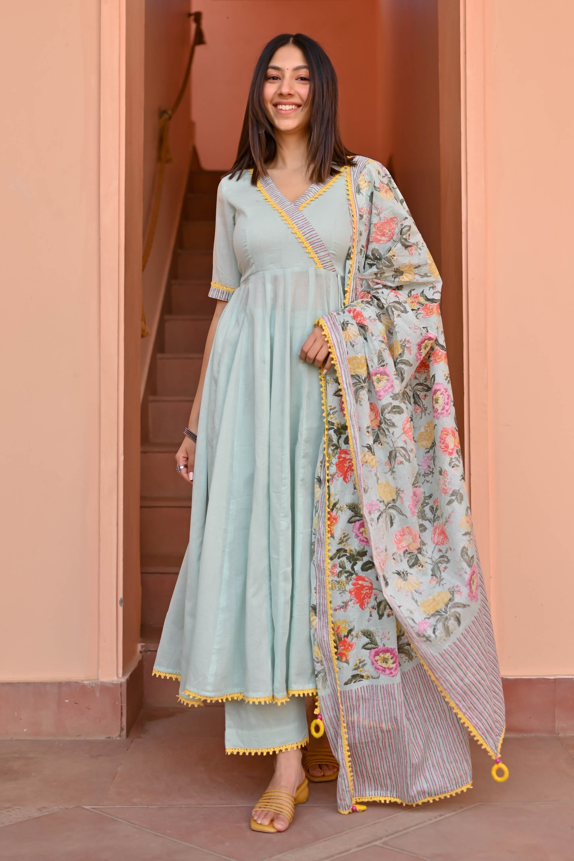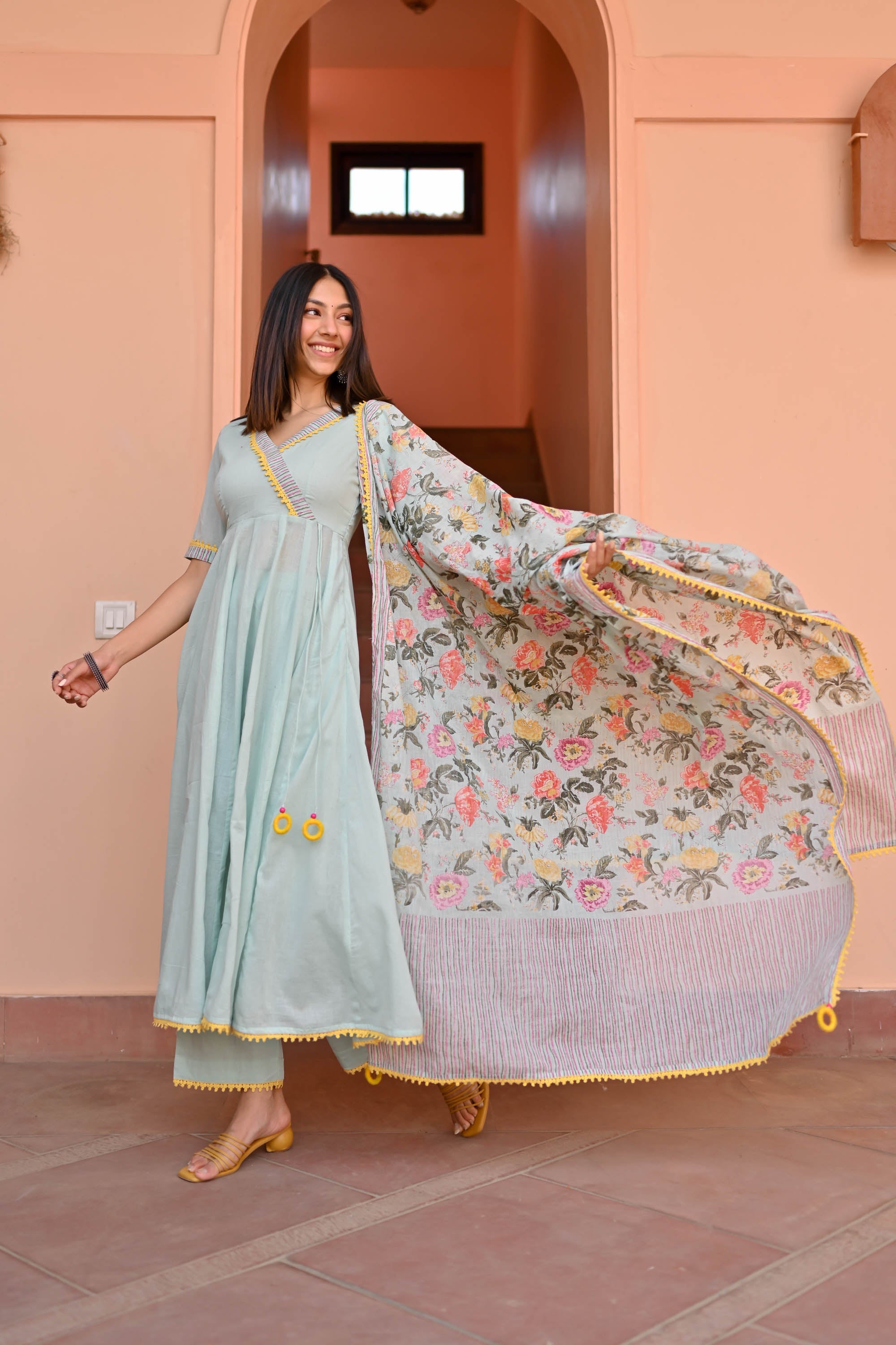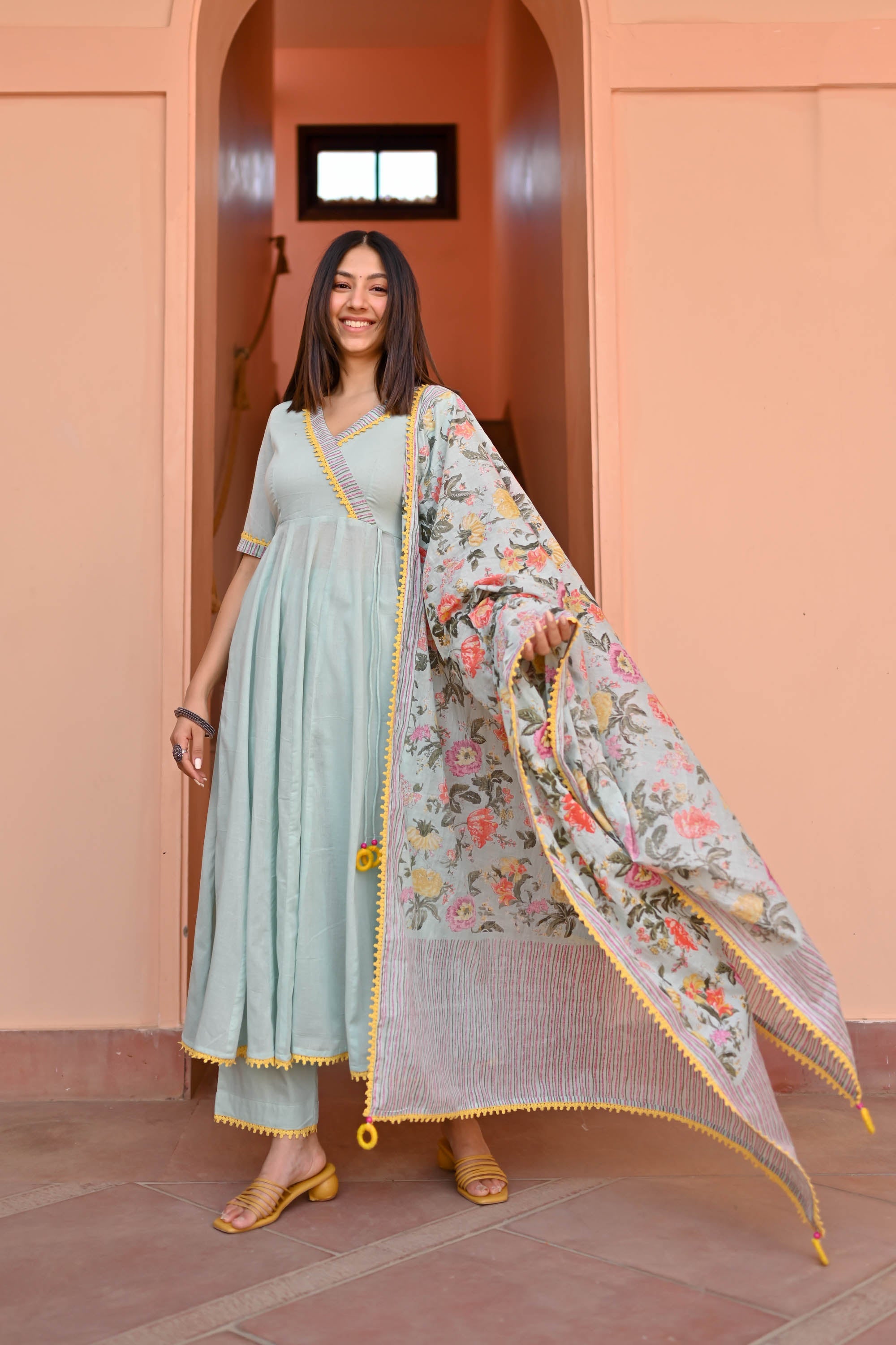Introducing the Dew Cotton Suit Set Of 3, a masterpiece of luxury. Crafted from premium cotton, its sky-blue hues exude elegance. The angrakha pattern yoke with contrasting panel detailing, dori with tassel detailing under the yoke, and elbow-length sleeves with contrasting panels elevate its charm. Paired with matching pants and a floral printed dupatta, this ensemble epitomizes timeless grace with a contemporary flair.