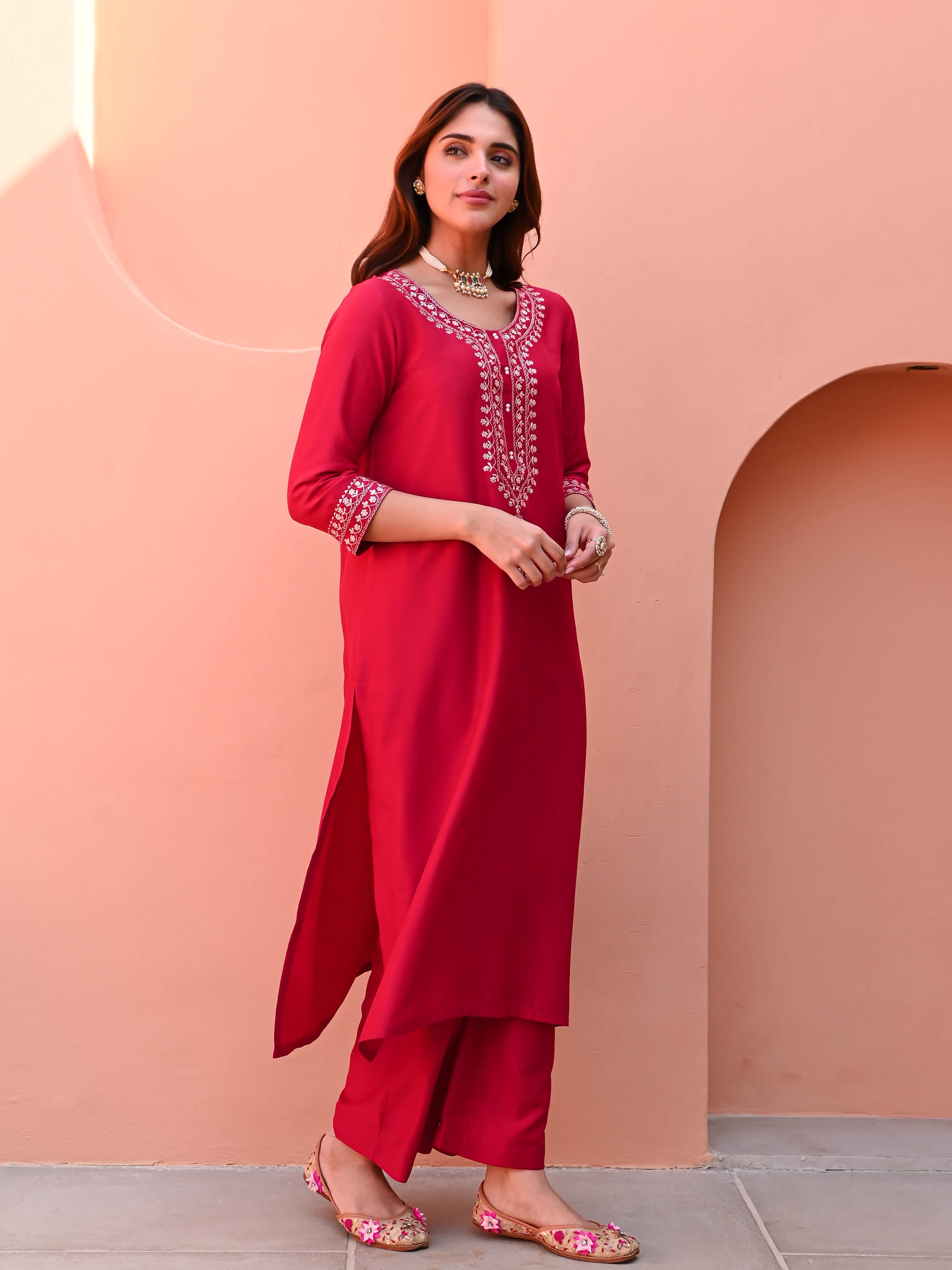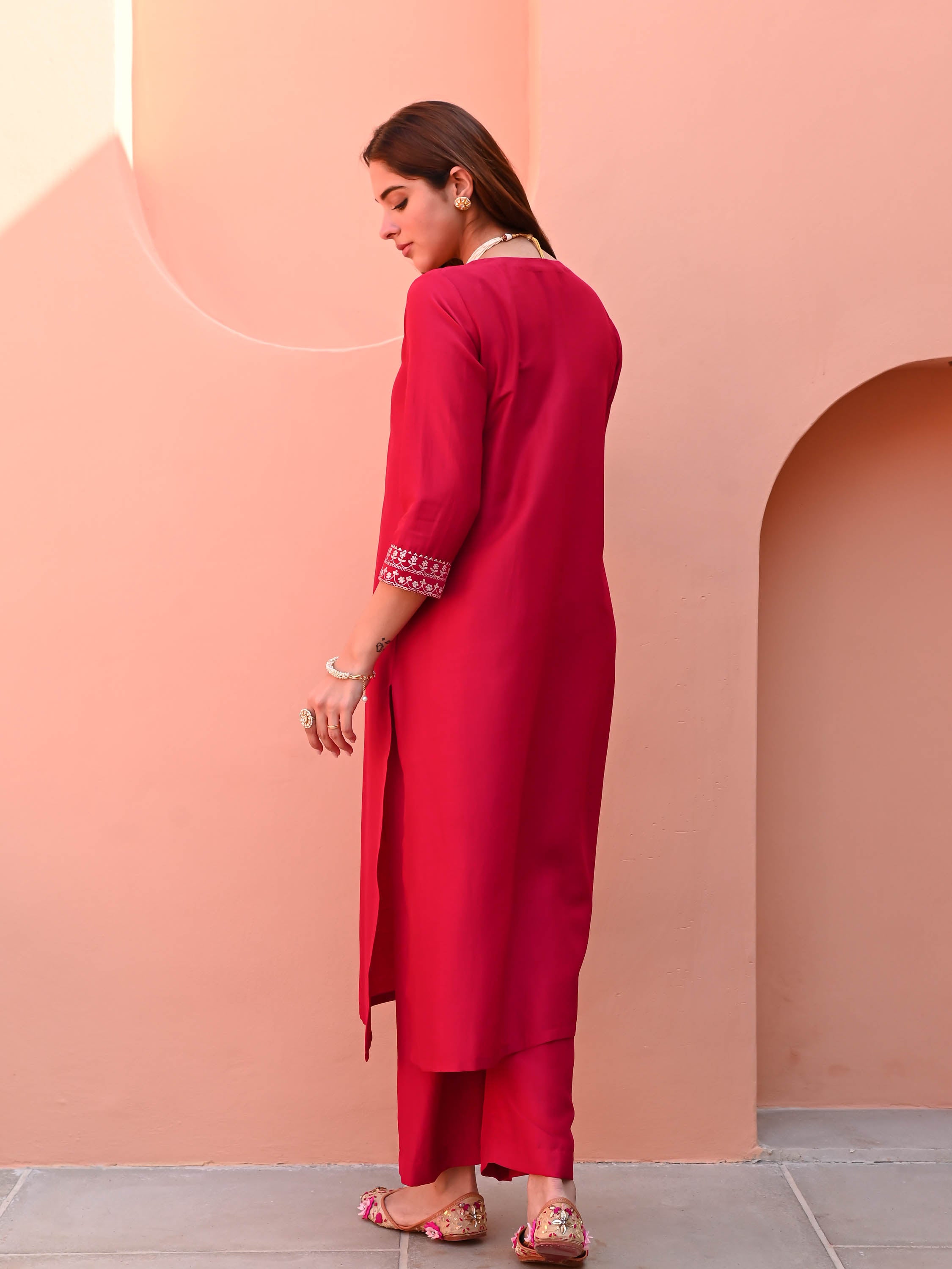 Embrace elegance with our Hibiscus Pink Kurta Set. Crafted from soft chinon silk in a vibrant pink hue, this straight-fit kurta features a round neckline and delicate embroidery on the front yoke. The three-quarter sleeves add a touch of grace, while the matching pants ensure a coordinated, effortless look. Perfect for festive and casual gatherings alike.