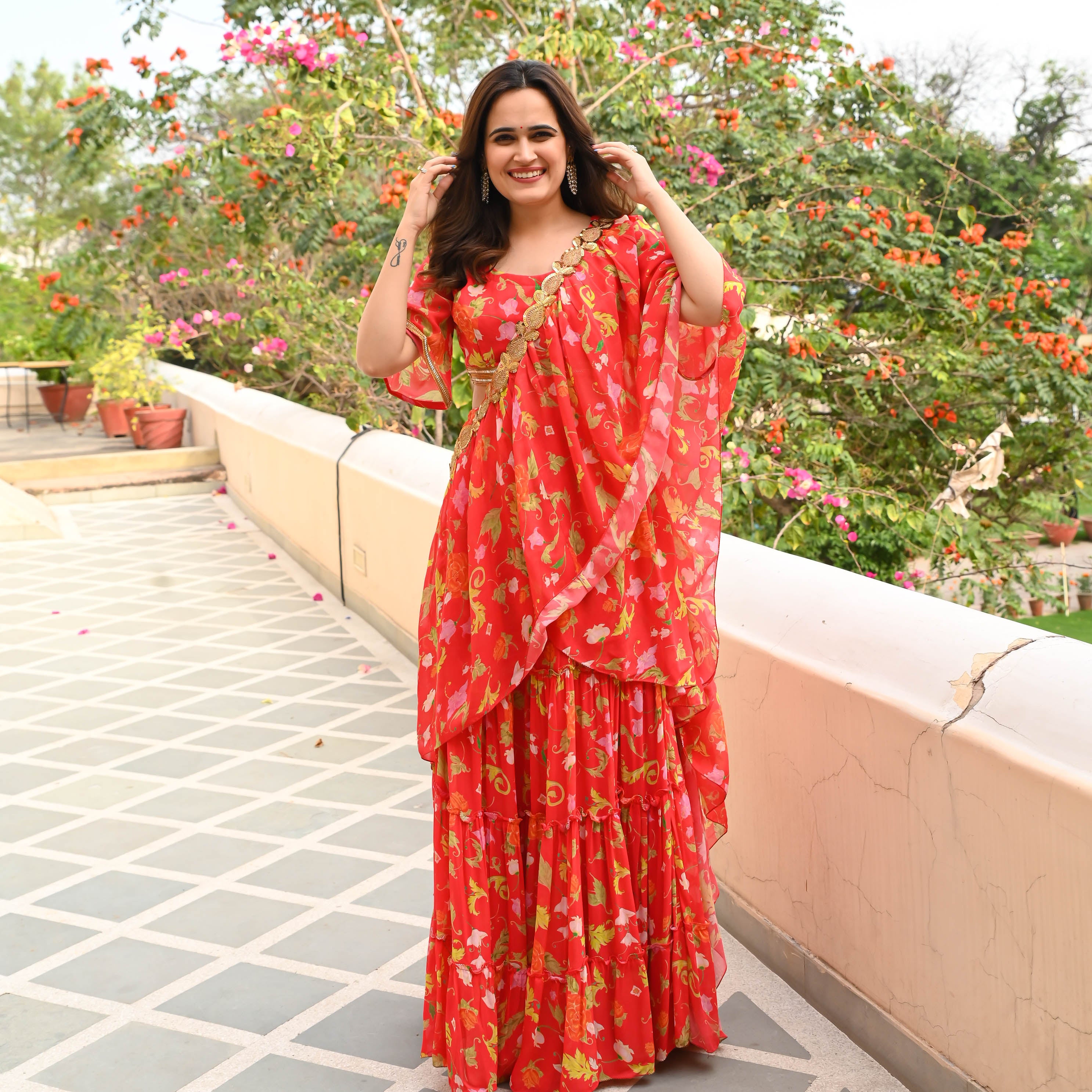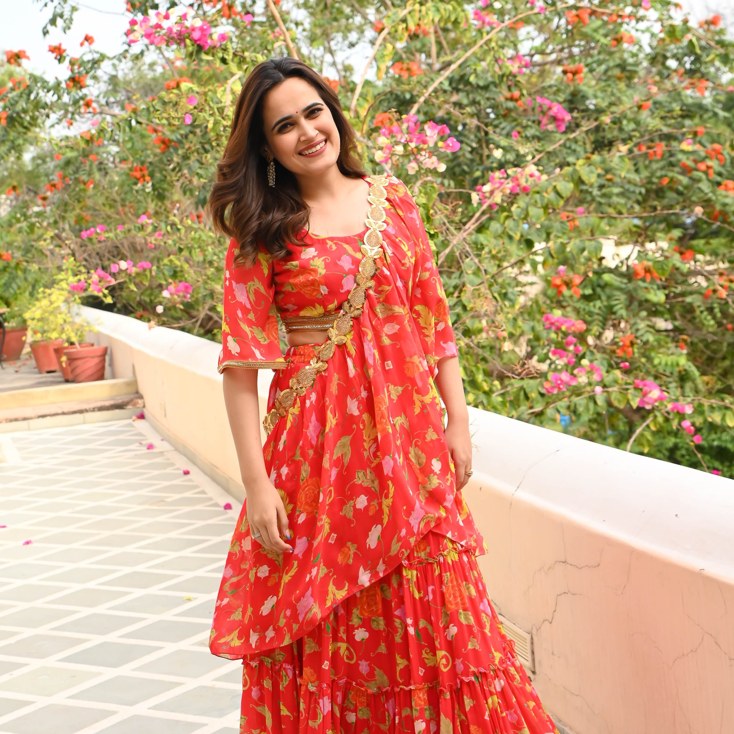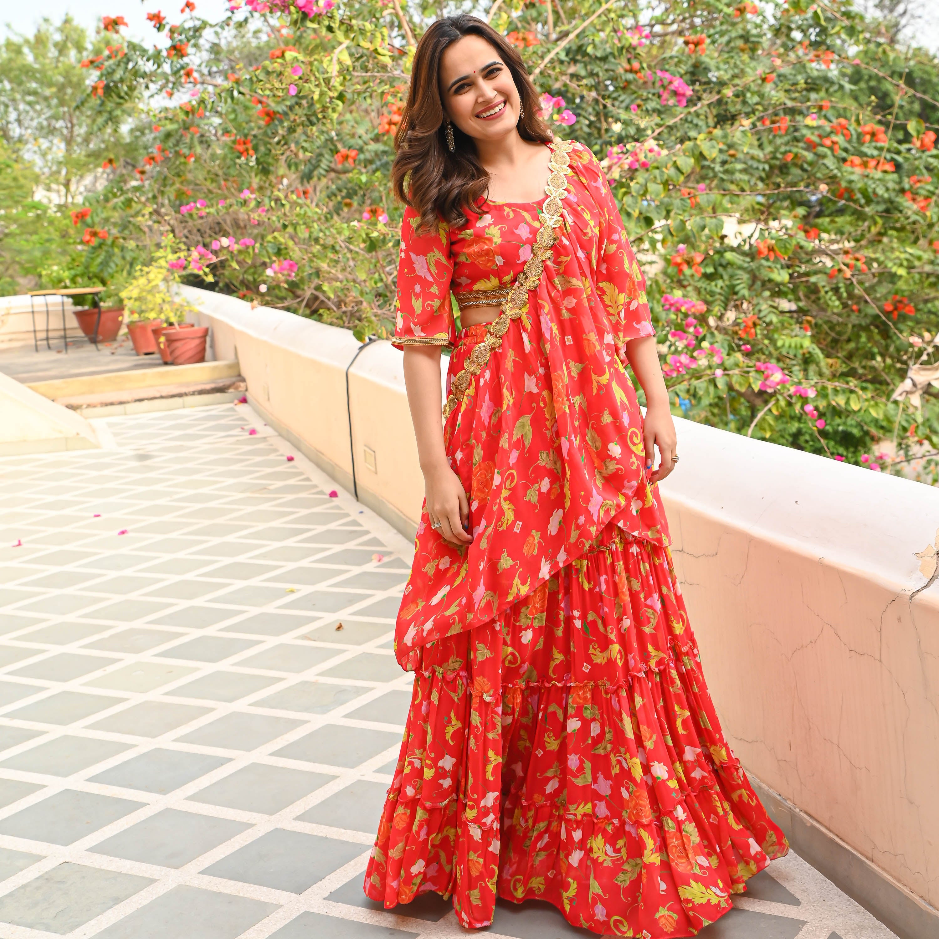Looking to add some spice to your Saree collection? The Nargis Floral Draped Saree is here to save the day. This Saree is all about making a statement. With its vibrant red hue, you'll be the fiery goddess everyone can't help but admire. And the floral print is like a garden party on your Saree, giving off a fun and playful vibe. But the Nargis Floral Draped Saree isn't just about looks. Its luxurious fabric drapes effortlessly over your curves, making you feel comfortable and confident all day long. And the bright red colour is sure to make you feel bold and empowered, ready to take on the world.
