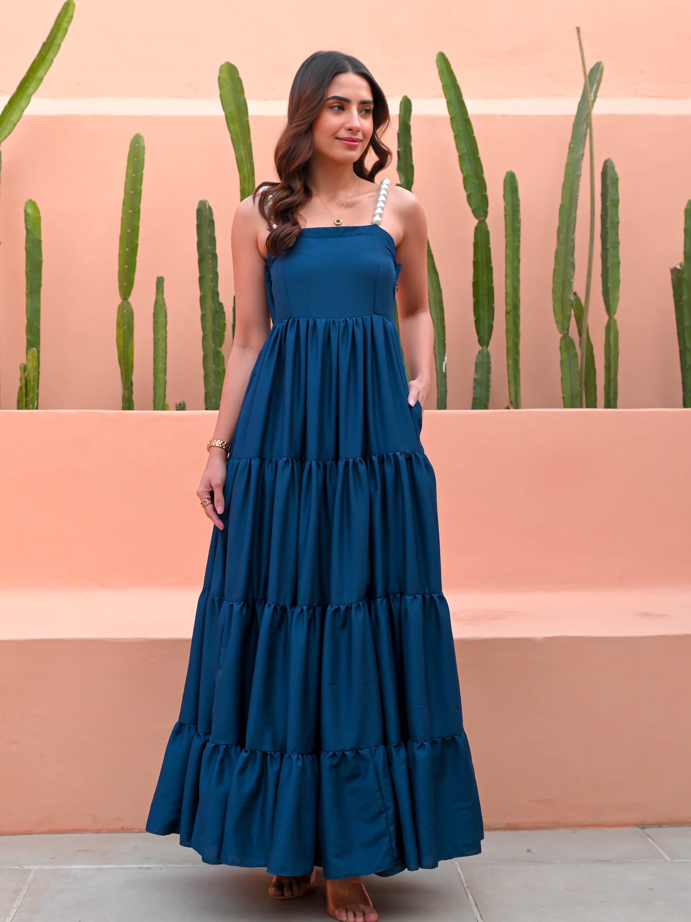 Make a statement with our Nebule Blue Tiered Dress. Crafted from luxurious blue chinon silk, this strappy dress features elegant big pearl straps and a sleek straight neckline. The tiered full skirt adds volume and movement, creating a graceful silhouette. Perfect for evening soirées and special occasions, this dress blends elegance with modern charm.
