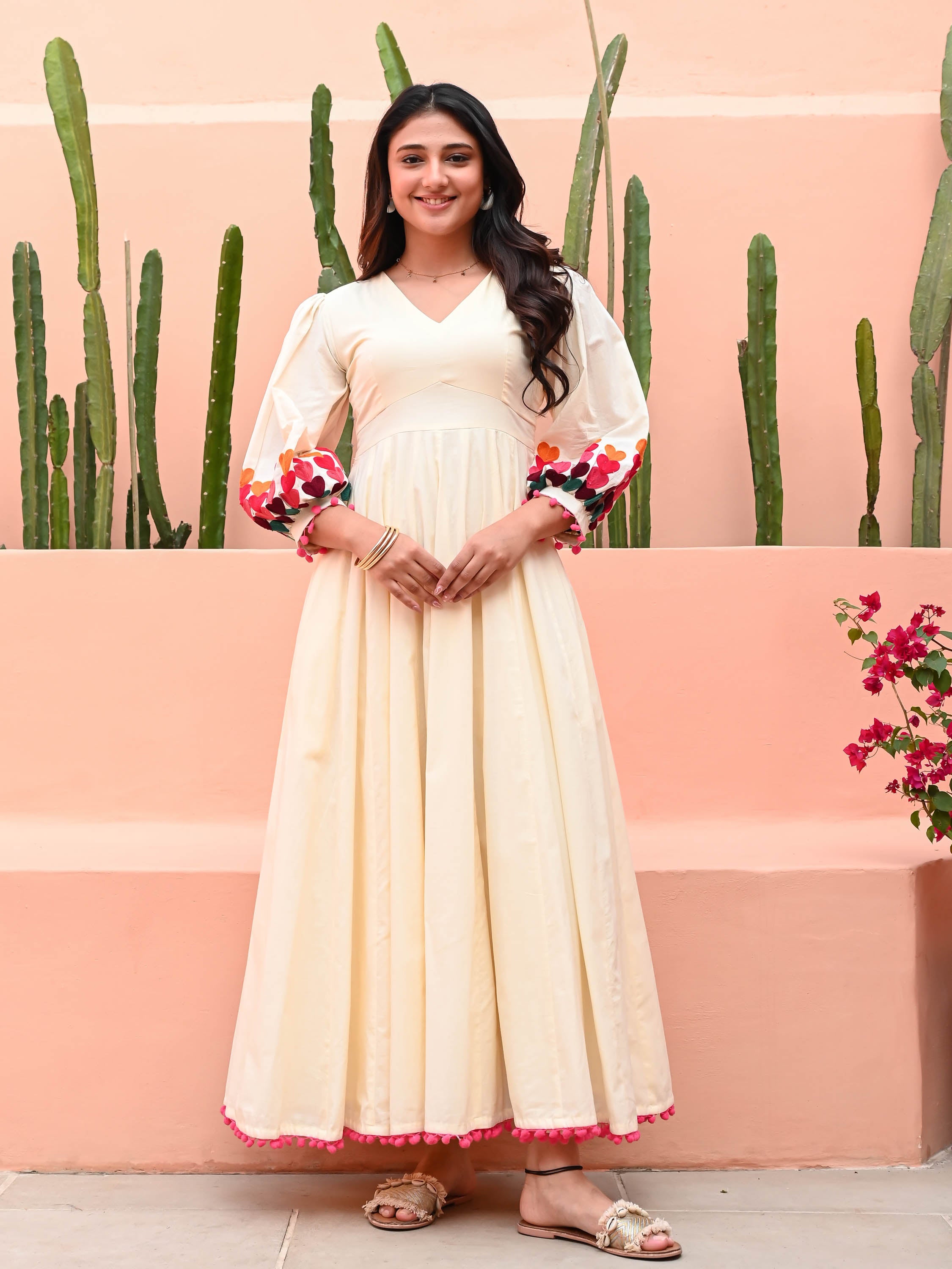 Our Off-white Embroidered Cotton Dress is a charming blend of elegance and playfulness. Made from soft cotton, it features a flattering V-neckline and a flared maxi silhouette with pom-pom lace adorning the hemline. The three-quarter sleeves are delicately embroidered with hearts and finished with matching pom-pom lace, adding a whimsical touch to this timeless piece.
