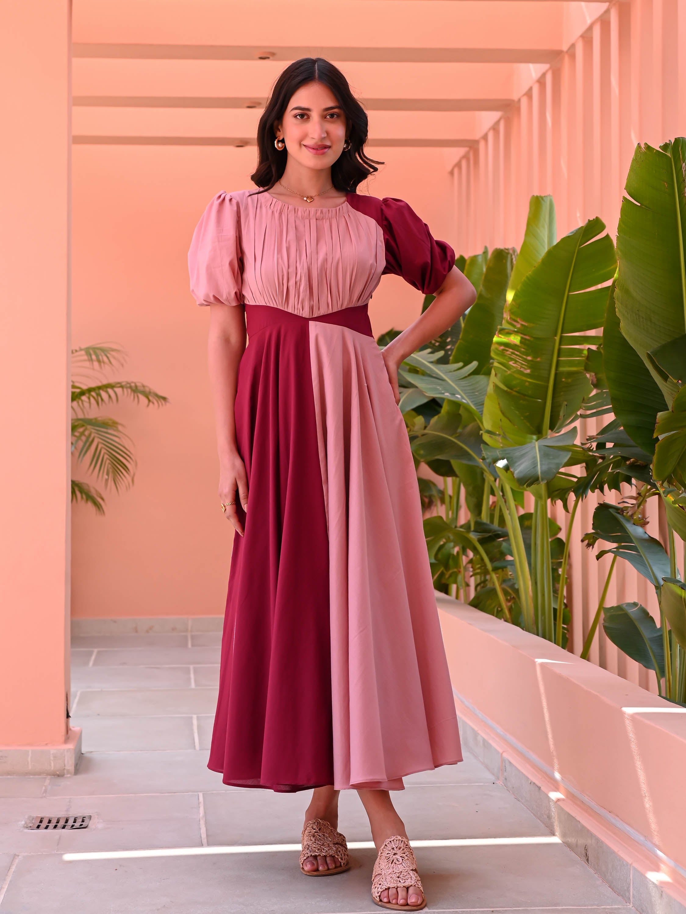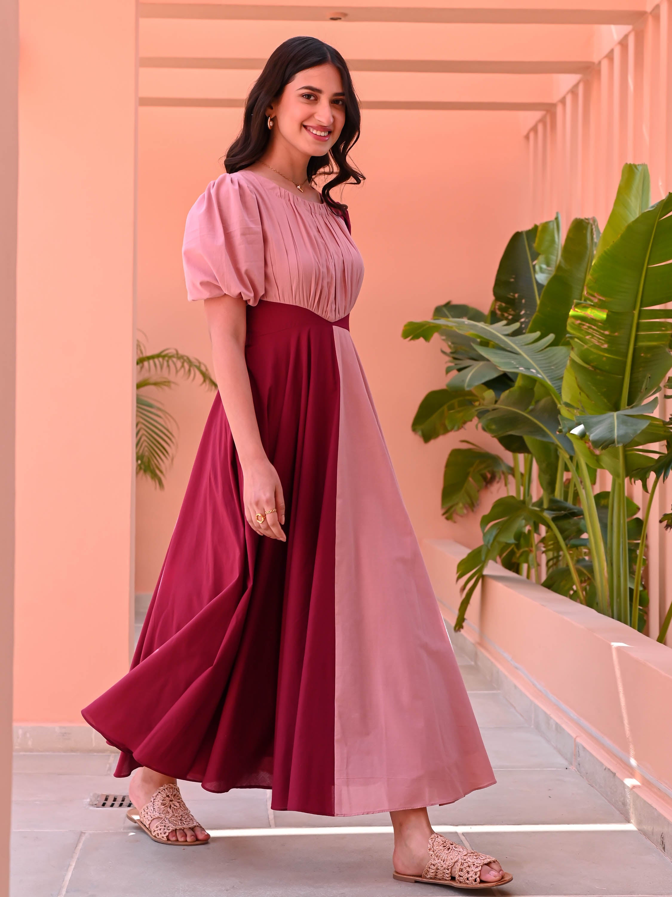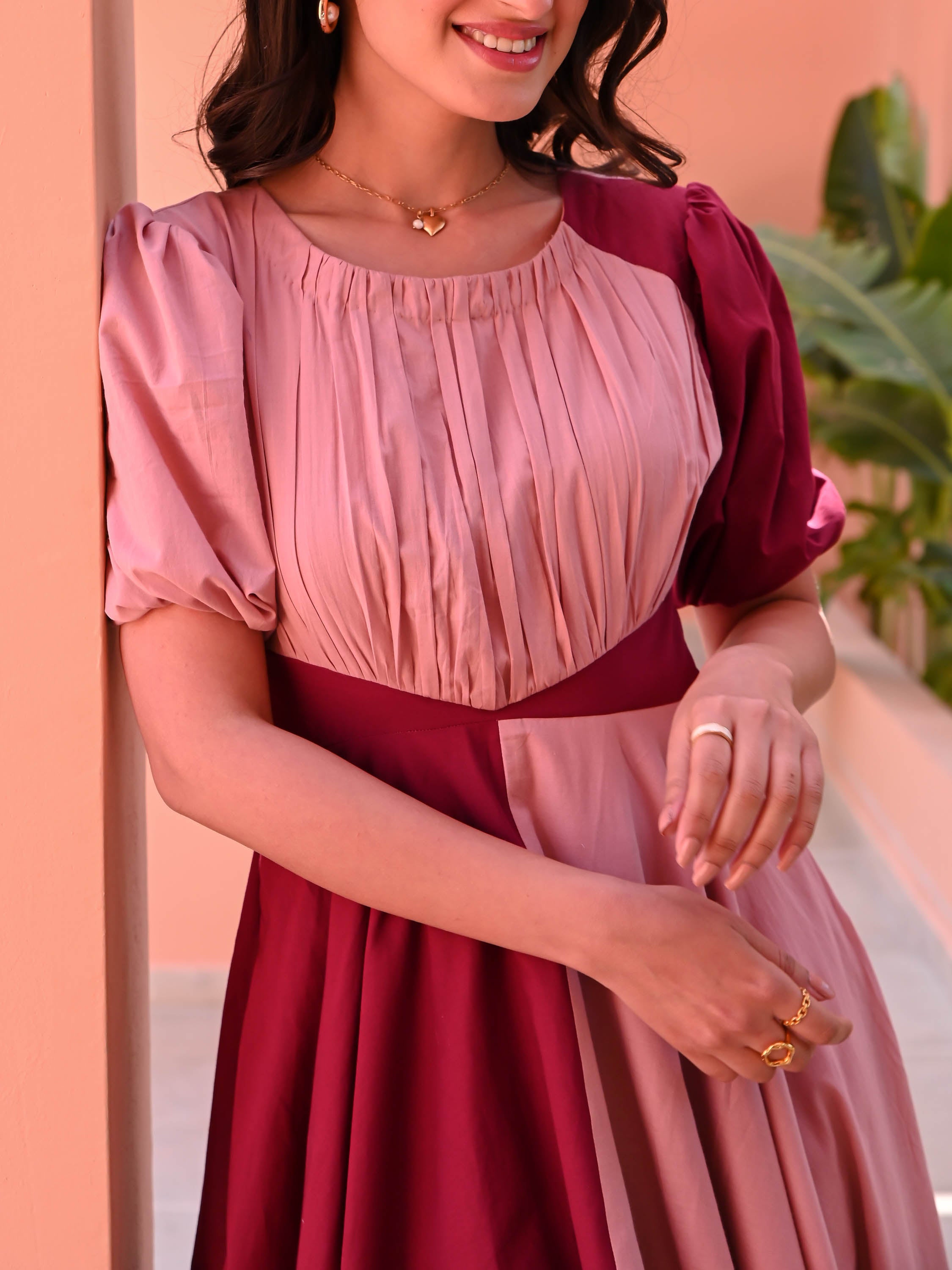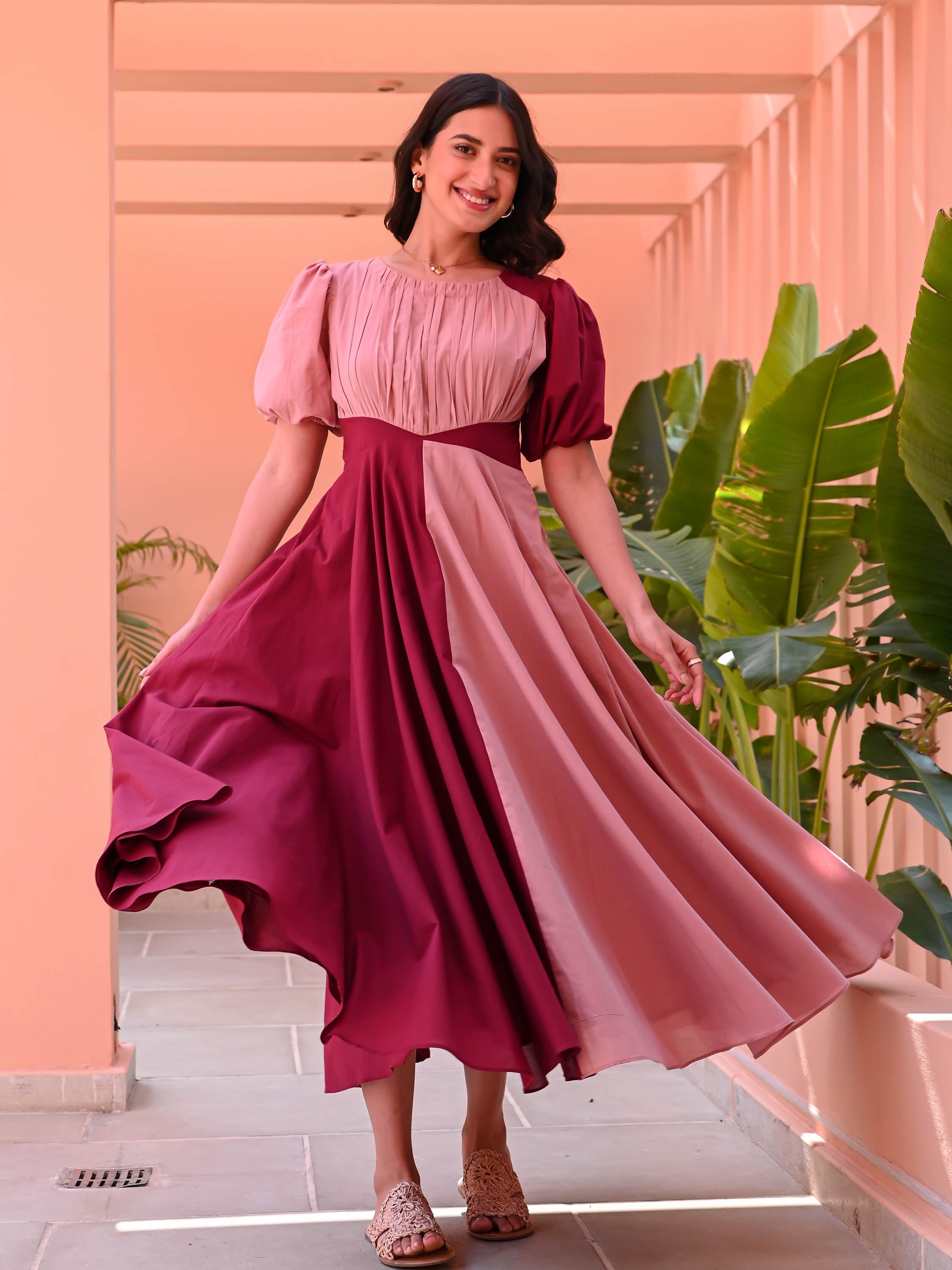 Vibrant hues and effortless style come together in the Peach Tango Cotton Dress. Crafted from breathable plum and peach cotton, this color-blocked beauty features a pleated bodice, short puffed sleeves, and a flowing two-tone full skirt. Perfect for twirling through sunny days, it’s a playful yet elegant addition to your wardrobe.