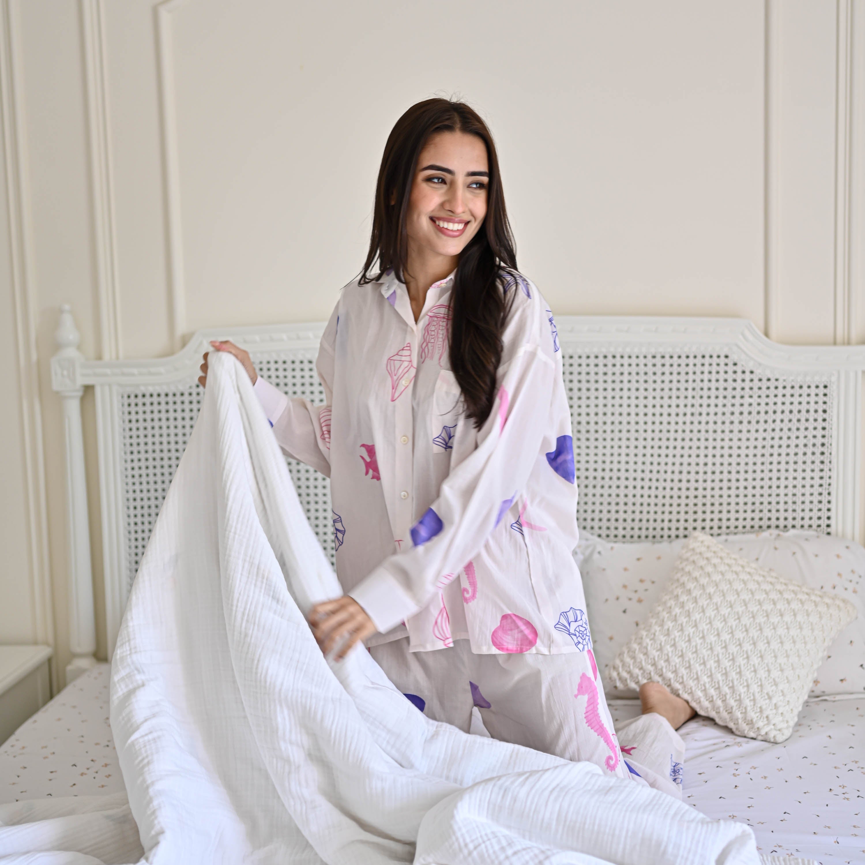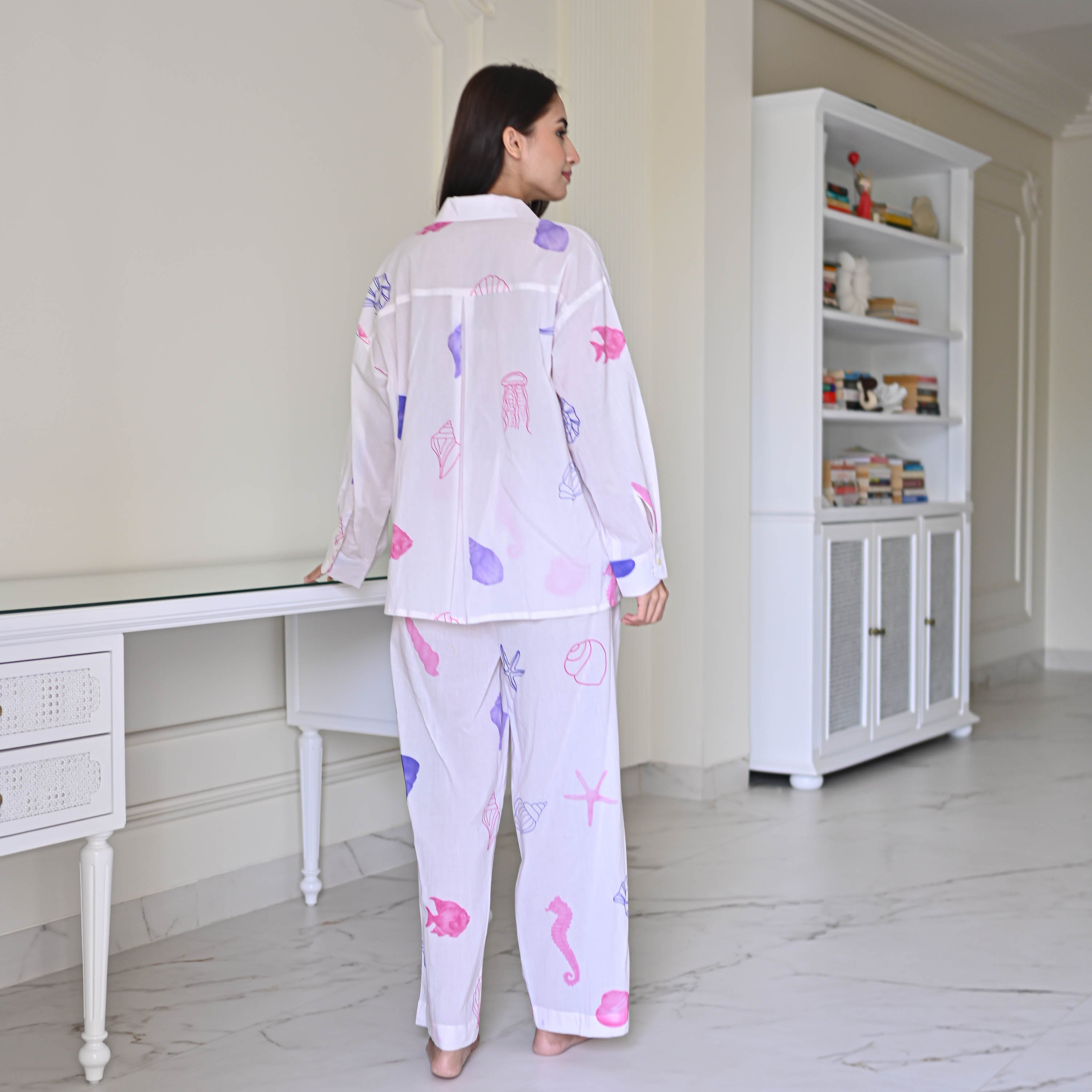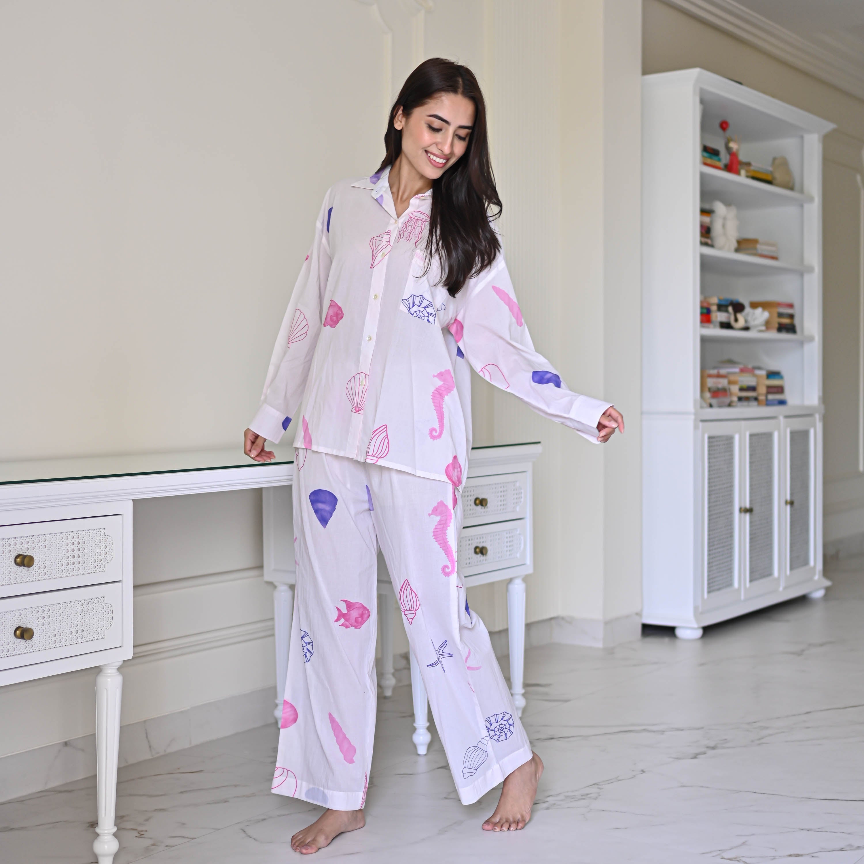 Drift into seaside dreams with our Sea Shell Pyjama Set, crafted from the most luxurious cotton for ultimate comfort. Adorned with enchanting sea shell prints on a whimsical white background, this nightwear set brings beachy vibes to bedtime. The relaxed-fit shirt features full sleeves with cuffs, a button-down front with a classic collar, and a handy pocket. Paired with matching pyjamas, it’s perfect for a stylish and serene night's sleep.