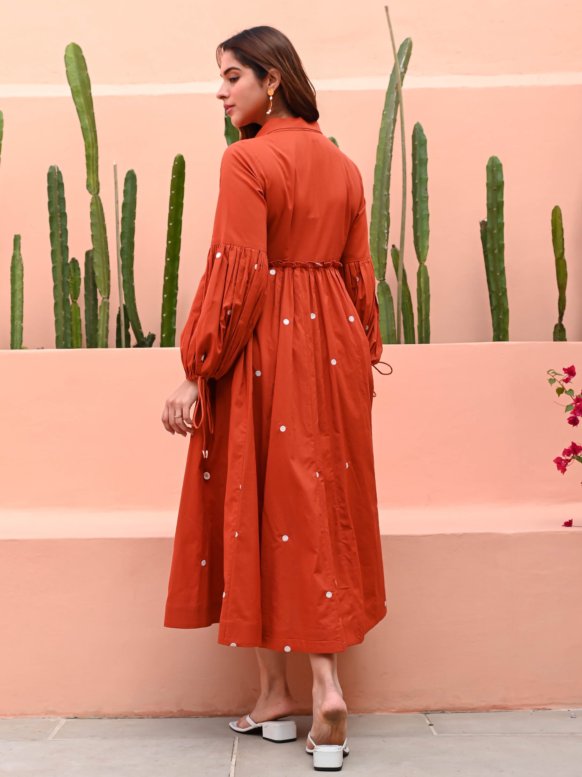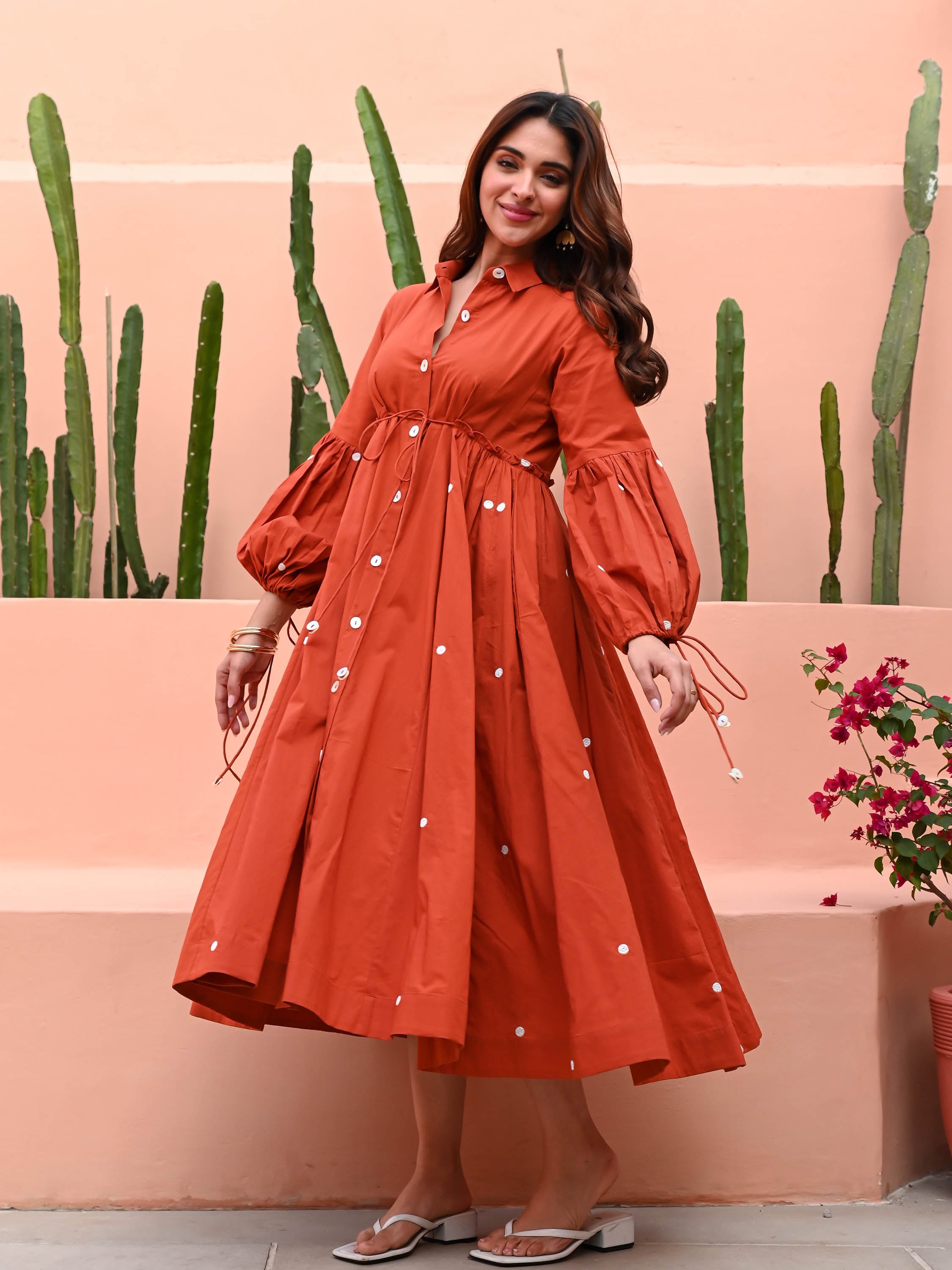 Bold and effortlessly chic, the Spicy Orange Cotton Dress is a statement in rust-orange cotton. This midi shirt dress features intricate placement embroidery throughout, adding artisanal charm. A cinched waist enhances the silhouette, while full puffed sleeves and a button-down front placket complete the look. Perfect for days when style and comfort go hand in hand.