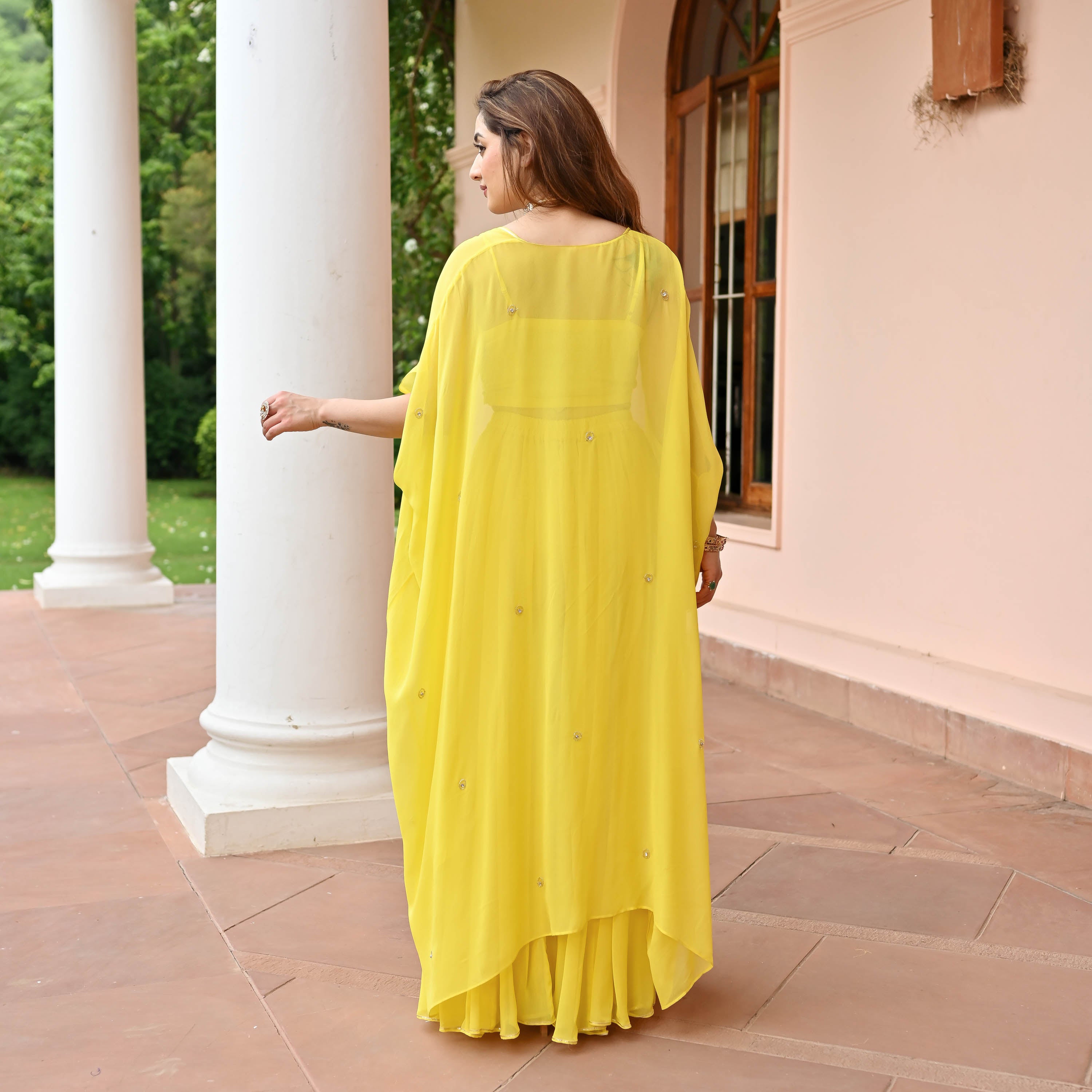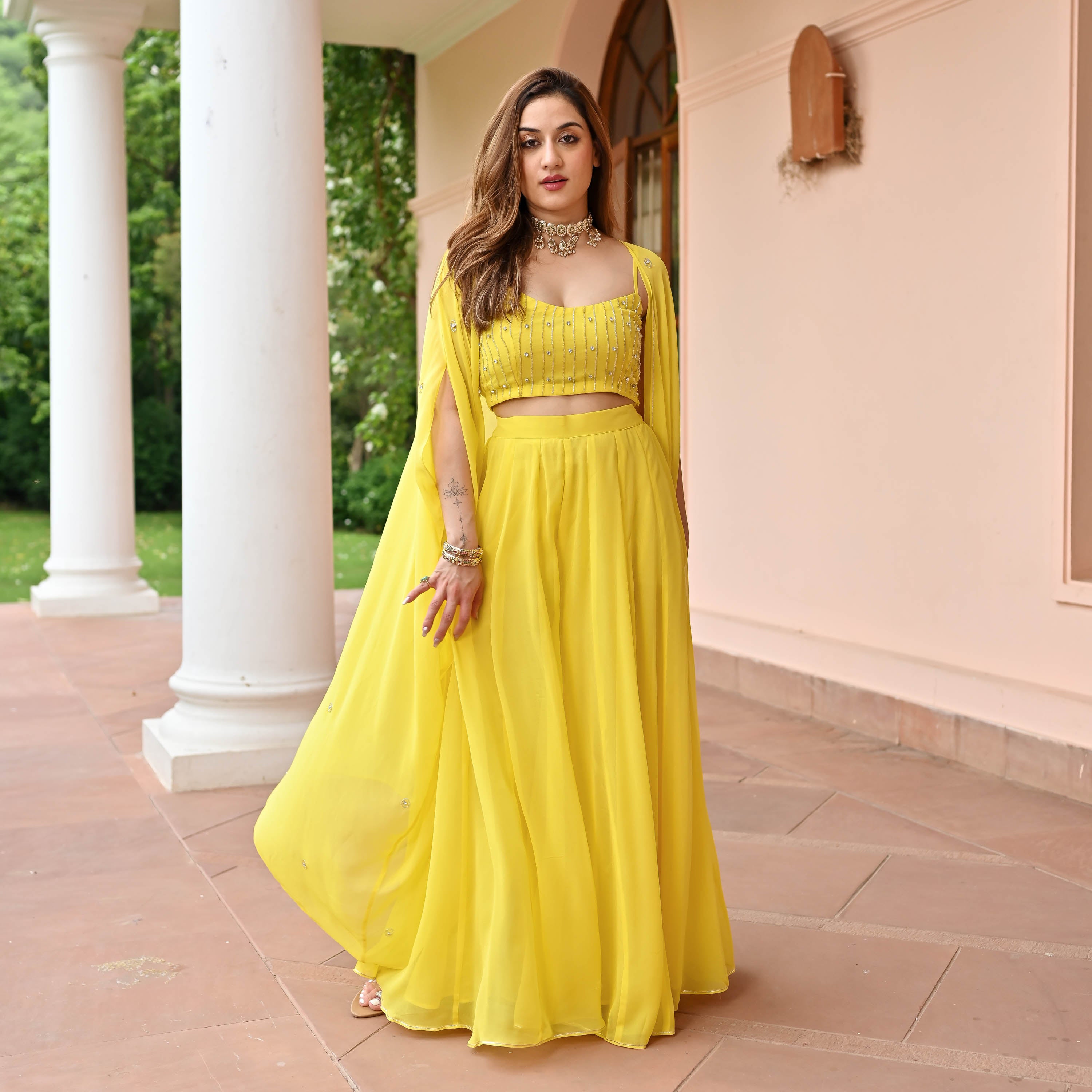 Brighten your wardrobe with the Yellow Timeless Georgette Cape Pants Set. The sunshine yellow hue shines on plush georgette fabric, featuring a dazzling embellished crop top with a scoop neck and strappy sleeves. Paired with elegant palazzo pants and a flowy cape adorned with placement embellishments, this set offers a radiant blend of style and sophistication.
